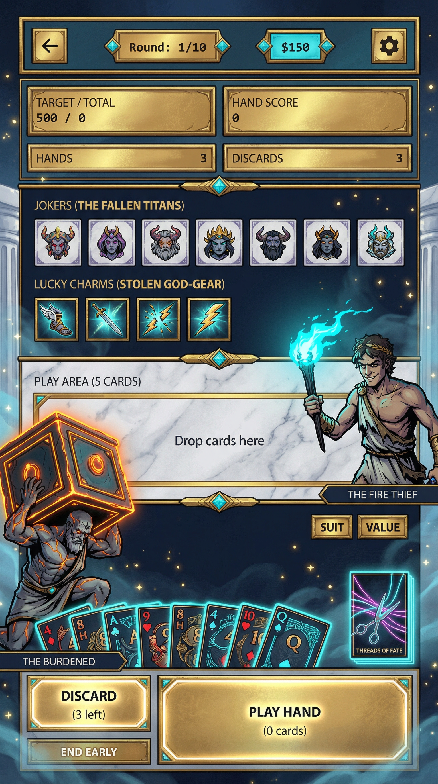 "H2PD - Luminous Chiaroscuro: Hand-painted textures with deep midnight-blue ink shadows (instead of pure black). Sharp, chiseled ink outlines. 2D graphic novel rendering with visible brushstrokes. Lighting: "Bounce Light" physics reflecting gold and cyan onto dark surfaces, "The Vault of Elysian Gold": Palette: Midnight Navy, Polished White Marble, Burnished Olympian Gold, and Ethereal Cyan. Remove all lava/magma. Background: Cinematic celestial ruins, white marble pillars, floating golden sparkles, and translucent blue mist., Strictly respect the reference layout. Gilded Relief: UI panels in aged gold with cyan gem inlays. Interactive buttons glow in bright white-gold for maximum contrast against the cool background. Softened drop shadows with a purple tint to provide depth without "muddying" the screen., Replace 'Jokers' with 'The Fallen Titans': Mythological titans and corrupted gods. Replace 'Lucky Charms' with 'Stolen God-Gear': Iconic divine weapons, broken lightning bolts, and glowing winged sandals. Replace 'Tarot cards' with 'Threads of Fate': Glowing neon strings of destiny being cut by mythic scissors. Replace 'Money' with 'Ambrosia & Drachmas': Ancient gold coins and glowing nectar. Role: Atlas (The Tank / Defense) *Visual: Stylized 2D graphic novel character. A massive, corrupted titan with ash-grey skin and glowing magma cracks along his arms. He is crouched, carrying a colossal, glowing neon-orange underworld vault on his shoulders instead of the world. Heavy black ink outlines, dramatic chiaroscuro shadows, and intense rim lighting. * Name Tag: "THE BURDENED" Role: Prometheus (The Multiplier / Aggressor) * Visual: Stylized 2D high-contrast comic art. A lean, rebellious fallen god holding a charred iron torch that burns with blinding neon-cyan stolen fire. Sharp, angular facial features with a cunning expression. Wearing tattered Olympian robes stained with ash. Deep obsidian black shadows contrasting with the bright blue fire. * Name Tag: "THE FIRE-THIEF", For Purchasable Cards: "Visual Hierarchy: Vertical card orientation divided into three functional zones. Primary Zone (60-70% height): A large, centered rectangular frame dedicated to the character portrait and character name. Rarity: A high-saliency badge or icon placeholder located in the top-right corner, integrated in the main portrait frame. Or different card frame per rarity of the card including integrating the badge. Rarity Color Scheme: Common: Grey. Rare: Blue. Epic: Purple. Legendary: Yellow-Orange, Golden Information Zone (25% height): A dedicated horizontal rectangular container at the bottom for ""Modifier Text"" and ""Effect Description"". Purchase Price. Cost for adquiring the card or pack. Item Type: A Tag that indicated the type of item we are purchasing. Z-Depth: Character portrait must overlap the top edge of its frame to create a pop-out effect." ------"