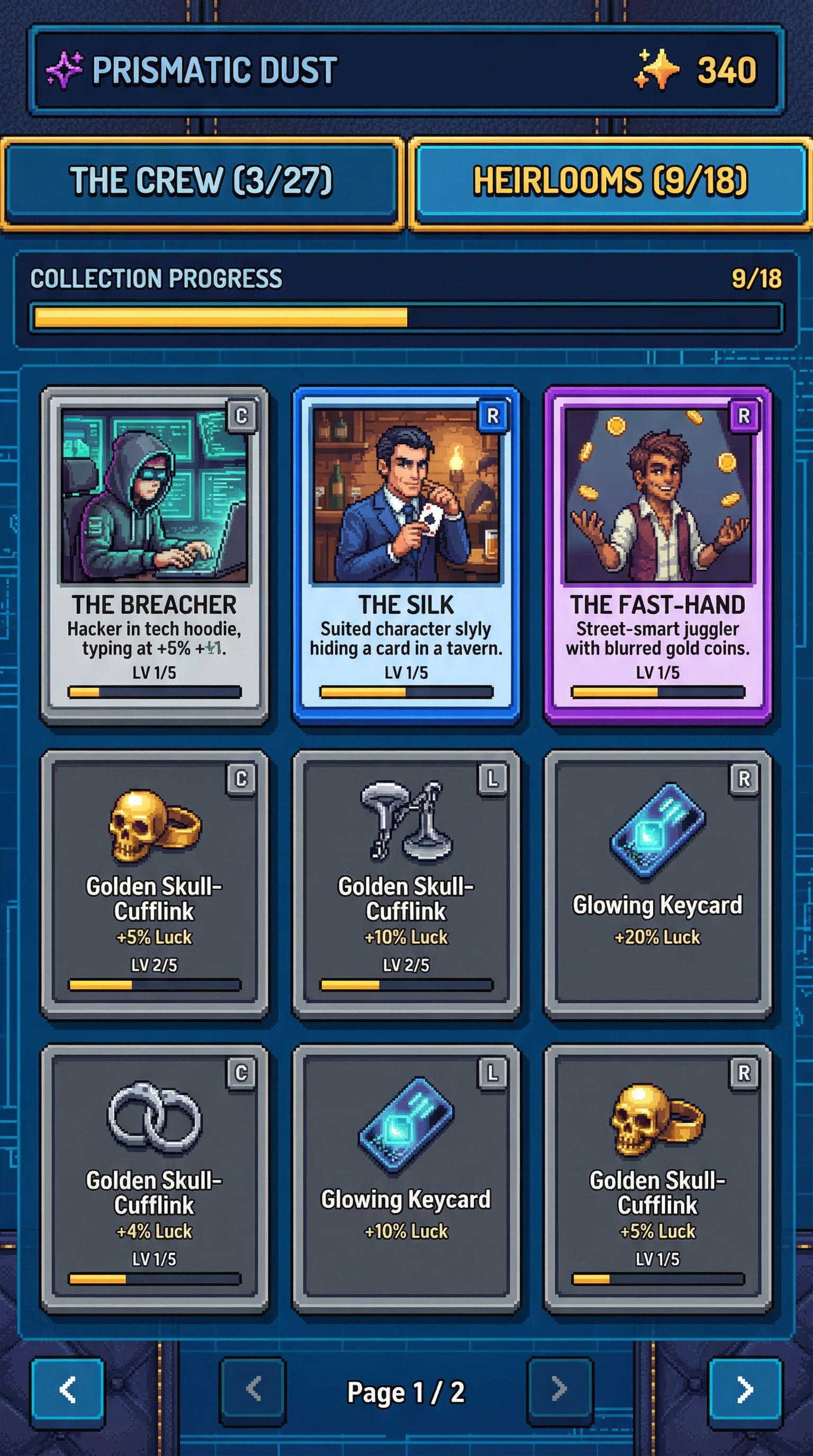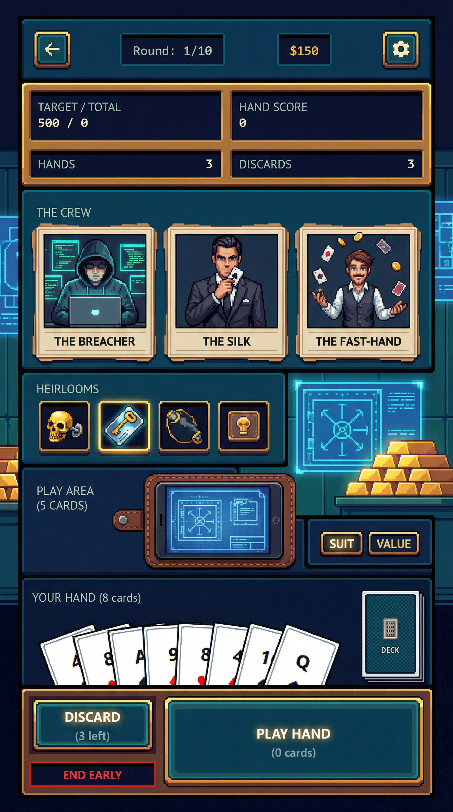 "High-fidelity 16-bit pixel art style with a modern 'Hi-Bit' aesthetic. Techniques: Heavy hand-placed pixel dithering for gradients, deep stylized black ink shadows (pixel-chiaroscuro). Sharp, clean pixel-art outlines (2-pixel width) for all interactive elements to ensure visual pop. 2D rendering with visible square-grid precision but expressive, hand-painted lighting. Dramatic rim highlights using single-pixel lines of bright color. High-contrast lighting between game layers., High-stakes "Casino Underground" heist planning room. Palette: Deep Sapphire Blue and Teal backgrounds, with vibrant Burnished Gold and Amber highlights. Elements: Holographic blueprints of a vault with a magical-tech glow, luxury leather table textures, and stacks of gold bars. Atmosphere: Tense, sophisticated, and "Premium Noir"., Strictly respect the reference layout. UI Panels: Thick beveled frames with high relief (extruded look). Interactive Buttons: Pronounced inner glow and high-saliency color fills to indicate clickability. Depth: Aggressive drop shadows (Z-depth) between all UI layers. Visual Hierarchy: All interactive foreground elements must have 40% more brightness/contrast than the background elements., Replace 'Jokers' with 'The Crew' (stylized hero portraits in dossiers). Replace 'Lucky Charms' with 'Heirlooms' (mythic-modern artifacts like golden skull-cufflinks or glowing keycards). Replace 'Tarot/Planet' with 'Intel/Gadgets' (tablets with glowing hand-painted blueprints). Crew sample members to be used: Rol: The Hacker: Visual: Character with a tech hoodie, illuminated by multiple glowing holographic screens. Hands typing on a virtual interface. Name Tag: "THE BREACHER". Rol: The Grifter: Visual: Sophisticated character in a tailored suit, hiding a card behind their back with a sly smirk. Dim tavern lighting. Name Tag: "THE SILK". Rol: The Hustler: Visual: Street-smart character juggling gold coins or playing cards with blurred motion lines to show speed. Name Tag: "THE FAST-HAND", Visual Hierarchy: Vertical card orientation divided into three functional zones. Primary Zone (60-70% height): A large, centered rectangular frame dedicated to the character portrait and character name. Rarity: A high-saliency badge or icon placeholder located in the top-right corner, integrated in the main portrait frame. Or different card frame per rarity of the card including integrating the badge. Rarity Color Scheme: Common: Grey. Rare: Blue. Epic: Purple. Legendary: Yellow-Orange, Golden Information Zone (25% height): A dedicated horizontal rectangular container at the bottom for "Modifier Text" and "Effect Description". Level Indicator: A minimal, low-saliency circular placeholder in the bottom-right corner of the card. Z-Depth: Character portrait must overlap the top edge of its frame to create a pop-out effect."