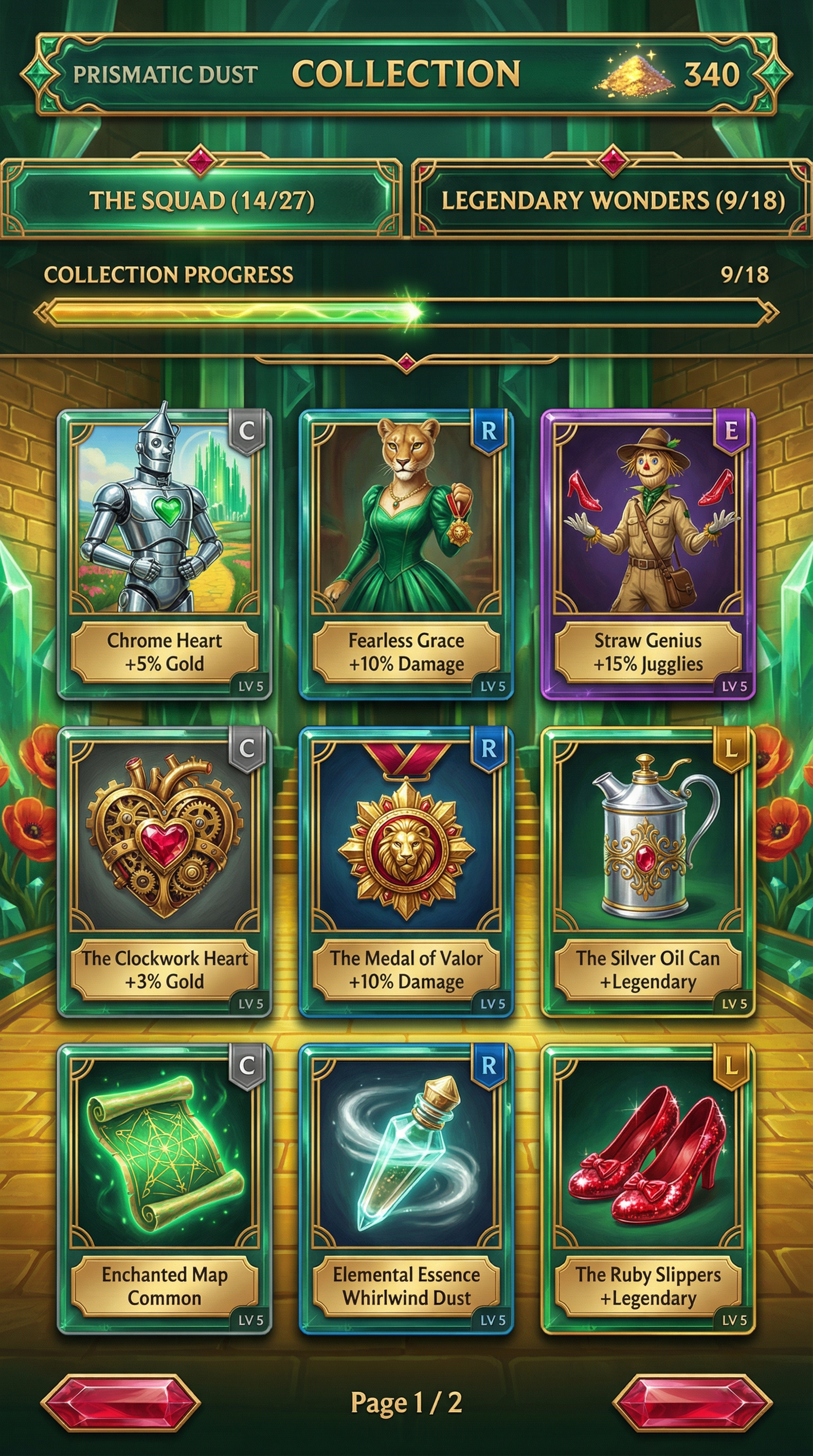 "High-end hand-painted 2D digital art style. Features: Thick, painterly brushstrokes with visible oil-canvas texture. Soft but defined rim lighting. High-saliency 'Chunky' silhouettes. All interactive elements have a hand-drawn 3D depth (embossed) with rich gold or iron filigree outlines. Lighting is warm and atmospheric, with volumetric glows emanating from magical sources., Sophisticated 'Wizard of Oz' reimagining. Palette: 'Emerald City' Green (Primary), 'Yellow Brick' Gold (Highlights), and 'Ruby Slipper' Red (Action/Interactive). Elements: Art-Deco architecture of a green crystal city, golden brick patterns, and poppy flower motifs. Atmosphere: Elegant, whimsical, and mysterious., Strictly respect the reference layout. UI Panels: Thin, elegant frames made of polished emerald glass and gold trim. Interactive Buttons: Rectangular Ruby-colored crystals with a clean internal glow. Depth: Subtle Z-depth using clean drop shadows. Visual Hierarchy: All cards have a 'Soft Emerald Bloom' 40% brighter than the table to indicate focus., Replace 'Jokers' with 'THE SQUAD': Heroic character portraits of the Travelers reimagined as elite specialists (The Tin Commando, The Cowardly Lioness, The Scarecrow Scout). Portraits must be encased in thin, elegant emerald-glass frames with gold art-deco corners. Replace 'Lucky Charms' with 'LEGENDARY WONDERS': High-value physical artifacts from Oz, designed as luxury jewelry or magical tech. Key items: 'The Clockwork Heart', 'The Medal of Valor', and 'The Silver Oil Can'. Must feature clean metallic reflections and ruby-gemstone accents. Replace 'Tarot Cards' with 'ENCHANTED MAPS': Glowing green parchment scrolls showing secret routes to the Emerald City. Use clean lines and 'Arcane-style' magical gold ink for the diagrams. Replace 'Planet Cards' with 'ELEMENTAL ESSENCES': Crystal vials filled with 'Whirlwind Dust', 'Poppy Sleep', or 'Liquid Emerald'. The glass must look polished and translucent with soft inner glows. Replace 'Hands/Score' with 'HEIST PROGRESSION': UI Typography should use a clean, modern serif font with gold gradients. 'Mega Win' becomes 'BANK BREACHED'. Visual Instruction: Ensure all replaced assets follow the 'Modern Graphic' style: no heavy painterly textures, sharp outlines, and 40% higher contrast on interactive items. The Squad sample members to be used: Rol: Chrome Heart: Visual: Modern stylized illustration of a sleek, polished Tin Man. Not rusty, but chrome-like steel. A glowing green heart visible through a glass chest plate. Sharp outlines, clean reflections of the Emerald City on his armor. Rol: Fearless Grace: Visual: Elegant anthropomorphic lioness in a high-fashion emerald silk gown. She holds a gold-and-ruby medal as if it were a high-stakes poker chip. Soft fur rendering, sharp facial features, clean lighting. Rol: Straw Genius: Visual: Lean, agile Scarecrow dressed in a stylized explorer's outfit with burlap textures rendered as clean vector patterns. Juggling three glowing ruby heels with elegant trail lines. Dynamic pose, high-contrast gold lighting.., For Purchasable Cards: "Visual Hierarchy: Vertical card orientation divided into three functional zones. Primary Zone (60-70% height): A large, centered rectangular frame dedicated to the character portrait and character name. Rarity: A high-saliency badge or icon placeholder located in the top-right corner, integrated in the main portrait frame. Or different card frame per rarity of the card including integrating the badge. Rarity Color Scheme: Common: Grey. Rare: Blue. Epic: Purple. Legendary: Yellow-Orange, Golden Information Zone (25% height): A dedicated horizontal rectangular container at the bottom for ""Modifier Text"" and ""Effect Description"". Purchase Price. Cost for adquiring the card or pack. Item Type: A Tag that indicated the type of item we are purchasing. Z-Depth: Character portrait must overlap the top edge of its frame to create a pop-out effect." ------"