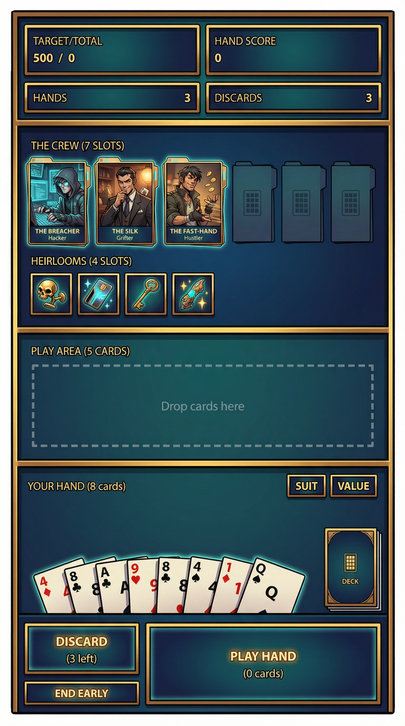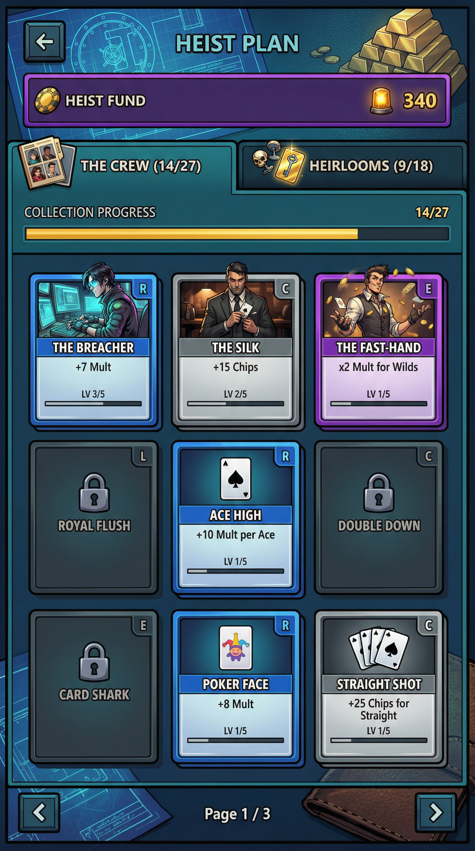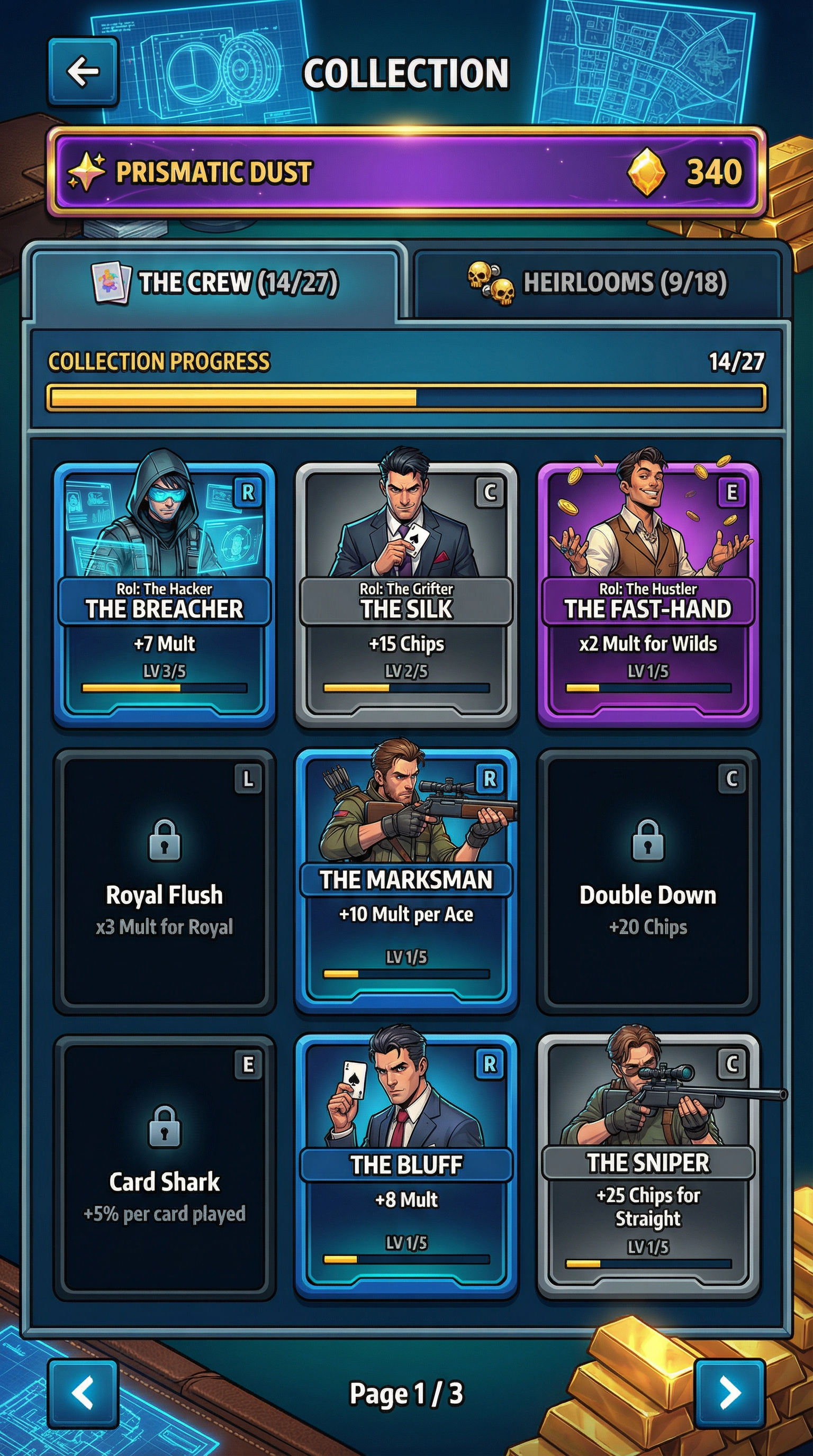 "Modern 'Amerimanga' comic book illustration style, strongly inspired by Joe Madureira and Battle Chasers. Features: Clean, thick, and fluid black ink outlines with dynamic line weight. Strictly NO messy cross-hatching or gritty comic textures. Rendering: Vibrant, smooth 2D cel-shaded coloring with soft, glowing rim-lighting. Design Language: 'Chunky' and exaggerated proportions. High-saliency, stylized geometric forms. Clean flat 2D comic aesthetic without hyper-realistic textures., High-stakes "Casino Underground" heist planning room. Palette: Deep Sapphire Blue and Teal backgrounds, with vibrant Burnished Gold and Amber highlights. Elements: Holographic blueprints of a vault with a magical-tech glow, luxury leather table textures, and stacks of gold bars. Atmosphere: Tense, sophisticated, and "Premium Noir"., Strictly respect the reference layout. UI Panels: Thick beveled frames with high relief (extruded look). Interactive Buttons: Pronounced inner glow and high-saliency color fills to indicate clickability. Depth: Aggressive drop shadows (Z-depth) between all UI layers. Visual Hierarchy: All interactive foreground elements must have 40% more brightness/contrast than the background elements., Replace 'Jokers' with 'The Crew' (stylized hero portraits in dossiers). Replace 'Lucky Charms' with 'Heirlooms' (mythic-modern artifacts like golden skull-cufflinks or glowing keycards). Replace 'Tarot/Planet' with 'Intel/Gadgets' (tablets with glowing hand-painted blueprints). Crew sample members to be used: Rol: The Hacker: Visual: Character with a tech hoodie, illuminated by multiple glowing holographic screens. Hands typing on a virtual interface. Name Tag: "THE BREACHER". Rol: The Grifter: Visual: Sophisticated character in a tailored suit, hiding a card behind their back with a sly smirk. Dim tavern lighting. Name Tag: "THE SILK". Rol: The Hustler: Visual: Street-smart character juggling gold coins or playing cards with blurred motion lines to show speed. Name Tag: "THE FAST-HAND", "Visual Hierarchy: Vertical card orientation divided into three functional zones. Primary Zone (60-70% height): A large, centered rectangular frame dedicated to the character portrait and character name. Rarity: A high-saliency badge or icon placeholder located in the top-right corner, integrated in the main portrait frame. Or different card frame per rarity of the card including integrating the badge. Rarity Color Scheme: Common: Grey. Rare: Blue. Epic: Purple. Legendary: Yellow-Orange, Golden Information Zone (25% height): A dedicated horizontal rectangular container at the bottom for ""Modifier Text"" and ""Effect Description"". Level Indicator: A minimal, low-saliency circular placeholder in the bottom-right corner of the card. Z-Depth: Character portrait must overlap the top edge of its frame to create a pop-out effect.""