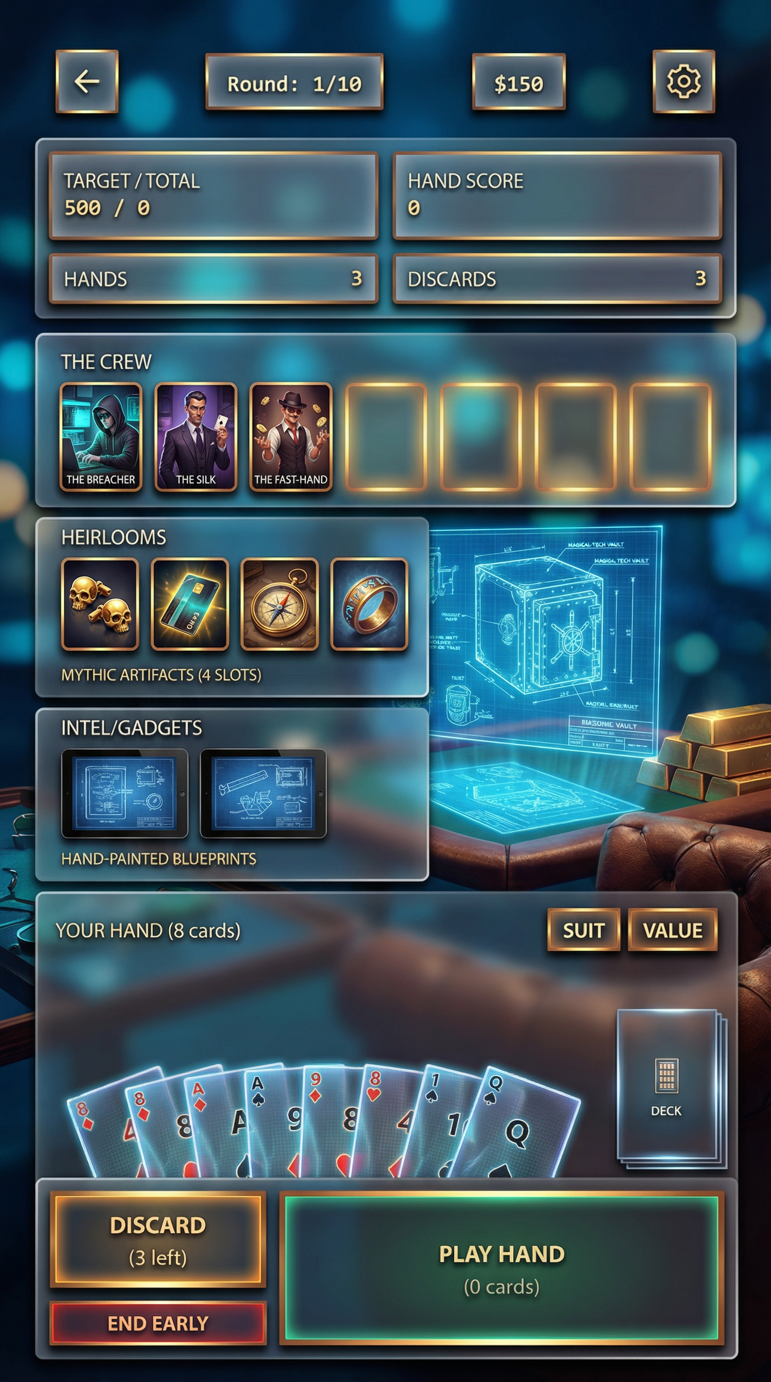 "Multi-layered frosted glass materials with high-fidelity background blur (bokeh) and subtle chromatic aberration. Sleek, translucent 3D panels with razor-thin, glowing neon or metallic rim highlights. High-end modern rendering. Refined, structural silhouette definition optimized for premium holographic playing cards and sophisticated UI overlays., High-stakes "Casino Underground" heist planning room. Palette: Deep Sapphire Blue and Teal backgrounds, with vibrant Burnished Gold and Amber highlights. Elements: Holographic blueprints of a vault with a magical-tech glow, luxury leather table textures, and stacks of gold bars. Atmosphere: Tense, sophisticated, and "Premium Noir"., Strictly respect the reference layout. UI Panels: Thick beveled frames with high relief (extruded look). Interactive Buttons: Pronounced inner glow and high-saliency color fills to indicate clickability. Depth: Aggressive drop shadows (Z-depth) between all UI layers. Visual Hierarchy: All interactive foreground elements must have 40% more brightness/contrast than the background elements., "Replace 'Jokers' with 'The Crew' (stylized hero portraits in dossiers). Replace 'Lucky Charms' with 'Heirlooms' (mythic-modern artifacts like golden skull-cufflinks or glowing keycards). Replace 'Tarot/Planet' with 'Intel/Gadgets' (tablets with glowing hand-painted blueprints). Crew sample members to be used: Rol: The Hacker: Visual: Character with a tech hoodie, illuminated by multiple glowing holographic screens. Hands typing on a virtual interface. Name Tag: ""THE BREACHER"". Rol: The Grifter: Visual: Sophisticated character in a tailored suit, hiding a card behind their back with a sly smirk. Dim tavern lighting. Name Tag: ""THE SILK"". Rol: The Hustler: Visual: Street-smart character juggling gold coins or playing cards with blurred motion lines to show speed. Name Tag: ""THE FAST-HAND""""