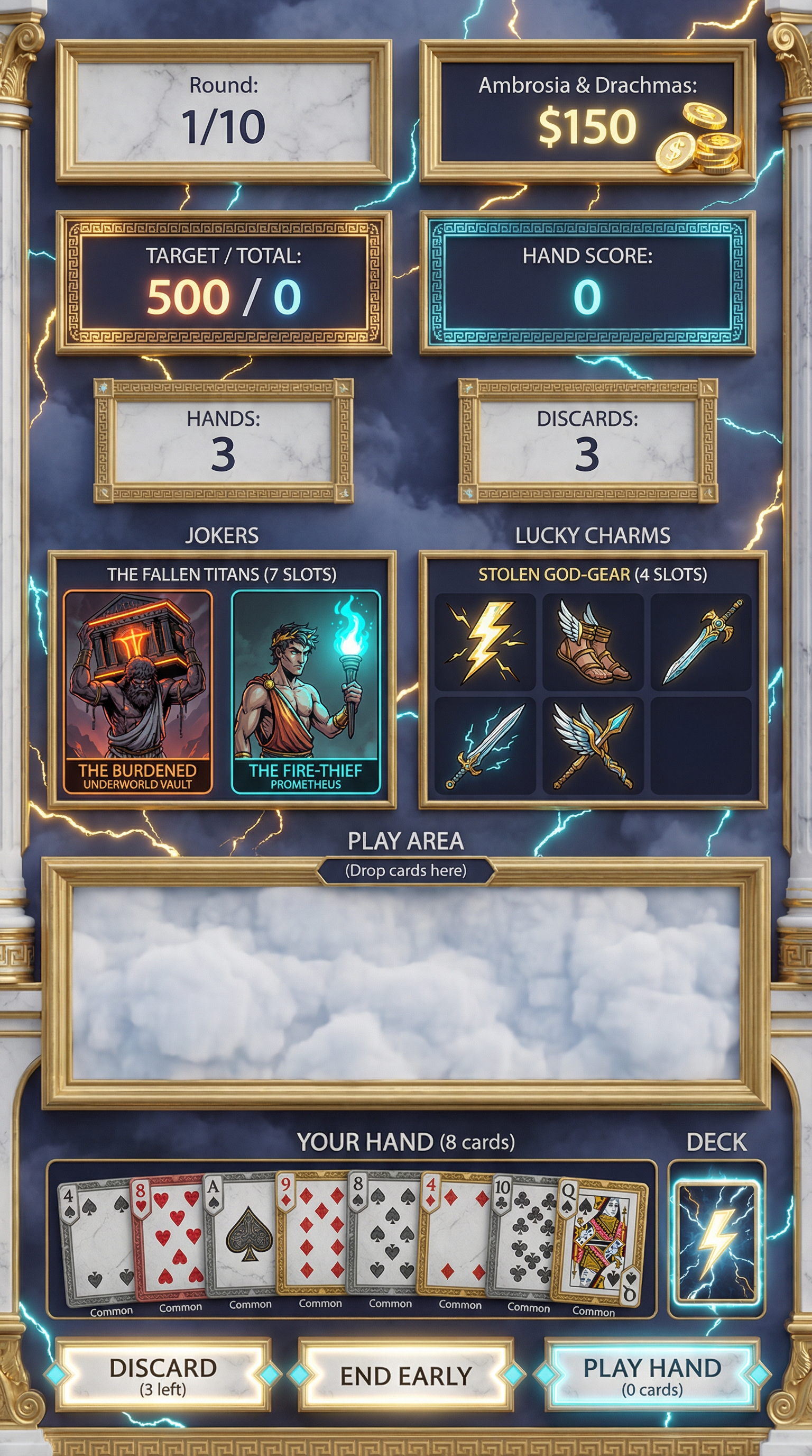 "Multi-layered frosted glass materials with high-fidelity background blur (bokeh) and subtle chromatic aberration. Sleek, translucent 3D panels with razor-thin, glowing neon or metallic rim highlights. High-end modern rendering. Refined, structural silhouette definition optimized for premium holographic playing cards and sophisticated UI overlays., Massive celestial vault hidden deep within Mount Olympus. Palette: Ethereal Marble White and Cloudy Indigo backgrounds, accented with crackling Divine Gold and Electric Cyan. Elements: Colossal stone pillars, floating constellations, a grand poker table made of solid clouds, and glowing lightning-forged playing cards. Atmosphere: Epic, mythological, and "Divine Rebellion"., Gilded Architectural Relief. Strictly respect the reference layout. UI Panels: Thick golden frames with intricate filigree and ancient Greek engravings (meander patterns). Use multi-tiered beveling for an extruded, 3D layered look. Buttons: Intense white-gold inner glow with high-saliency cyan accents. Depth: Layered Z-depth with soft purple-tinted shadows to separate the UI from the marble background. Card Frames: Implement an Ornamental Progression Ladder. - Common (Grey): Sleek, minimalist stone-etched bevels with single-line ink borders. - Rare (Blue): Intricate silver-inlaid filigree and double-tiered architectural depth. - Epic (Purple): - Legendary (Gold): Maximalist 'Divine Gold' relief with lion-head carvings and winged motifs that break the rectangular silhouette (protruding elements). Dynamic Rule: Frame complexity, material richness, and gold-leaf density must scale linearly with card rarity., Replace 'Jokers' concept with 'The Fallen Titans': Mythological titans and corrupted gods. Replace 'Lucky Charms' with 'Stolen God-Gear': Iconic divine weapons, broken lightning bolts, and glowing winged sandals. Replace 'Tarot cards' with 'Threads of Fate': Glowing neon strings of destiny being cut by mythic scissors. Replace 'Money' with 'Ambrosia & Drachmas': Ancient gold coins and glowing nectar. Sample Fallen Titans to be used: Role: Atlas (The Tank / Defense) *Visual: Stylized 2D graphic novel character. A massive, corrupted titan with ash-grey skin and glowing magma cracks along his arms. He is crouched, carrying a colossal, glowing neon-orange underworld vault on his shoulders instead of the world. Heavy black ink outlines, dramatic chiaroscuro shadows, and intense rim lighting. * Name Tag: "THE BURDENED" Role: Prometheus (The Multiplier / Aggressor) * Visual: Stylized 2D high-contrast comic art. A lean, rebellious fallen god holding a charred iron torch that burns with blinding neon-cyan stolen fire. Sharp, angular facial features with a cunning expression. Wearing tattered Olympian robes stained with ash. Deep obsidian black shadows contrasting with the bright blue fire. * Name Tag: "THE FIRE-THIEF""