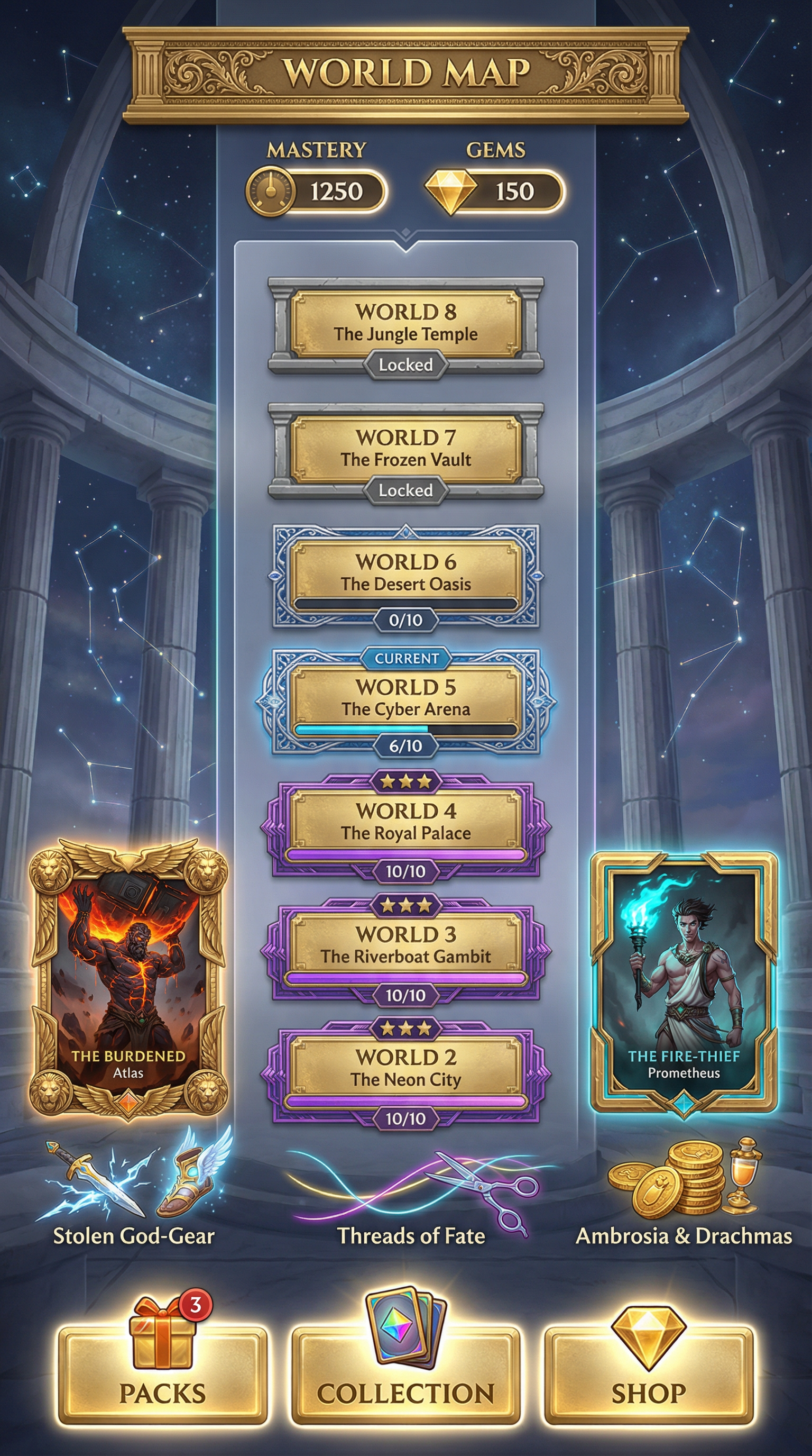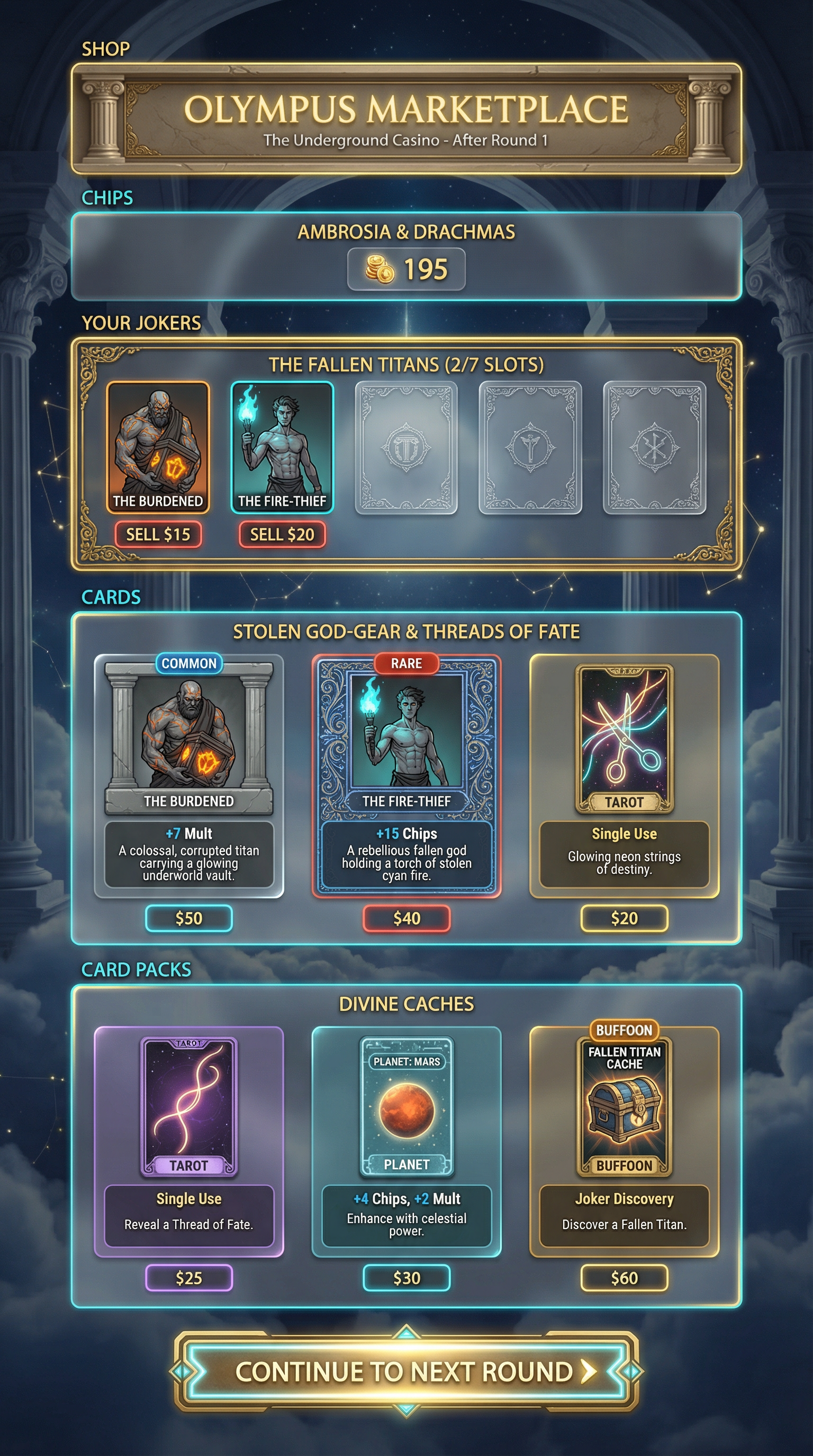 "Multi-layered frosted glass materials with high-fidelity background blur (bokeh) and subtle chromatic aberration. Sleek, translucent 3D panels with razor-thin, glowing neon or metallic rim highlights. High-end modern rendering. Refined, structural silhouette definition optimized for premium holographic playing cards and sophisticated UI overlays., Massive celestial vault hidden deep within Mount Olympus. Palette: Ethereal Marble White and Cloudy Indigo backgrounds, accented with crackling Divine Gold and Electric Cyan. Elements: Colossal stone pillars, floating constellations, a grand poker table made of solid clouds, and glowing lightning-forged playing cards. Atmosphere: Epic, mythological, and "Divine Rebellion"., Gilded Architectural Relief. Strictly respect the reference layout. UI Panels: Thick golden frames with intricate filigree and ancient Greek engravings (meander patterns). Use multi-tiered beveling for an extruded, 3D layered look. Buttons: Intense white-gold inner glow with high-saliency cyan accents. Depth: Layered Z-depth with soft purple-tinted shadows to separate the UI from the marble background. Card Frames: Implement an Ornamental Progression Ladder. - Common (Grey): Sleek, minimalist stone-etched bevels with single-line ink borders. - Rare (Blue): Intricate silver-inlaid filigree and double-tiered architectural depth. - Epic (Purple): - Legendary (Gold): Maximalist 'Divine Gold' relief with lion-head carvings and winged motifs that break the rectangular silhouette (protruding elements). Dynamic Rule: Frame complexity, material richness, and gold-leaf density must scale linearly with card rarity., Replace 'Jokers' concept with 'The Fallen Titans': Mythological titans and corrupted gods. Replace 'Lucky Charms' with 'Stolen God-Gear': Iconic divine weapons, broken lightning bolts, and glowing winged sandals. Replace 'Tarot cards' with 'Threads of Fate': Glowing neon strings of destiny being cut by mythic scissors. Replace 'Money' with 'Ambrosia & Drachmas': Ancient gold coins and glowing nectar. Sample Fallen Titans to be used: Role: Atlas (The Tank / Defense) *Visual: Stylized 2D graphic novel character. A massive, corrupted titan with ash-grey skin and glowing magma cracks along his arms. He is crouched, carrying a colossal, glowing neon-orange underworld vault on his shoulders instead of the world. Heavy black ink outlines, dramatic chiaroscuro shadows, and intense rim lighting. * Name Tag: "THE BURDENED" Role: Prometheus (The Multiplier / Aggressor) * Visual: Stylized 2D high-contrast comic art. A lean, rebellious fallen god holding a charred iron torch that burns with blinding neon-cyan stolen fire. Sharp, angular facial features with a cunning expression. Wearing tattered Olympian robes stained with ash. Deep obsidian black shadows contrasting with the bright blue fire. * Name Tag: "THE FIRE-THIEF", For Purchasable Cards: "Visual Hierarchy: Vertical card orientation divided into three functional zones. Primary Zone (60-70% height): A large, centered rectangular frame dedicated to the character portrait and character name. Rarity: A high-saliency badge or icon placeholder located in the top-right corner, integrated in the main portrait frame. Or different card frame per rarity of the card including integrating the badge. Rarity Color Scheme: Common: Grey. Rare: Blue. Epic: Purple. Legendary: Yellow-Orange, Golden Information Zone (25% height): A dedicated horizontal rectangular container at the bottom for ""Modifier Text"" and ""Effect Description"". Purchase Price. Cost for adquiring the card or pack. Item Type: A Tag that indicated the type of item we are purchasing. Z-Depth: Character portrait must overlap the top edge of its frame to create a pop-out effect." ------"