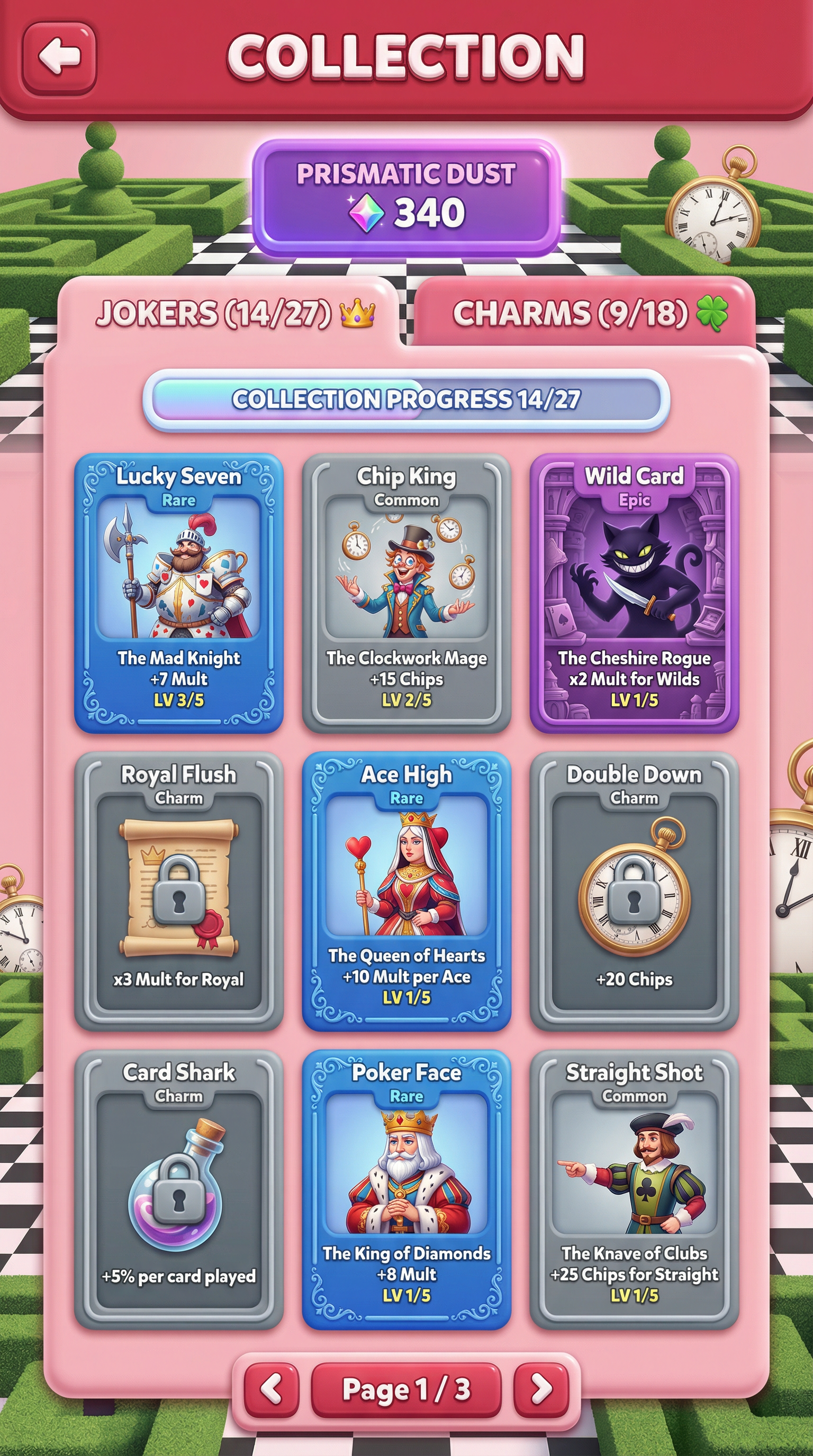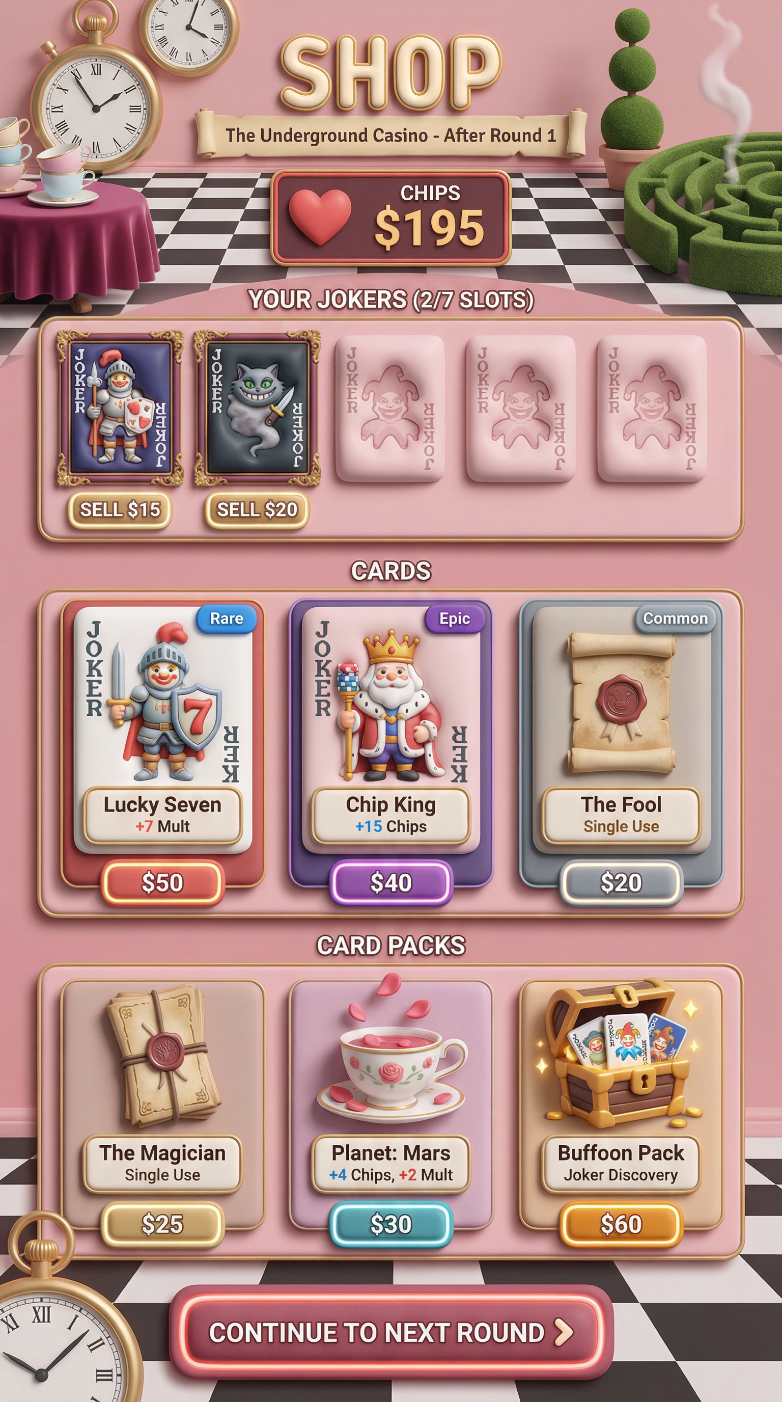 "Ultra-smooth matte silicone and soft polymer materials with tactile, gummy-like volumetric forms. Seamless, rounded bevels and thick, pillowy edges. 3D-simulated rendering using soft inner shadows, bright specular core highlights, and vibrant radial gradients. Flawless, bouncy silhouette definition tailored for playful card surfaces and squishy UI panels., Whimsical, slightly surreal royal garden where playing cards come to life. Palette: Pastel Rose Pink and Checkerboard Black-and-White backgrounds, popping with vibrant Royal Heart Red and Tea-Stained Gold. Elements: Manicured topiary mazes, oversized ticking pocket watches, teacups stacked precariously on velvet-draped tables, and royal guards with literal playing-card bodies wielding spear-tipped halberds. Atmosphere: Dreamlike, eccentric, and "Whimsical Nonsense"., "[UI/UX LAYOUT] - Core Structure: Strictly respect the reference layout. UI Panels: Thick beveled frames with high relief (extruded 3D look). - Interactions: Interactive Buttons require a pronounced inner glow and high-saliency color fills to indicate clickability. - Depth & Hierarchy: Aggressive drop shadows (Z-depth) between all UI layers. Active foreground elements must have 40% more brightness/contrast than background elements. [CARD PROGRESSION MATRIX] Implement an Ornamental Progression Ladder based on card rarity, using the materials defined in the Theme: - Common: Base material of the theme. Minimalist bevels, clean and flat structural borders. No protruding elements. - Rare: Refined theme material. Intricate thematic filigree or patterns, double-tiered UI depth. - Epic: Premium or glowing theme material. Complex architectural relief incorporating small thematic objects embedded in the corners. - Legendary: Maximalist premium material. Heavy thematic motifs that physically break the rectangular silhouette (protruding 3D elements extending past the card borders). - Dynamic Rule: Frame complexity, material richness, and visual weight must scale linearly with card rarity.", "[CONCEPT MAPPING] - Jokers -> THE ROYAL COURT: Whimsical champions and eccentric heroes inspired by Alice in Wonderland characters. Encased in ornate, heavy royal frames. - Lucky Charms -> WONDERLAND RELICS: Physical, tangible artifacts (Oversized pocket watches, glass vials with liquid, ornate crown jewels). - Tarot -> ROYAL DECREES: Weathered parchment scrolls closed with heavy wax seals. - Planet -> MAGIC TEACUPS: Porcelain teacups overflowing with liquids and floating rose petals. [THE COURT - SAMPLE MEMBERS] 1. THE MAD KNIGHT (The Tank): Massive, eccentric knight wearing heavy armor crafted from oversized teacups and thick playing cards. Wielding a giant spear-tipped halberd. Imposing, defensive posture. 2. THE CHESHIRE ROGUE (The Assassin): Agile, shadowy figure partially fading into smoke with a wide, exaggerated grin. Holding a curved dagger. Stealthy, mysterious posture. 3. THE CLOCKWORK MAGE (The Strategist): Eccentric caster in a tattered top-hat, juggling floating pocket watches with chaotic energy trails around them. Calculating, intelligent posture.", For Purchasable Cards: "Visual Hierarchy: Vertical card orientation divided into three functional zones. Primary Zone (60-70% height): A large, centered rectangular frame dedicated to the character portrait and character name. Rarity: A high-saliency badge or icon placeholder located in the top-right corner, integrated in the main portrait frame. Or different card frame per rarity of the card including integrating the badge. Rarity Color Scheme: Common: Grey. Rare: Blue. Epic: Purple. Legendary: Yellow-Orange, Golden Information Zone (25% height): A dedicated horizontal rectangular container at the bottom for ""Modifier Text"" and ""Effect Description"". Purchase Price. Cost for adquiring the card or pack. Item Type: A Tag that indicated the type of item we are purchasing. Z-Depth: Character portrait must overlap the top edge of its frame to create a pop-out effect." ------"