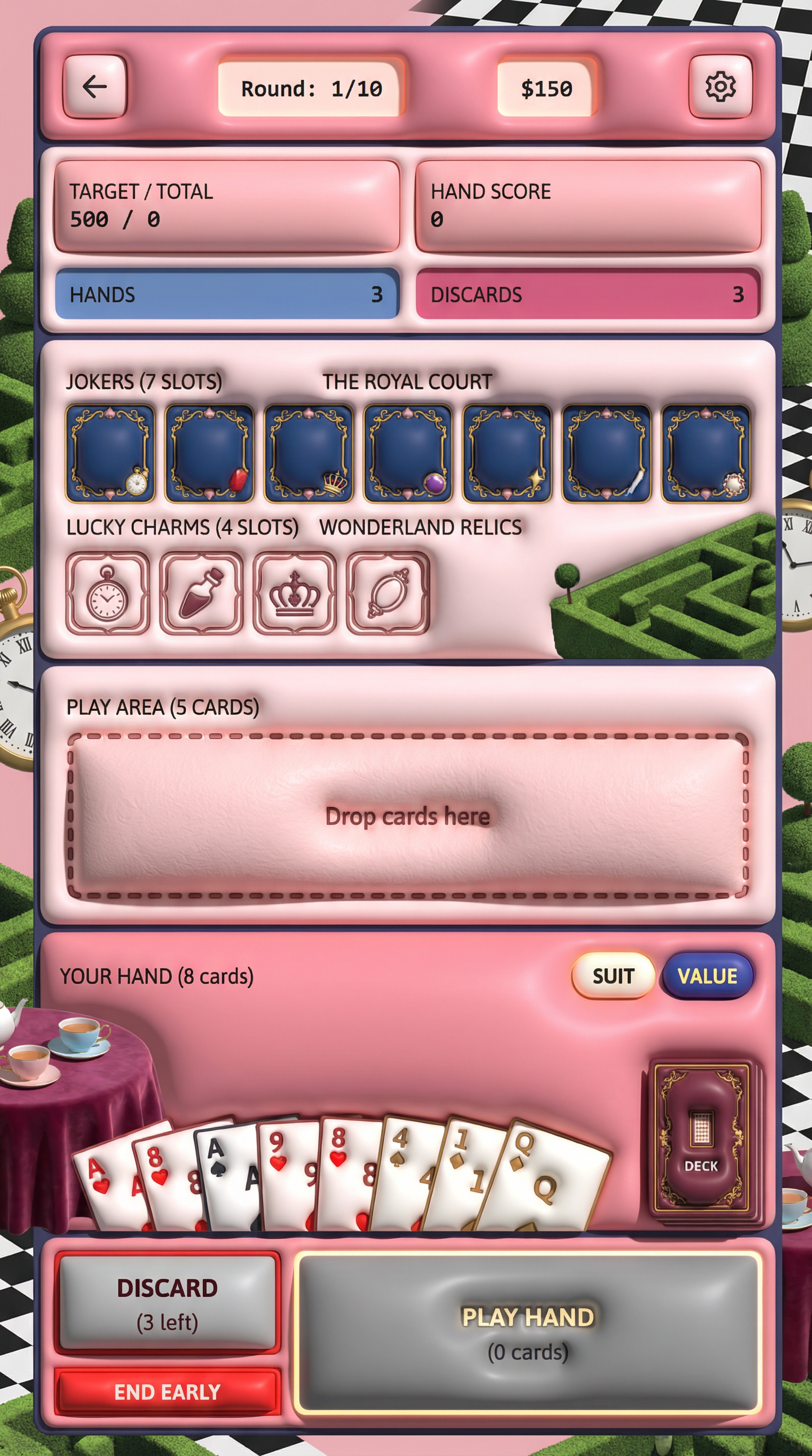 "Ultra-smooth matte silicone and soft polymer materials with tactile, gummy-like volumetric forms. Seamless, rounded bevels and thick, pillowy edges. 3D-simulated rendering using soft inner shadows, bright specular core highlights, and vibrant radial gradients. Flawless, bouncy silhouette definition tailored for playful card surfaces and squishy UI panels., Whimsical, slightly surreal royal garden where playing cards come to life. Palette: Pastel Rose Pink and Checkerboard Black-and-White backgrounds, popping with vibrant Royal Heart Red and Tea-Stained Gold. Elements: Manicured topiary mazes, oversized ticking pocket watches, teacups stacked precariously on velvet-draped tables, and royal guards with literal playing-card bodies wielding spear-tipped halberds. Atmosphere: Dreamlike, eccentric, and "Whimsical Nonsense"., "[UI/UX LAYOUT] - Core Structure: Strictly respect the reference layout. UI Panels: Thick beveled frames with high relief (extruded 3D look). - Interactions: Interactive Buttons require a pronounced inner glow and high-saliency color fills to indicate clickability. - Depth & Hierarchy: Aggressive drop shadows (Z-depth) between all UI layers. Active foreground elements must have 40% more brightness/contrast than background elements. [CARD PROGRESSION MATRIX] Implement an Ornamental Progression Ladder based on card rarity, using the materials defined in the Theme: - Common: Base material of the theme. Minimalist bevels, clean and flat structural borders. No protruding elements. - Rare: Refined theme material. Intricate thematic filigree or patterns, double-tiered UI depth. - Epic: Premium or glowing theme material. Complex architectural relief incorporating small thematic objects embedded in the corners. - Legendary: Maximalist premium material. Heavy thematic motifs that physically break the rectangular silhouette (protruding 3D elements extending past the card borders). - Dynamic Rule: Frame complexity, material richness, and visual weight must scale linearly with card rarity.", "[CONCEPT MAPPING] - Jokers -> THE ROYAL COURT: Whimsical champions and eccentric heroes inspired by Alice in Wonderland characters. Encased in ornate, heavy royal frames. - Lucky Charms -> WONDERLAND RELICS: Physical, tangible artifacts (Oversized pocket watches, glass vials with liquid, ornate crown jewels). - Tarot -> ROYAL DECREES: Weathered parchment scrolls closed with heavy wax seals. - Planet -> MAGIC TEACUPS: Porcelain teacups overflowing with liquids and floating rose petals. [THE COURT - SAMPLE MEMBERS] 1. THE MAD KNIGHT (The Tank): Massive, eccentric knight wearing heavy armor crafted from oversized teacups and thick playing cards. Wielding a giant spear-tipped halberd. Imposing, defensive posture. 2. THE CHESHIRE ROGUE (The Assassin): Agile, shadowy figure partially fading into smoke with a wide, exaggerated grin. Holding a curved dagger. Stealthy, mysterious posture. 3. THE CLOCKWORK MAGE (The Strategist): Eccentric caster in a tattered top-hat, juggling floating pocket watches with chaotic energy trails around them. Calculating, intelligent posture.""