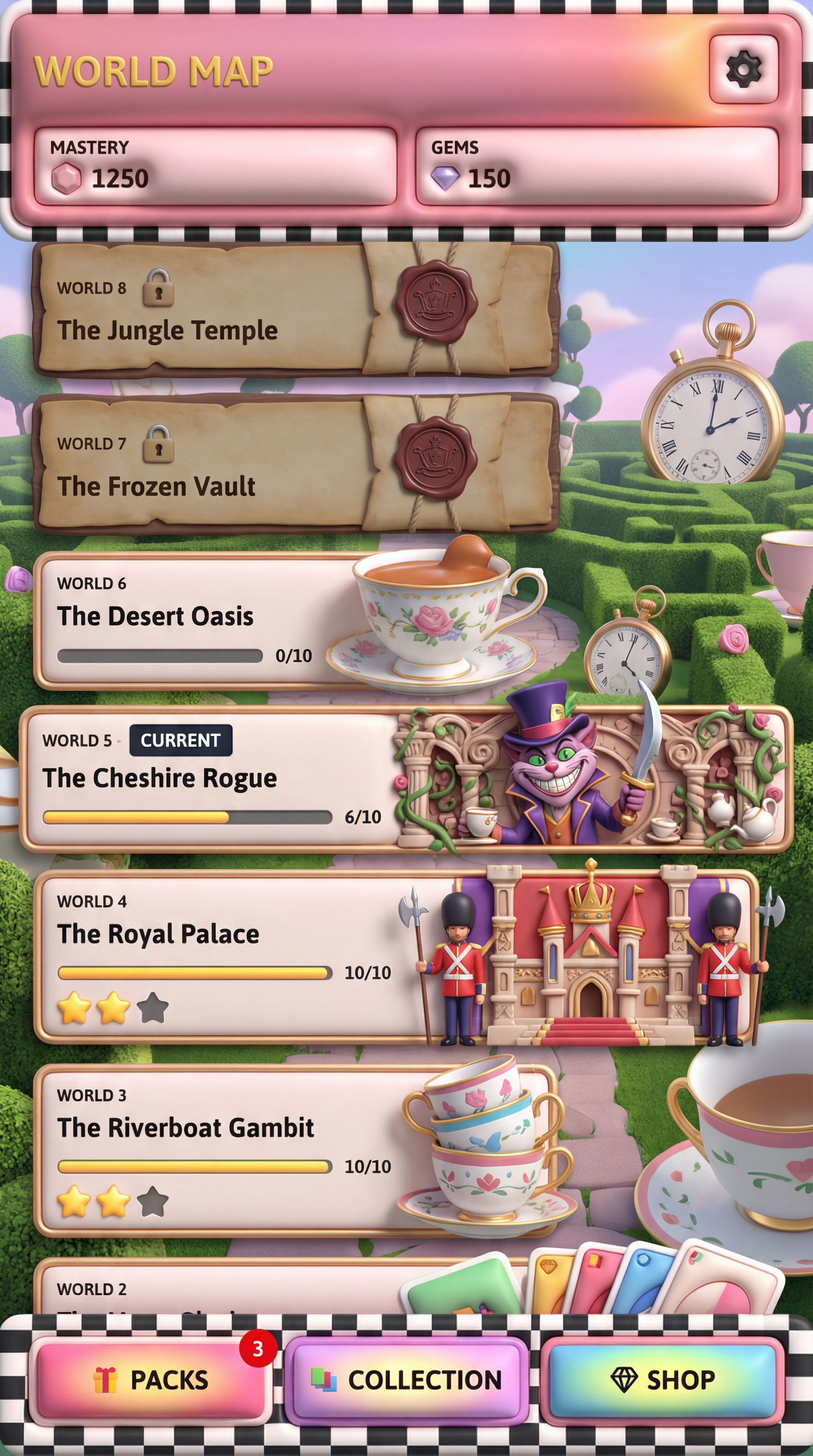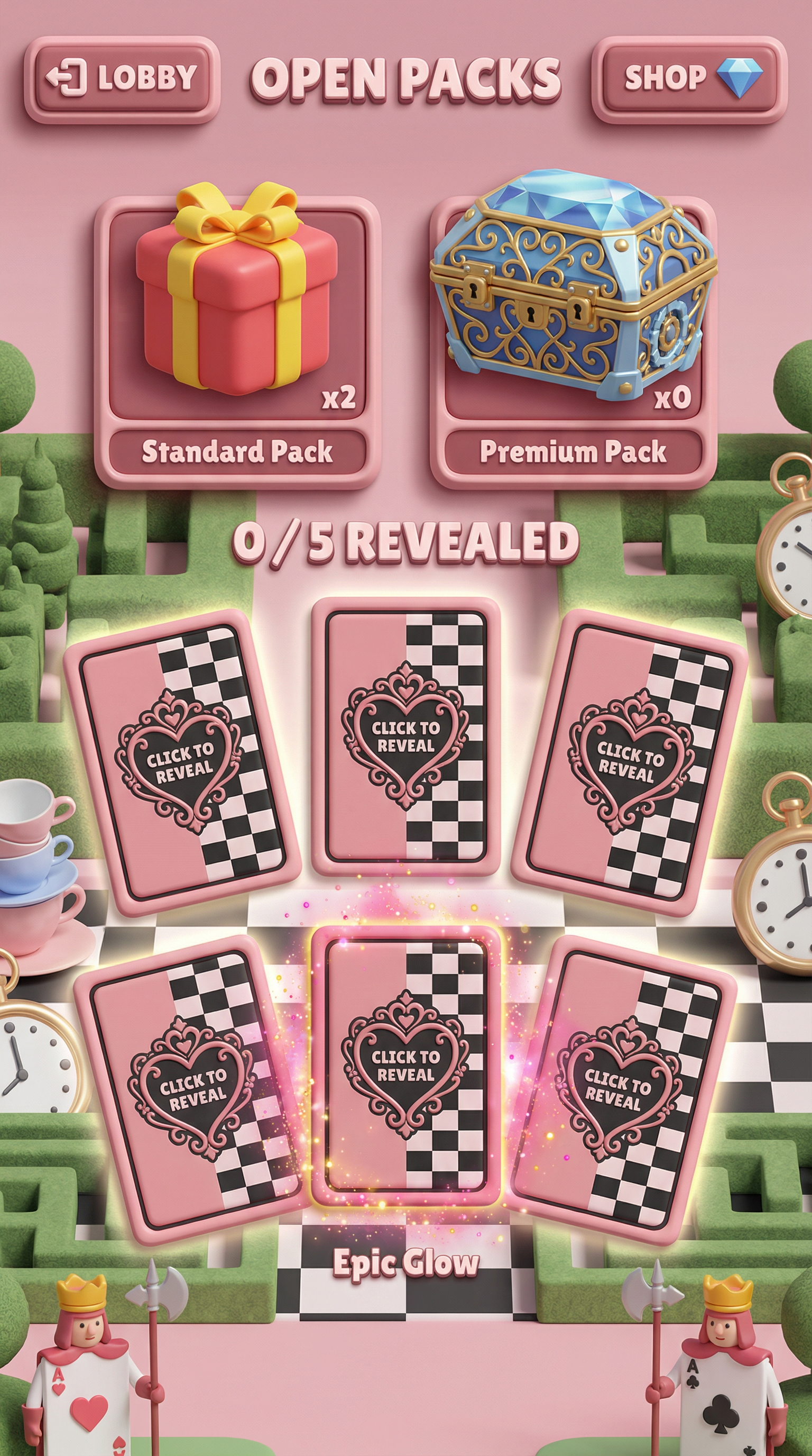 "Ultra-smooth matte silicone and soft polymer materials with tactile, gummy-like volumetric forms. Seamless, rounded bevels and thick, pillowy edges. 3D-simulated rendering using soft inner shadows, bright specular core highlights, and vibrant radial gradients. Flawless, bouncy silhouette definition tailored for playful card surfaces and squishy UI panels., Whimsical, slightly surreal royal garden where playing cards come to life. Palette: Pastel Rose Pink and Checkerboard Black-and-White backgrounds, popping with vibrant Royal Heart Red and Tea-Stained Gold. Elements: Manicured topiary mazes, oversized ticking pocket watches, teacups stacked precariously on velvet-draped tables, and royal guards with literal playing-card bodies wielding spear-tipped halberds. Atmosphere: Dreamlike, eccentric, and "Whimsical Nonsense"., "[UI/UX LAYOUT] - Core Structure: Strictly respect the reference layout. UI Panels: Thick beveled frames with high relief (extruded 3D look). - Interactions: Interactive Buttons require a pronounced inner glow and high-saliency color fills to indicate clickability. - Depth & Hierarchy: Aggressive drop shadows (Z-depth) between all UI layers. Active foreground elements must have 40% more brightness/contrast than background elements. [CARD PROGRESSION MATRIX] Implement an Ornamental Progression Ladder based on card rarity, using the materials defined in the Theme: - Common: Base material of the theme. Minimalist bevels, clean and flat structural borders. No protruding elements. - Rare: Refined theme material. Intricate thematic filigree or patterns, double-tiered UI depth. - Epic: Premium or glowing theme material. Complex architectural relief incorporating small thematic objects embedded in the corners. - Legendary: Maximalist premium material. Heavy thematic motifs that physically break the rectangular silhouette (protruding 3D elements extending past the card borders). - Dynamic Rule: Frame complexity, material richness, and visual weight must scale linearly with card rarity.", "[CONCEPT MAPPING] - Jokers -> THE ROYAL COURT: Whimsical champions and eccentric heroes inspired by Alice in Wonderland characters. Encased in ornate, heavy royal frames. - Lucky Charms -> WONDERLAND RELICS: Physical, tangible artifacts (Oversized pocket watches, glass vials with liquid, ornate crown jewels). - Tarot -> ROYAL DECREES: Weathered parchment scrolls closed with heavy wax seals. - Planet -> MAGIC TEACUPS: Porcelain teacups overflowing with liquids and floating rose petals. [THE COURT - SAMPLE MEMBERS] 1. THE MAD KNIGHT (The Tank): Massive, eccentric knight wearing heavy armor crafted from oversized teacups and thick playing cards. Wielding a giant spear-tipped halberd. Imposing, defensive posture. 2. THE CHESHIRE ROGUE (The Assassin): Agile, shadowy figure partially fading into smoke with a wide, exaggerated grin. Holding a curved dagger. Stealthy, mysterious posture. 3. THE CLOCKWORK MAGE (The Strategist): Eccentric caster in a tattered top-hat, juggling floating pocket watches with chaotic energy trails around them. Calculating, intelligent posture.", Pack Tier Differentiation (Standard vs. Premium): * Standard Asset: Single-layer design. Clean, functional geometry with minimal articulation or ornamental points. Uses basic surface textures. * Premium Asset: Multi-layered, high-complexity design. Must feature "mechanical intrigue" elements (e.g., dual latches, deep relief, intricate security features, or ornate filigree). Value is communicated through detail density per pixel and structural sophistication, not physical scale. Card Arrangement (Face-down State): * A set of 5 vertical rectangles (Card Backs). * Dynamic "Fan-out" or "Semi-circle" arrangement to simulate physical depth and perspective on the 3D plane. Backlight Aura: A peripheral light plane (halo) hidden behind the card edges. The "Epic Glow" (Visual Lead): * An expansive radiance effect using dynamic particles and light halos that "leak" past the card’s closed silhouette."