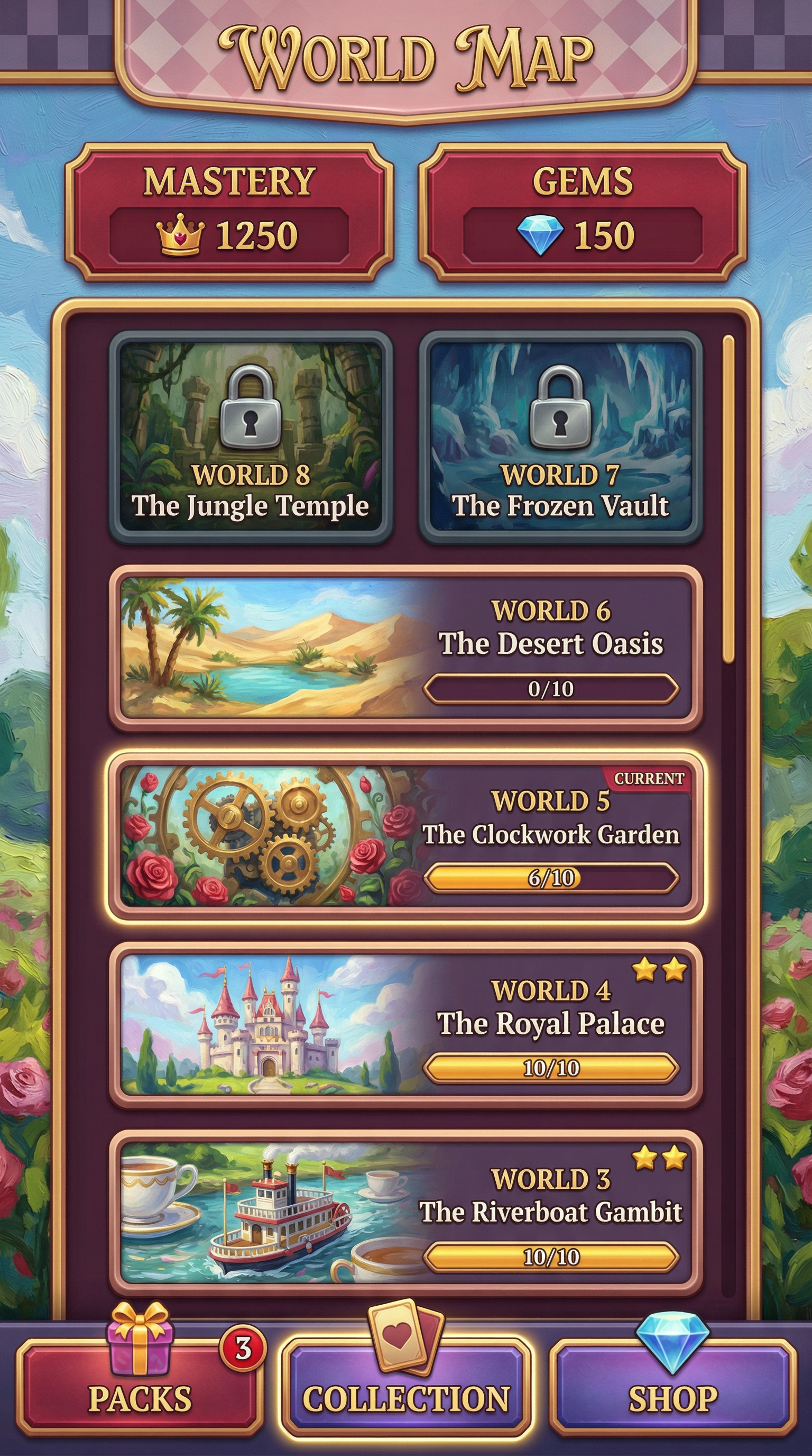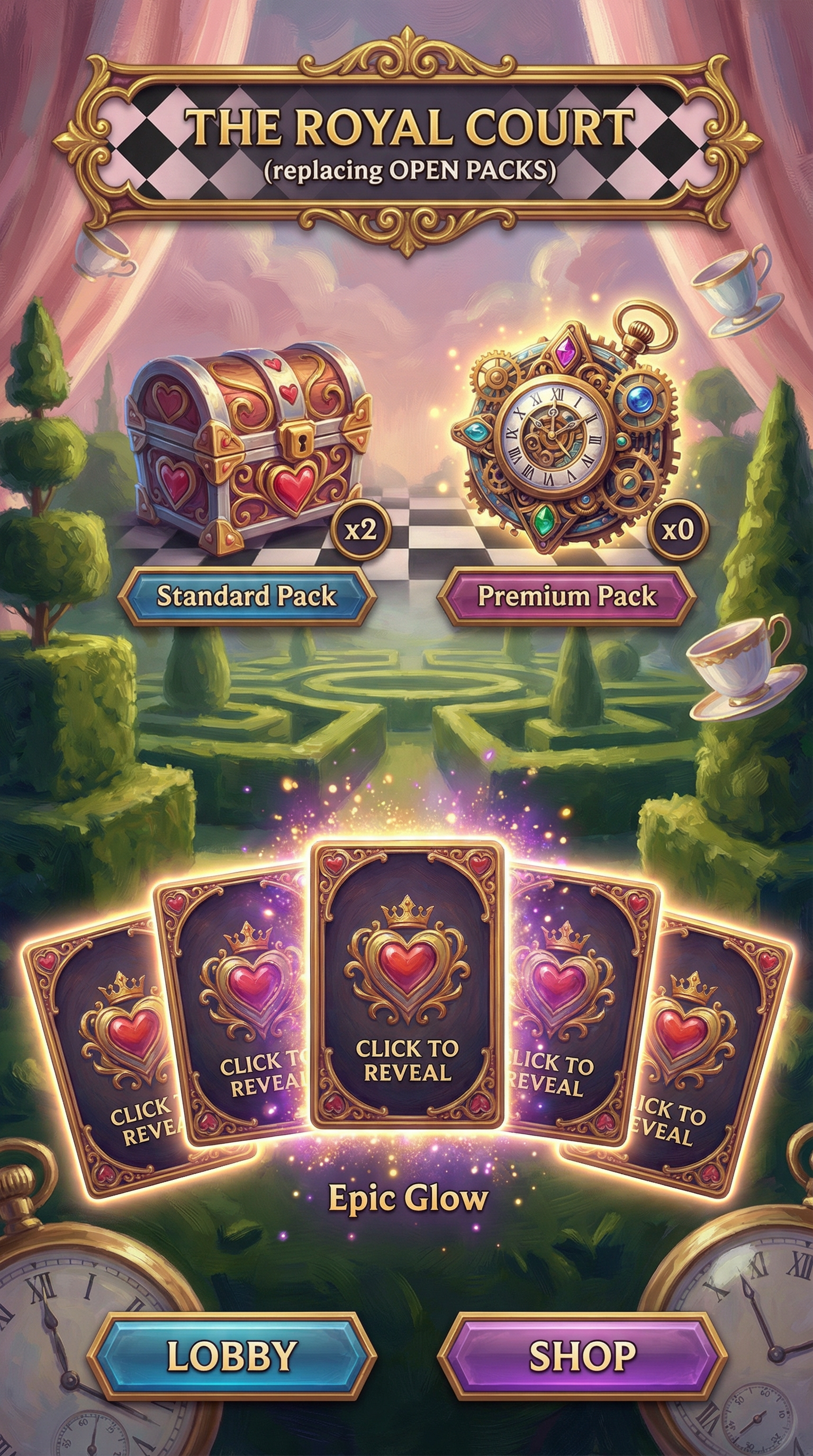 "Rich digital oil painting techniques with thick, expressive impasto brushstrokes and layered color blending. Soft, glowing ambient occlusion mixed with dramatic, saturated rim lighting. High-fidelity 2D fantasy rendering. Distinct, hand-crafted edge definition ensuring perfect readability for complex card illustrations and ornate UI frames.", Whimsical, slightly surreal royal garden where playing cards come to life. Palette: Pastel Rose Pink and Checkerboard Black-and-White backgrounds, popping with vibrant Royal Heart Red and Tea-Stained Gold. Elements: Manicured topiary mazes, oversized ticking pocket watches, teacups stacked precariously on velvet-draped tables, and royal guards with literal playing-card bodies wielding spear-tipped halberds. Atmosphere: Dreamlike, eccentric, and "Whimsical Nonsense"., "[UI/UX LAYOUT] - Core Structure: Strictly respect the reference layout. UI Panels: Thick beveled frames with high relief (extruded 3D look). - Interactions: Interactive Buttons require a pronounced inner glow and high-saliency color fills to indicate clickability. - Depth & Hierarchy: Aggressive drop shadows (Z-depth) between all UI layers. Active foreground elements must have 40% more brightness/contrast than background elements. [CARD PROGRESSION MATRIX] Implement an Ornamental Progression Ladder based on card rarity, using the materials defined in the Theme: - Common: Base material of the theme. Minimalist bevels, clean and flat structural borders. No protruding elements. - Rare: Refined theme material. Intricate thematic filigree or patterns, double-tiered UI depth. - Epic: Premium or glowing theme material. Complex architectural relief incorporating small thematic objects embedded in the corners. - Legendary: Maximalist premium material. Heavy thematic motifs that physically break the rectangular silhouette (protruding 3D elements extending past the card borders). - Dynamic Rule: Frame complexity, material richness, and visual weight must scale linearly with card rarity.", "[CONCEPT MAPPING] - Jokers -> THE ROYAL COURT: Whimsical champions and eccentric heroes inspired by Alice in Wonderland characters. Encased in ornate, heavy royal frames. - Lucky Charms -> WONDERLAND RELICS: Physical, tangible artifacts (Oversized pocket watches, glass vials with liquid, ornate crown jewels). - Tarot -> ROYAL DECREES: Weathered parchment scrolls closed with heavy wax seals. - Planet -> MAGIC TEACUPS: Porcelain teacups overflowing with liquids and floating rose petals. [THE COURT - SAMPLE MEMBERS] 1. THE MAD KNIGHT (The Tank): Massive, eccentric knight wearing heavy armor crafted from oversized teacups and thick playing cards. Wielding a giant spear-tipped halberd. Imposing, defensive posture. 2. THE CHESHIRE ROGUE (The Assassin): Agile, shadowy figure partially fading into smoke with a wide, exaggerated grin. Holding a curved dagger. Stealthy, mysterious posture. 3. THE CLOCKWORK MAGE (The Strategist): Eccentric caster in a tattered top-hat, juggling floating pocket watches with chaotic energy trails around them. Calculating, intelligent posture.", Pack Tier Differentiation (Standard vs. Premium): * Standard Asset: Single-layer design. Clean, functional geometry with minimal articulation or ornamental points. Uses basic surface textures. * Premium Asset: Multi-layered, high-complexity design. Must feature "mechanical intrigue" elements (e.g., dual latches, deep relief, intricate security features, or ornate filigree). Value is communicated through detail density per pixel and structural sophistication, not physical scale. Card Arrangement (Face-down State): * A set of 5 vertical rectangles (Card Backs). * Dynamic "Fan-out" or "Semi-circle" arrangement to simulate physical depth and perspective on the 3D plane. Backlight Aura: A peripheral light plane (halo) hidden behind the card edges. The "Epic Glow" (Visual Lead): * An expansive radiance effect using dynamic particles and light halos that "leak" past the card’s closed silhouette."