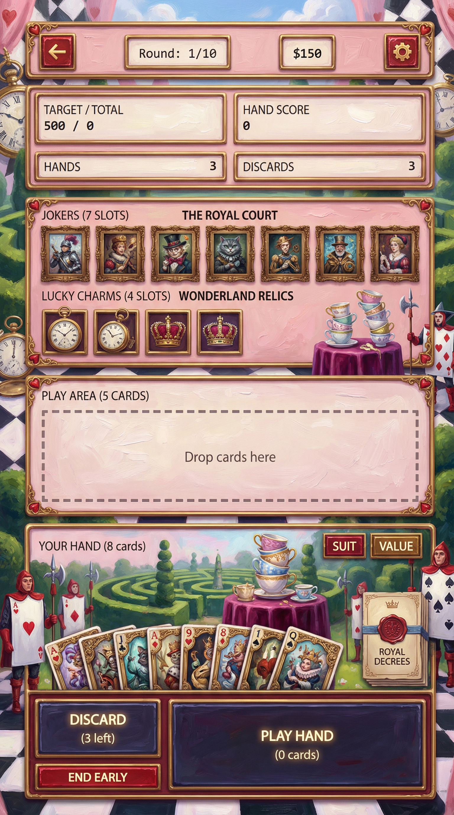 "Rich digital oil painting techniques with thick, expressive impasto brushstrokes and layered color blending. Soft, glowing ambient occlusion mixed with dramatic, saturated rim lighting. High-fidelity 2D fantasy rendering. Distinct, hand-crafted edge definition ensuring perfect readability for complex card illustrations and ornate UI frames.", Whimsical, slightly surreal royal garden where playing cards come to life. Palette: Pastel Rose Pink and Checkerboard Black-and-White backgrounds, popping with vibrant Royal Heart Red and Tea-Stained Gold. Elements: Manicured topiary mazes, oversized ticking pocket watches, teacups stacked precariously on velvet-draped tables, and royal guards with literal playing-card bodies wielding spear-tipped halberds. Atmosphere: Dreamlike, eccentric, and "Whimsical Nonsense"., "[UI/UX LAYOUT] - Core Structure: Strictly respect the reference layout. UI Panels: Thick beveled frames with high relief (extruded 3D look). - Interactions: Interactive Buttons require a pronounced inner glow and high-saliency color fills to indicate clickability. - Depth & Hierarchy: Aggressive drop shadows (Z-depth) between all UI layers. Active foreground elements must have 40% more brightness/contrast than background elements. [CARD PROGRESSION MATRIX] Implement an Ornamental Progression Ladder based on card rarity, using the materials defined in the Theme: - Common: Base material of the theme. Minimalist bevels, clean and flat structural borders. No protruding elements. - Rare: Refined theme material. Intricate thematic filigree or patterns, double-tiered UI depth. - Epic: Premium or glowing theme material. Complex architectural relief incorporating small thematic objects embedded in the corners. - Legendary: Maximalist premium material. Heavy thematic motifs that physically break the rectangular silhouette (protruding 3D elements extending past the card borders). - Dynamic Rule: Frame complexity, material richness, and visual weight must scale linearly with card rarity.", "[CONCEPT MAPPING] - Jokers -> THE ROYAL COURT: Whimsical champions and eccentric heroes inspired by Alice in Wonderland characters. Encased in ornate, heavy royal frames. - Lucky Charms -> WONDERLAND RELICS: Physical, tangible artifacts (Oversized pocket watches, glass vials with liquid, ornate crown jewels). - Tarot -> ROYAL DECREES: Weathered parchment scrolls closed with heavy wax seals. - Planet -> MAGIC TEACUPS: Porcelain teacups overflowing with liquids and floating rose petals. [THE COURT - SAMPLE MEMBERS] 1. THE MAD KNIGHT (The Tank): Massive, eccentric knight wearing heavy armor crafted from oversized teacups and thick playing cards. Wielding a giant spear-tipped halberd. Imposing, defensive posture. 2. THE CHESHIRE ROGUE (The Assassin): Agile, shadowy figure partially fading into smoke with a wide, exaggerated grin. Holding a curved dagger. Stealthy, mysterious posture. 3. THE CLOCKWORK MAGE (The Strategist): Eccentric caster in a tattered top-hat, juggling floating pocket watches with chaotic energy trails around them. Calculating, intelligent posture.""