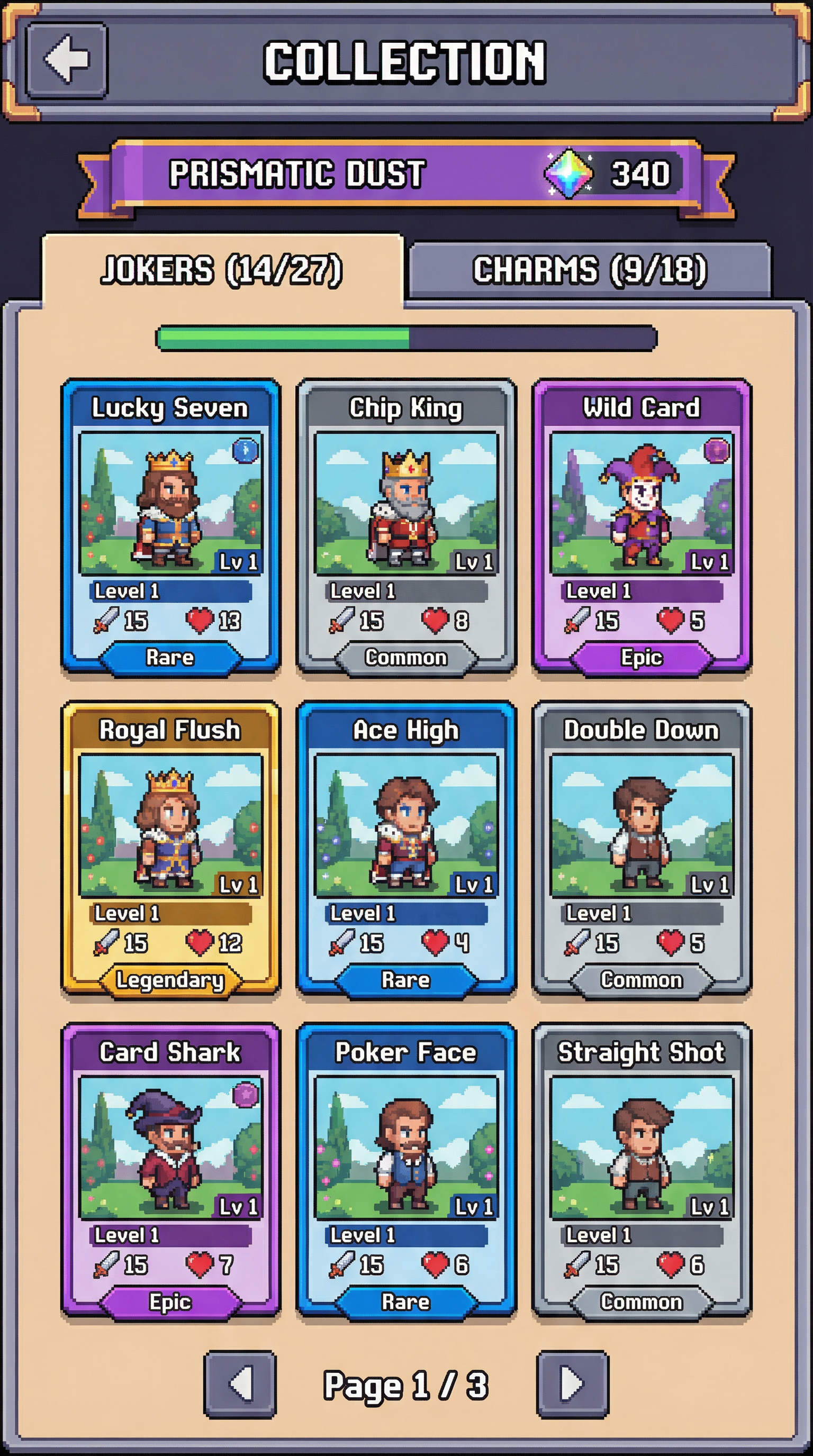"Crisp, high-density 16-bit to 32-bit pixel art with meticulous manual dithering and pixel-perfect line work. Enhanced with modern rendering techniques including real-time dynamic bloom, volumetric lighting, and deep parallax layers. High-contrast, readable silhouettes specifically optimized for digital playing cards, floating icons, and retro-modern UI frames., Whimsical, slightly surreal royal garden where playing cards come to life. Palette: Pastel Rose Pink and Checkerboard Black-and-White backgrounds, popping with vibrant Royal Heart Red and Tea-Stained Gold. Elements: Manicured topiary mazes, oversized ticking pocket watches, teacups stacked precariously on velvet-draped tables, and royal guards with literal playing-card bodies wielding spear-tipped halberds. Atmosphere: Dreamlike, eccentric, and "Whimsical Nonsense"., "[UI/UX LAYOUT] - Core Structure: Strictly respect the reference layout. UI Panels: Thick beveled frames with high relief (extruded 3D look). - Interactions: Interactive Buttons require a pronounced inner glow and high-saliency color fills to indicate clickability. - Depth & Hierarchy: Aggressive drop shadows (Z-depth) between all UI layers. Active foreground elements must have 40% more brightness/contrast than background elements. [CARD PROGRESSION MATRIX] Implement an Ornamental Progression Ladder based on card rarity, using the materials defined in the Theme: - Common: Base material of the theme. Minimalist bevels, clean and flat structural borders. No protruding elements. - Rare: Refined theme material. Intricate thematic filigree or patterns, double-tiered UI depth. - Epic: Premium or glowing theme material. Complex architectural relief incorporating small thematic objects embedded in the corners. - Legendary: Maximalist premium material. Heavy thematic motifs that physically break the rectangular silhouette (protruding 3D elements extending past the card borders). - Dynamic Rule: Frame complexity, material richness, and visual weight must scale linearly with card rarity.", "[CONCEPT MAPPING] - Jokers -> THE ROYAL COURT: Whimsical champions and eccentric heroes inspired by Alice in Wonderland characters. Encased in ornate, heavy royal frames. - Lucky Charms -> WONDERLAND RELICS: Physical, tangible artifacts (Oversized pocket watches, glass vials with liquid, ornate crown jewels). - Tarot -> ROYAL DECREES: Weathered parchment scrolls closed with heavy wax seals. - Planet -> MAGIC TEACUPS: Porcelain teacups overflowing with liquids and floating rose petals. [THE COURT - SAMPLE MEMBERS] 1. THE MAD KNIGHT (The Tank): Massive, eccentric knight wearing heavy armor crafted from oversized teacups and thick playing cards. Wielding a giant spear-tipped halberd. Imposing, defensive posture. 2. THE CHESHIRE ROGUE (The Assassin): Agile, shadowy figure partially fading into smoke with a wide, exaggerated grin. Holding a curved dagger. Stealthy, mysterious posture. 3. THE CLOCKWORK MAGE (The Strategist): Eccentric caster in a tattered top-hat, juggling floating pocket watches with chaotic energy trails around them. Calculating, intelligent posture.", For Purchasable Cards: "Visual Hierarchy: Vertical card orientation divided into three functional zones. Primary Zone (60-70% height): A large, centered rectangular frame dedicated to the character portrait and character name. Rarity: A high-saliency badge or icon placeholder located in the top-right corner, integrated in the main portrait frame. Or different card frame per rarity of the card including integrating the badge. Rarity Color Scheme: Common: Grey. Rare: Blue. Epic: Purple. Legendary: Yellow-Orange, Golden Information Zone (25% height): A dedicated horizontal rectangular container at the bottom for ""Modifier Text"" and ""Effect Description"". Purchase Price. Cost for adquiring the card or pack. Item Type: A Tag that indicated the type of item we are purchasing. Z-Depth: Character portrait must overlap the top edge of its frame to create a pop-out effect." ------"