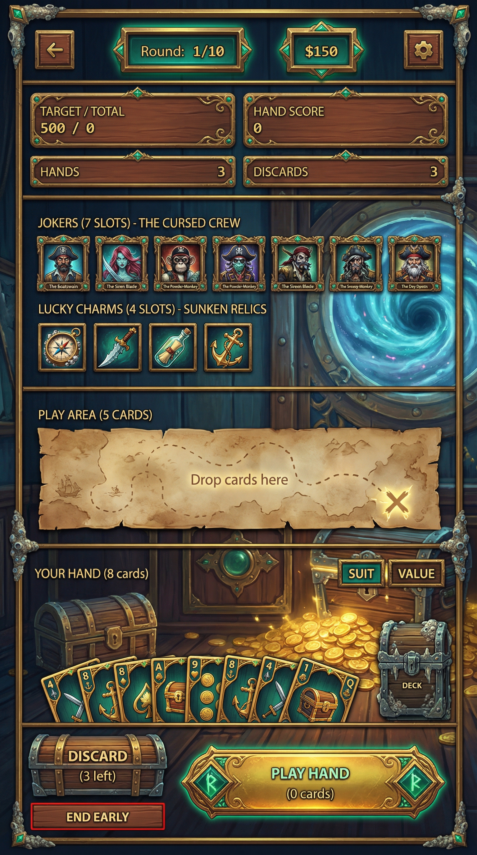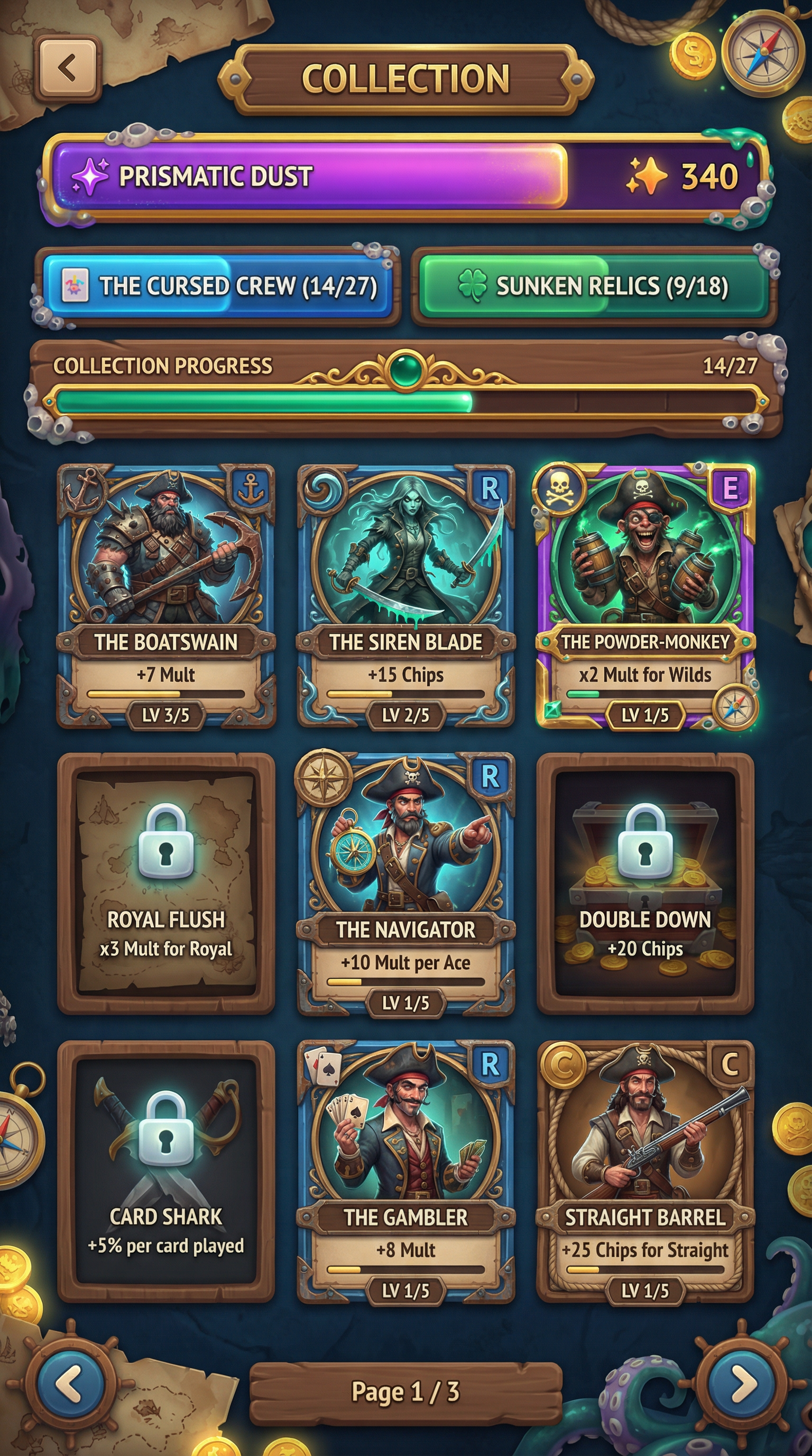 "Ultra-smooth matte silicone and soft polymer materials with tactile, gummy-like volumetric forms. Seamless, rounded bevels and thick, pillowy edges. 3D-simulated rendering using soft inner shadows, bright specular core highlights, and vibrant radial gradients. Flawless, bouncy silhouette definition tailored for playful card surfaces and squishy UI panels., - Concept: High-stakes supernatural pirate adventure on the High Seas. Captain's cabin of a legendary galleon navigating through a magical maelstrom - Palette: Deep Ocean Navy and Weathered Mahogany backgrounds, sharply contrasted with bright Tropical Emerald (magic/cursed elements) and Sunken Gold highlights. - Materials & Elements: Barnacle-encrusted wood, cursed parchment treasure maps, overflowing glowing doubloons, spinning brass compasses, and kraken motifs. - Atmosphere: Adventurous, dangerous, and 'Swashbuckling Mystery'. Weathered but highly stylized and legible., [UI/UX LAYOUT] - Core Structure: Respect reference layout. Thick beveled frames, high relief (extruded 3D look). Aggressive Z-depth drop shadows between all layers. - Interactions: Clickable buttons require pronounced inner 'Tropical Emerald' glow. Active foreground elements must have 40% more brightness/contrast than background. [CARD PROGRESSION MATRIX] Ornamental ladder scaling linearly by rarity: - Common: 'Weathered Mahogany' wood. Minimalist bevels, clean flat structural borders. No protruding elements. - Rare: Tarnished brass & rusted iron. Intricate nautical filigree (ropes/waves), double-tiered UI depth. - Epic: Premium 'Sunken Gold' with 'Tropical Emerald' glowing accents. Complex architectural relief with embedded brass compasses or barnacles in corners. - Legendary: Maximalist premium 'Sunken Gold'. Heavy thematic motifs (carved Kraken tentacles, cursed pirate skulls, heavy anchor chains) physically breaking the rectangular silhouette (protruding 3D elements)., [CONCEPT MAPPING] - Jokers -> THE CURSED CREW: Supernatural pirate specialists & swashbuckling rogues. Encased in weathered, heavy nautical frames. - Lucky Charms -> SUNKEN RELICS: Tangible cursed artifacts (Barnacle-encrusted compasses, kraken-tooth daggers, glowing messages in bottles). - Tarot -> CURSED CHARTS: Weathered parchment treasure maps, glowing 'X' marks, arcane navigation lines. - Planet -> ASTRAL ASTROLABES: Intricate brass navigation tools & glass buoys containing glowing trapped celestial energy. [THE CREW - SAMPLES] 1. THE BOATSWAIN (Heavy): Massive imposing cursed pirate, armor of shipwreck debris & hardened coral. Wielding heavy rusted ship's anchor on a chain. Brutal, intimidating posture. 2. THE SIREN BLADE (Assassin): Agile mysterious figure in eerie sea-mist & tattered aristocratic naval coats. Twin curved cutlasses dripping supernatural seawater. Stealthy, lethal posture. 3. THE POWDER-MONKEY (Specialist): Manic soot-covered pirate, holding multiple miniature gunpowder kegs with glowing magical emerald fuses. Chaotic, unpredictable posture., For Purchasable Cards: "Visual Hierarchy: Vertical card orientation divided into three functional zones. Primary Zone (60-70% height): A large, centered rectangular frame dedicated to the character portrait and character name. Rarity: A high-saliency badge or icon placeholder located in the top-right corner, integrated in the main portrait frame. Or different card frame per rarity of the card including integrating the badge. Rarity Color Scheme: Common: Grey. Rare: Blue. Epic: Purple. Legendary: Yellow-Orange, Golden Information Zone (25% height): A dedicated horizontal rectangular container at the bottom for ""Modifier Text"" and ""Effect Description"". Purchase Price. Cost for adquiring the card or pack. Item Type: A Tag that indicated the type of item we are purchasing. Z-Depth: Character portrait must overlap the top edge of its frame to create a pop-out effect." ------"