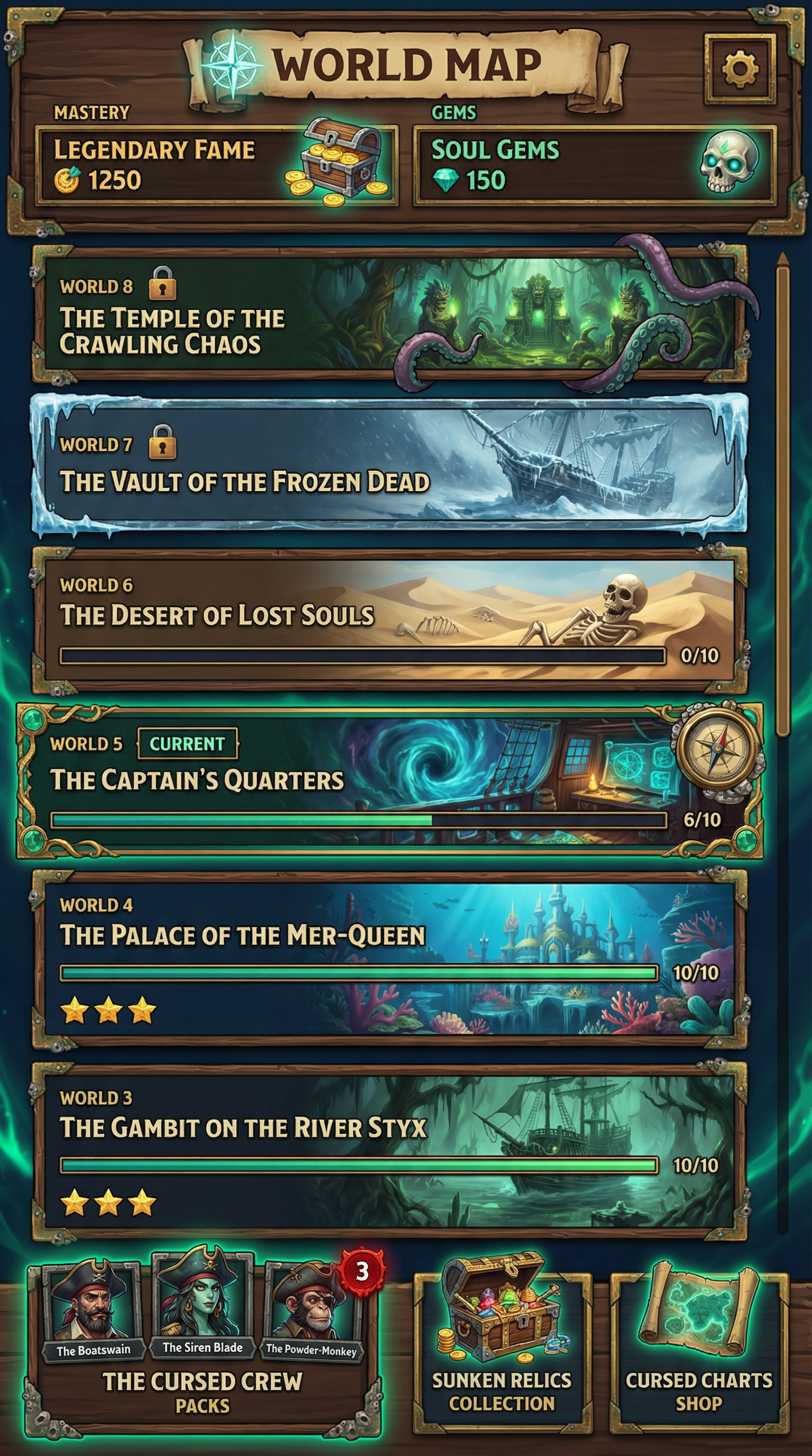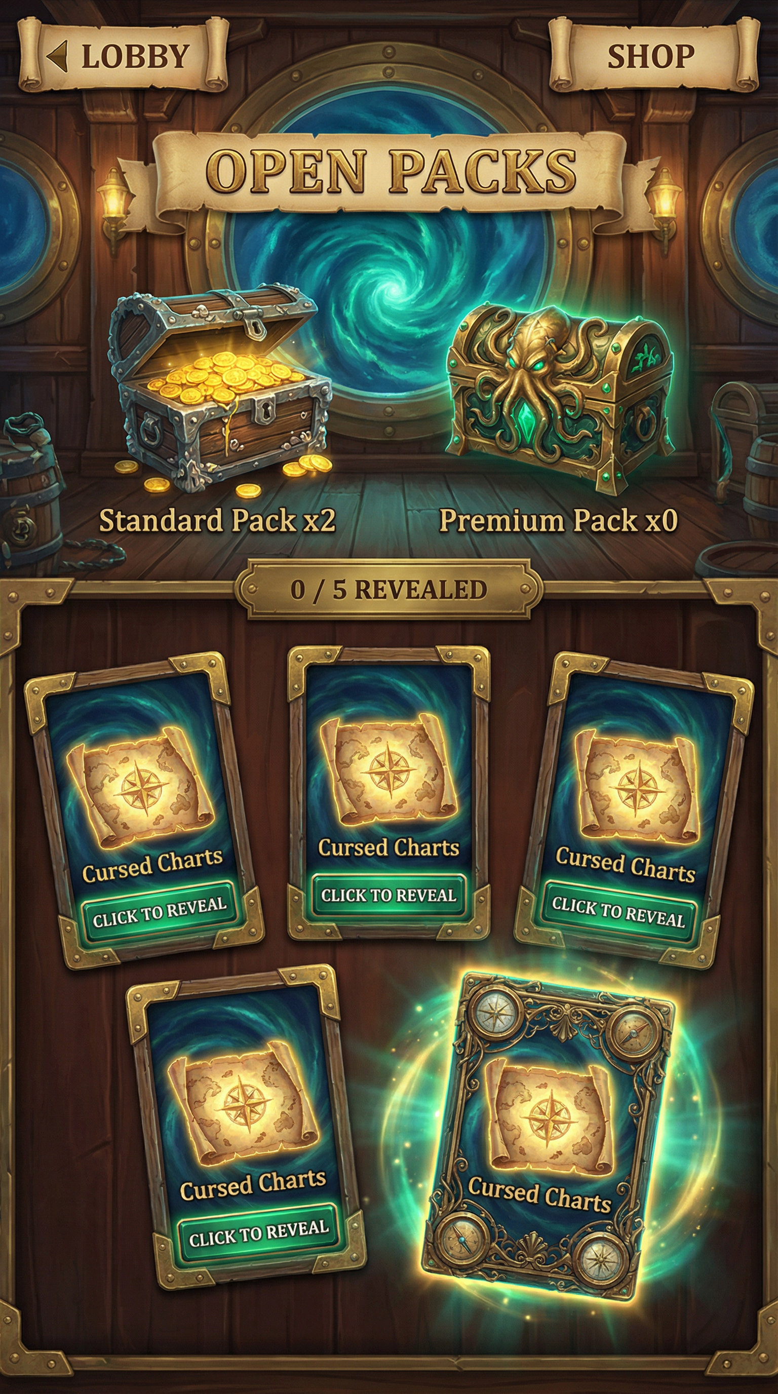 "Ultra-smooth matte silicone and soft polymer materials with tactile, gummy-like volumetric forms. Seamless, rounded bevels and thick, pillowy edges. 3D-simulated rendering using soft inner shadows, bright specular core highlights, and vibrant radial gradients. Flawless, bouncy silhouette definition tailored for playful card surfaces and squishy UI panels., - Concept: High-stakes supernatural pirate adventure on the High Seas. Captain's cabin of a legendary galleon navigating through a magical maelstrom - Palette: Deep Ocean Navy and Weathered Mahogany backgrounds, sharply contrasted with bright Tropical Emerald (magic/cursed elements) and Sunken Gold highlights. - Materials & Elements: Barnacle-encrusted wood, cursed parchment treasure maps, overflowing glowing doubloons, spinning brass compasses, and kraken motifs. - Atmosphere: Adventurous, dangerous, and 'Swashbuckling Mystery'. Weathered but highly stylized and legible., [UI/UX LAYOUT] - Core Structure: Respect reference layout. Thick beveled frames, high relief (extruded 3D look). Aggressive Z-depth drop shadows between all layers. - Interactions: Clickable buttons require pronounced inner 'Tropical Emerald' glow. Active foreground elements must have 40% more brightness/contrast than background. [CARD PROGRESSION MATRIX] Ornamental ladder scaling linearly by rarity: - Common: 'Weathered Mahogany' wood. Minimalist bevels, clean flat structural borders. No protruding elements. - Rare: Tarnished brass & rusted iron. Intricate nautical filigree (ropes/waves), double-tiered UI depth. - Epic: Premium 'Sunken Gold' with 'Tropical Emerald' glowing accents. Complex architectural relief with embedded brass compasses or barnacles in corners. - Legendary: Maximalist premium 'Sunken Gold'. Heavy thematic motifs (carved Kraken tentacles, cursed pirate skulls, heavy anchor chains) physically breaking the rectangular silhouette (protruding 3D elements)., [CONCEPT MAPPING] - Jokers -> THE CURSED CREW: Supernatural pirate specialists & swashbuckling rogues. Encased in weathered, heavy nautical frames. - Lucky Charms -> SUNKEN RELICS: Tangible cursed artifacts (Barnacle-encrusted compasses, kraken-tooth daggers, glowing messages in bottles). - Tarot -> CURSED CHARTS: Weathered parchment treasure maps, glowing 'X' marks, arcane navigation lines. - Planet -> ASTRAL ASTROLABES: Intricate brass navigation tools & glass buoys containing glowing trapped celestial energy. [THE CREW - SAMPLES] 1. THE BOATSWAIN (Heavy): Massive imposing cursed pirate, armor of shipwreck debris & hardened coral. Wielding heavy rusted ship's anchor on a chain. Brutal, intimidating posture. 2. THE SIREN BLADE (Assassin): Agile mysterious figure in eerie sea-mist & tattered aristocratic naval coats. Twin curved cutlasses dripping supernatural seawater. Stealthy, lethal posture. 3. THE POWDER-MONKEY (Specialist): Manic soot-covered pirate, holding multiple miniature gunpowder kegs with glowing magical emerald fuses. Chaotic, unpredictable posture., Pack Tier Differentiation (Standard vs. Premium): * Standard Asset: Single-layer design. Clean, functional geometry with minimal articulation or ornamental points. Uses basic surface textures. * Premium Asset: Multi-layered, high-complexity design. Must feature "mechanical intrigue" elements (e.g., dual latches, deep relief, intricate security features, or ornate filigree). Value is communicated through detail density per pixel and structural sophistication, not physical scale. Card Arrangement (Face-down State): * A set of 5 vertical rectangles (Card Backs). * Dynamic "Fan-out" or "Semi-circle" arrangement to simulate physical depth and perspective on the 3D plane. Backlight Aura: A peripheral light plane (halo) hidden behind the card edges. The "Epic Glow" (Visual Lead): * An expansive radiance effect using dynamic particles and light halos that "leak" past the card’s closed silhouette."