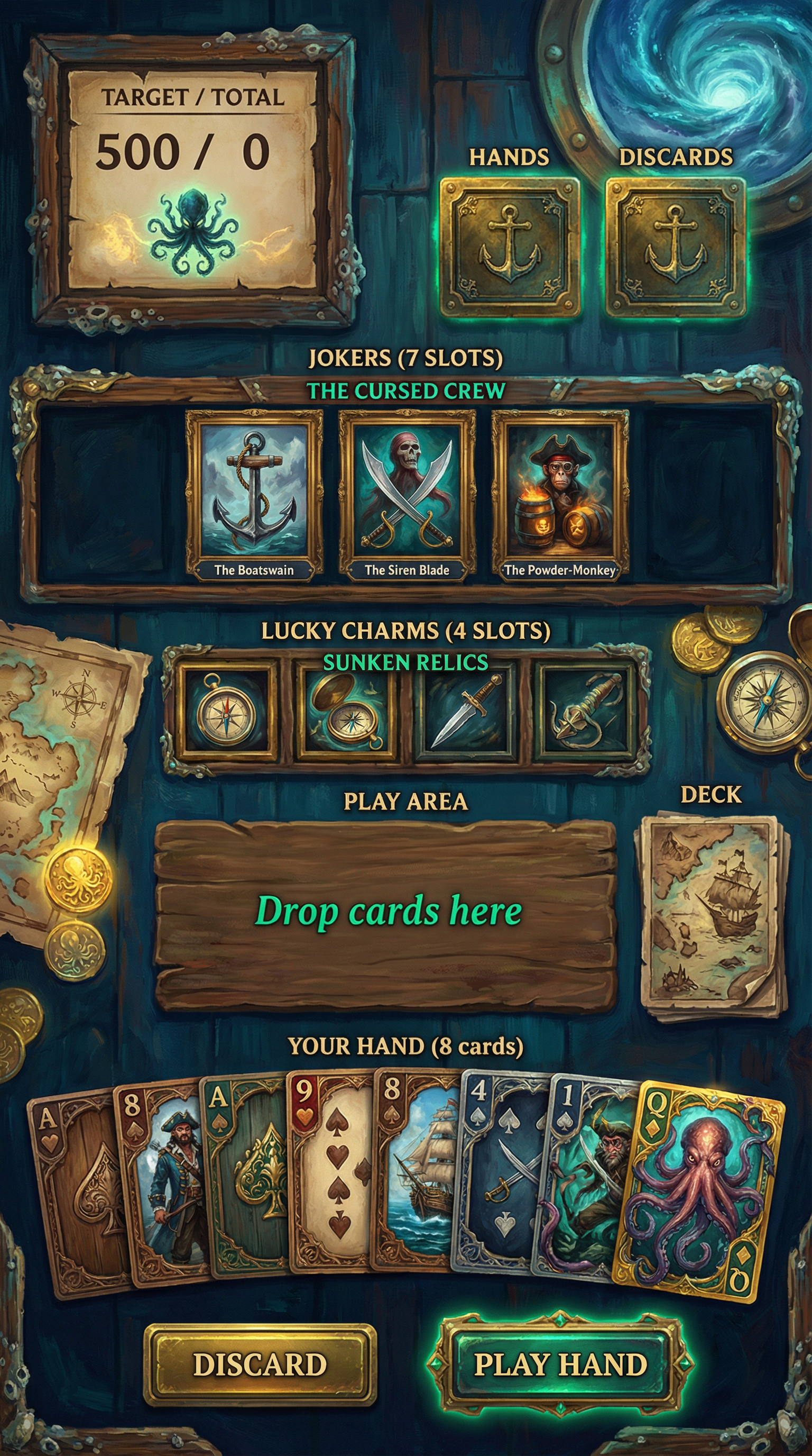 "Rich digital oil painting techniques with thick, expressive impasto brushstrokes and layered color blending. Soft, glowing ambient occlusion mixed with dramatic, saturated rim lighting. High-fidelity 2D fantasy rendering. Distinct, hand-crafted edge definition ensuring perfect readability for complex card illustrations and ornate UI frames.", - Concept: High-stakes supernatural pirate adventure on the High Seas. Captain's cabin of a legendary galleon navigating through a magical maelstrom - Palette: Deep Ocean Navy and Weathered Mahogany backgrounds, sharply contrasted with bright Tropical Emerald (magic/cursed elements) and Sunken Gold highlights. - Materials & Elements: Barnacle-encrusted wood, cursed parchment treasure maps, overflowing glowing doubloons, spinning brass compasses, and kraken motifs. - Atmosphere: Adventurous, dangerous, and 'Swashbuckling Mystery'. Weathered but highly stylized and legible., [UI/UX LAYOUT] - Core Structure: Respect reference layout. Thick beveled frames, high relief (extruded 3D look). Aggressive Z-depth drop shadows between all layers. - Interactions: Clickable buttons require pronounced inner 'Tropical Emerald' glow. Active foreground elements must have 40% more brightness/contrast than background. [CARD PROGRESSION MATRIX] Ornamental ladder scaling linearly by rarity: - Common: 'Weathered Mahogany' wood. Minimalist bevels, clean flat structural borders. No protruding elements. - Rare: Tarnished brass & rusted iron. Intricate nautical filigree (ropes/waves), double-tiered UI depth. - Epic: Premium 'Sunken Gold' with 'Tropical Emerald' glowing accents. Complex architectural relief with embedded brass compasses or barnacles in corners. - Legendary: Maximalist premium 'Sunken Gold'. Heavy thematic motifs (carved Kraken tentacles, cursed pirate skulls, heavy anchor chains) physically breaking the rectangular silhouette (protruding 3D elements)., [CONCEPT MAPPING] - Jokers -> THE CURSED CREW: Supernatural pirate specialists & swashbuckling rogues. Encased in weathered, heavy nautical frames. - Lucky Charms -> SUNKEN RELICS: Tangible cursed artifacts (Barnacle-encrusted compasses, kraken-tooth daggers, glowing messages in bottles). - Tarot -> CURSED CHARTS: Weathered parchment treasure maps, glowing 'X' marks, arcane navigation lines. - Planet -> ASTRAL ASTROLABES: Intricate brass navigation tools & glass buoys containing glowing trapped celestial energy. [THE CREW - SAMPLES] 1. THE BOATSWAIN (Heavy): Massive imposing cursed pirate, armor of shipwreck debris & hardened coral. Wielding heavy rusted ship's anchor on a chain. Brutal, intimidating posture. 2. THE SIREN BLADE (Assassin): Agile mysterious figure in eerie sea-mist & tattered aristocratic naval coats. Twin curved cutlasses dripping supernatural seawater. Stealthy, lethal posture. 3. THE POWDER-MONKEY (Specialist): Manic soot-covered pirate, holding multiple miniature gunpowder kegs with glowing magical emerald fuses. Chaotic, unpredictable posture."