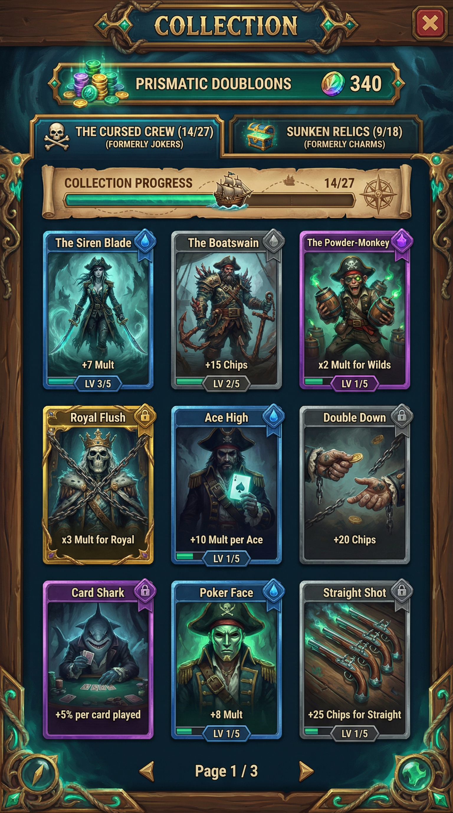 "Rich digital oil painting techniques with thick, expressive impasto brushstrokes and layered color blending. Soft, glowing ambient occlusion mixed with dramatic, saturated rim lighting. High-fidelity 2D fantasy rendering. Distinct, hand-crafted edge definition ensuring perfect readability for complex card illustrations and ornate UI frames.", - Concept: High-stakes supernatural pirate adventure on the High Seas. Captain's cabin of a legendary galleon navigating through a magical maelstrom - Palette: Deep Ocean Navy and Weathered Mahogany backgrounds, sharply contrasted with bright Tropical Emerald (magic/cursed elements) and Sunken Gold highlights. - Materials & Elements: Barnacle-encrusted wood, cursed parchment treasure maps, overflowing glowing doubloons, spinning brass compasses, and kraken motifs. - Atmosphere: Adventurous, dangerous, and 'Swashbuckling Mystery'. Weathered but highly stylized and legible., [UI/UX LAYOUT] - Core Structure: Respect reference layout. Thick beveled frames, high relief (extruded 3D look). Aggressive Z-depth drop shadows between all layers. - Interactions: Clickable buttons require pronounced inner 'Tropical Emerald' glow. Active foreground elements must have 40% more brightness/contrast than background. [CARD PROGRESSION MATRIX] Ornamental ladder scaling linearly by rarity: - Common: 'Weathered Mahogany' wood. Minimalist bevels, clean flat structural borders. No protruding elements. - Rare: Tarnished brass & rusted iron. Intricate nautical filigree (ropes/waves), double-tiered UI depth. - Epic: Premium 'Sunken Gold' with 'Tropical Emerald' glowing accents. Complex architectural relief with embedded brass compasses or barnacles in corners. - Legendary: Maximalist premium 'Sunken Gold'. Heavy thematic motifs (carved Kraken tentacles, cursed pirate skulls, heavy anchor chains) physically breaking the rectangular silhouette (protruding 3D elements)., [CONCEPT MAPPING] - Jokers -> THE CURSED CREW: Supernatural pirate specialists & swashbuckling rogues. Encased in weathered, heavy nautical frames. - Lucky Charms -> SUNKEN RELICS: Tangible cursed artifacts (Barnacle-encrusted compasses, kraken-tooth daggers, glowing messages in bottles). - Tarot -> CURSED CHARTS: Weathered parchment treasure maps, glowing 'X' marks, arcane navigation lines. - Planet -> ASTRAL ASTROLABES: Intricate brass navigation tools & glass buoys containing glowing trapped celestial energy. [THE CREW - SAMPLES] 1. THE BOATSWAIN (Heavy): Massive imposing cursed pirate, armor of shipwreck debris & hardened coral. Wielding heavy rusted ship's anchor on a chain. Brutal, intimidating posture. 2. THE SIREN BLADE (Assassin): Agile mysterious figure in eerie sea-mist & tattered aristocratic naval coats. Twin curved cutlasses dripping supernatural seawater. Stealthy, lethal posture. 3. THE POWDER-MONKEY (Specialist): Manic soot-covered pirate, holding multiple miniature gunpowder kegs with glowing magical emerald fuses. Chaotic, unpredictable posture., For Purchasable Cards: "Visual Hierarchy: Vertical card orientation divided into three functional zones. Primary Zone (60-70% height): A large, centered rectangular frame dedicated to the character portrait and character name. Rarity: A high-saliency badge or icon placeholder located in the top-right corner, integrated in the main portrait frame. Or different card frame per rarity of the card including integrating the badge. Rarity Color Scheme: Common: Grey. Rare: Blue. Epic: Purple. Legendary: Yellow-Orange, Golden Information Zone (25% height): A dedicated horizontal rectangular container at the bottom for ""Modifier Text"" and ""Effect Description"". Purchase Price. Cost for adquiring the card or pack. Item Type: A Tag that indicated the type of item we are purchasing. Z-Depth: Character portrait must overlap the top edge of its frame to create a pop-out effect." ------"