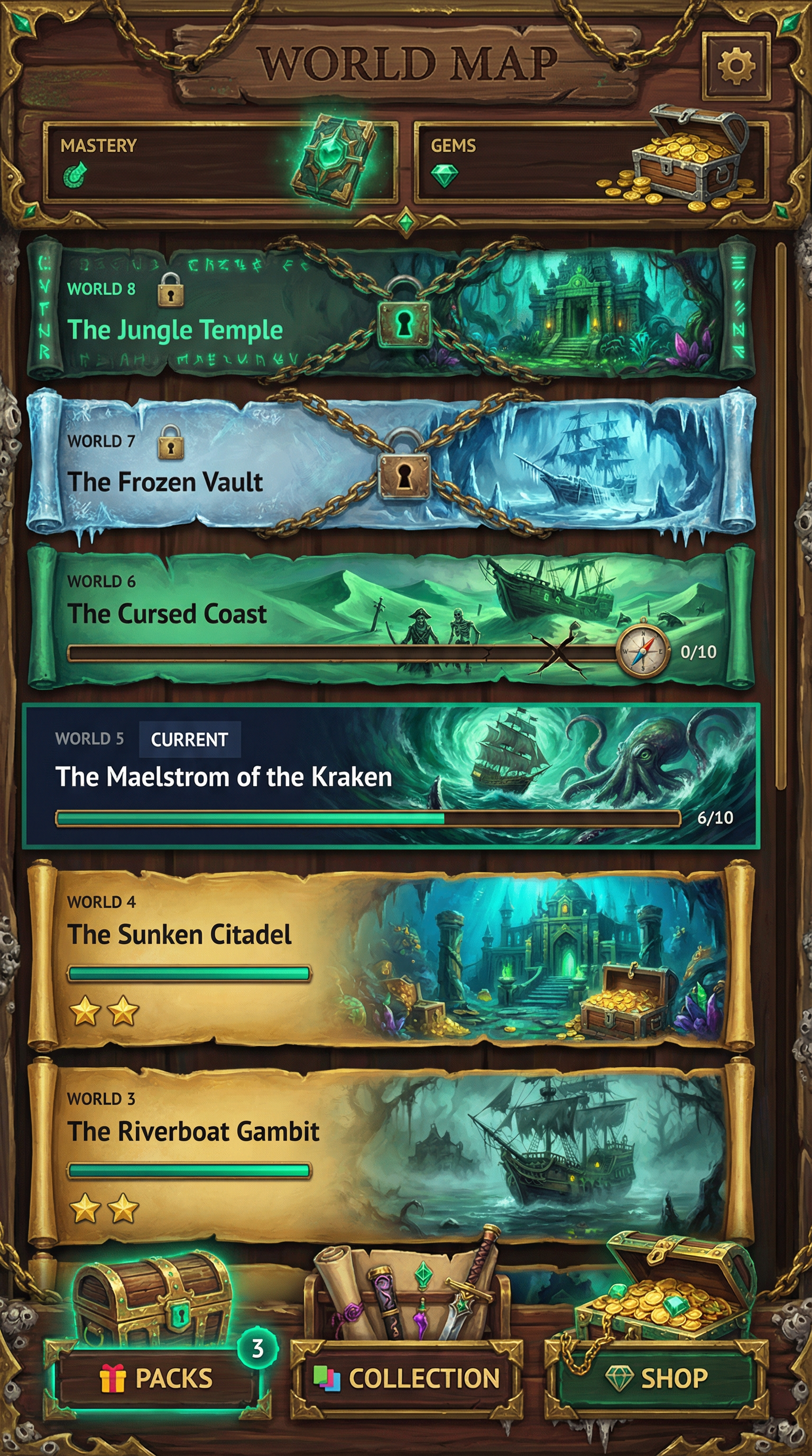 "Rich digital oil painting techniques with thick, expressive impasto brushstrokes and layered color blending. Soft, glowing ambient occlusion mixed with dramatic, saturated rim lighting. High-fidelity 2D fantasy rendering. Distinct, hand-crafted edge definition ensuring perfect readability for complex card illustrations and ornate UI frames.", - Concept: High-stakes supernatural pirate adventure on the High Seas. Captain's cabin of a legendary galleon navigating through a magical maelstrom - Palette: Deep Ocean Navy and Weathered Mahogany backgrounds, sharply contrasted with bright Tropical Emerald (magic/cursed elements) and Sunken Gold highlights. - Materials & Elements: Barnacle-encrusted wood, cursed parchment treasure maps, overflowing glowing doubloons, spinning brass compasses, and kraken motifs. - Atmosphere: Adventurous, dangerous, and 'Swashbuckling Mystery'. Weathered but highly stylized and legible., [UI/UX LAYOUT] - Core Structure: Respect reference layout. Thick beveled frames, high relief (extruded 3D look). Aggressive Z-depth drop shadows between all layers. - Interactions: Clickable buttons require pronounced inner 'Tropical Emerald' glow. Active foreground elements must have 40% more brightness/contrast than background. [CARD PROGRESSION MATRIX] Ornamental ladder scaling linearly by rarity: - Common: 'Weathered Mahogany' wood. Minimalist bevels, clean flat structural borders. No protruding elements. - Rare: Tarnished brass & rusted iron. Intricate nautical filigree (ropes/waves), double-tiered UI depth. - Epic: Premium 'Sunken Gold' with 'Tropical Emerald' glowing accents. Complex architectural relief with embedded brass compasses or barnacles in corners. - Legendary: Maximalist premium 'Sunken Gold'. Heavy thematic motifs (carved Kraken tentacles, cursed pirate skulls, heavy anchor chains) physically breaking the rectangular silhouette (protruding 3D elements)., [CONCEPT MAPPING] - Jokers -> THE CURSED CREW: Supernatural pirate specialists & swashbuckling rogues. Encased in weathered, heavy nautical frames. - Lucky Charms -> SUNKEN RELICS: Tangible cursed artifacts (Barnacle-encrusted compasses, kraken-tooth daggers, glowing messages in bottles). - Tarot -> CURSED CHARTS: Weathered parchment treasure maps, glowing 'X' marks, arcane navigation lines. - Planet -> ASTRAL ASTROLABES: Intricate brass navigation tools & glass buoys containing glowing trapped celestial energy. [THE CREW - SAMPLES] 1. THE BOATSWAIN (Heavy): Massive imposing cursed pirate, armor of shipwreck debris & hardened coral. Wielding heavy rusted ship's anchor on a chain. Brutal, intimidating posture. 2. THE SIREN BLADE (Assassin): Agile mysterious figure in eerie sea-mist & tattered aristocratic naval coats. Twin curved cutlasses dripping supernatural seawater. Stealthy, lethal posture. 3. THE POWDER-MONKEY (Specialist): Manic soot-covered pirate, holding multiple miniature gunpowder kegs with glowing magical emerald fuses. Chaotic, unpredictable posture., Pack Tier Differentiation (Standard vs. Premium): * Standard Asset: Single-layer design. Clean, functional geometry with minimal articulation or ornamental points. Uses basic surface textures. * Premium Asset: Multi-layered, high-complexity design. Must feature "mechanical intrigue" elements (e.g., dual latches, deep relief, intricate security features, or ornate filigree). Value is communicated through detail density per pixel and structural sophistication, not physical scale. Card Arrangement (Face-down State): * A set of 5 vertical rectangles (Card Backs). * Dynamic "Fan-out" or "Semi-circle" arrangement to simulate physical depth and perspective on the 3D plane. Backlight Aura: A peripheral light plane (halo) hidden behind the card edges. The "Epic Glow" (Visual Lead): * An expansive radiance effect using dynamic particles and light halos that "leak" past the card’s closed silhouette."