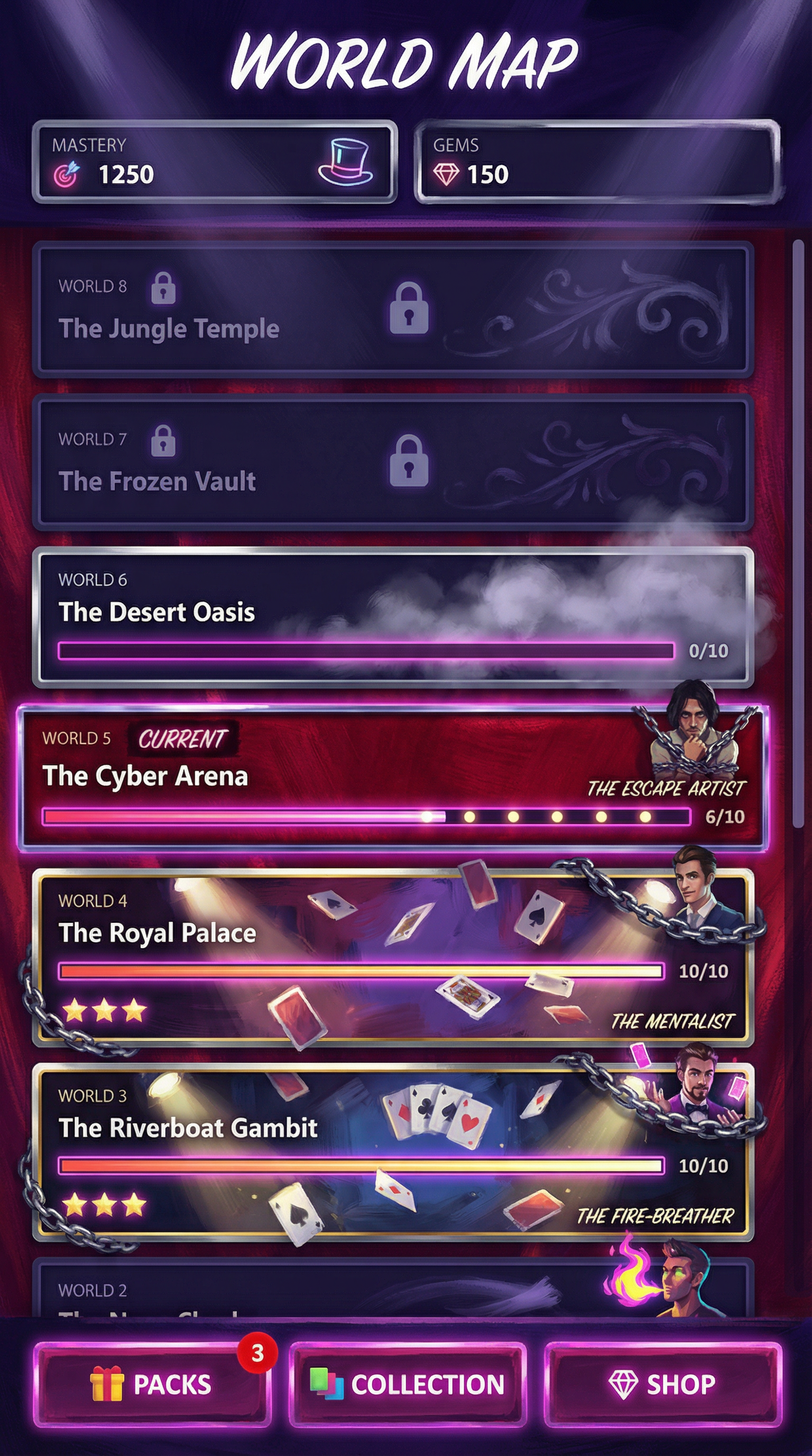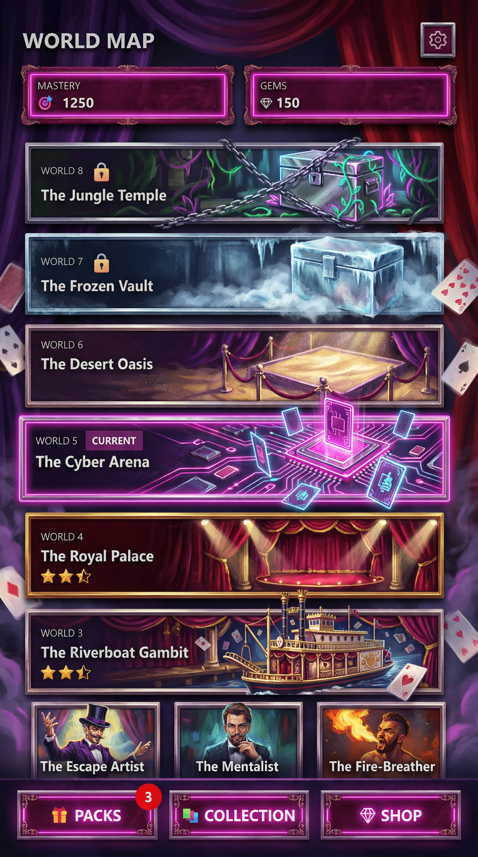 "Thick, expressive impressionist brushstrokes focusing on light and color dynamics over strict detail. Textured canvas materials with cinematic, dramatic lighting. Painterly 2D rendering prioritizing mood. Soft but readable silhouette definition for premium cinematic cards and immersive UI., - Concept: Backstage of a grandiose, world-renowned illusionist's theater. - Palette: Midnight Purple and Crimson Red backgrounds, sharply popping with bright Magician's White and Neon Magenta highlights. - Materials & Elements: Heavy theatrical velvet, polished chrome (escape-room locks), thick glowing smoke/fog, and floating playing cards suspended in mid-air. - Atmosphere: Mysterious, highly theatrical, and 'Captivating Wonder'. Dramatic high-contrast spotlighting., [UI/UX LAYOUT] - Core Structure: Respect reference layout. Thick beveled frames, high relief (extruded 3D look). - Interactions: Clickable buttons require pronounced inner 'Neon Magenta' glow and high-saliency color fills. - Depth & Hierarchy: Aggressive Z-depth drop shadows between all UI layers. Active foreground elements must have 40% more brightness/contrast than background. [CARD PROGRESSION MATRIX] Ornamental ladder scaling linearly by rarity: - Common: 'Midnight Purple' matte finish. Minimalist bevels, clean flat structural borders. No protruding elements. - Rare: Polished chrome. Intricate theatrical filigree (curtain ropes, subtle stage-smoke motifs), double-tiered UI depth. - Epic: Premium 'Crimson Red' velvet texture with 'Neon Magenta' glowing accents. Complex architectural relief with embedded miniature stage-lights or padlocks in corners. - Legendary: Maximalist premium theatrical framing. Heavy thematic motifs (floating playing cards, heavy chrome chains, spotlights emitting neon beams) physically breaking the rectangular silhouette (protruding 3D elements)., [CONCEPT MAPPING] - Jokers -> THE ILLUSIONISTS: Master magicians, escape artists, and theatrical performers. Encased in ornate, heavy stage-mirror frames. - Lucky Charms -> STAGE PROPS: Tangible illusionist gear (Trick top hats, heavy chained padlocks, glowing hypnotist pendulums, velvet blindfolds). - Tarot -> TRICK BLUEPRINTS: Folded theatrical schematics and stage plans, marked with glowing neon magenta diagrams and secret symbols. - Planet -> MYSTIC ORBS: Crystal gazing balls and theatrical smoke grenades containing swirling, trapped glowing gases. [THE CREW - SAMPLES] 1. THE ESCAPE ARTIST (Heavy): Muscular, intense performer heavily bound in thick metal chains and escape-room padlocks. Holding a bent lockpick. Tense, dramatic posture. 2. THE MENTALIST (Assassin): Elegant figure in sharp theatrical evening wear. Piercing gaze, levitating a glowing deck of cards or a neon pendulum. Mysterious, calculating posture. 3. THE FIRE-BREATHER (Specialist): Energetic theatrical performer surrounded by thick stage fog. Holding juggling rings emitting bright neon magenta flames. Dynamic, show-stopping posture., Pack Tier Differentiation (Standard vs. Premium): * Standard Asset: Single-layer design. Clean, functional geometry with minimal articulation or ornamental points. Uses basic surface textures. * Premium Asset: Multi-layered, high-complexity design. Must feature "mechanical intrigue" elements (e.g., dual latches, deep relief, intricate security features, or ornate filigree). Value is communicated through detail density per pixel and structural sophistication, not physical scale. Card Arrangement (Face-down State): * A set of 5 vertical rectangles (Card Backs). * Dynamic "Fan-out" or "Semi-circle" arrangement to simulate physical depth and perspective on the 3D plane. Backlight Aura: A peripheral light plane (halo) hidden behind the card edges. The "Epic Glow" (Visual Lead): * An expansive radiance effect using dynamic particles and light halos that "leak" past the card’s closed silhouette."