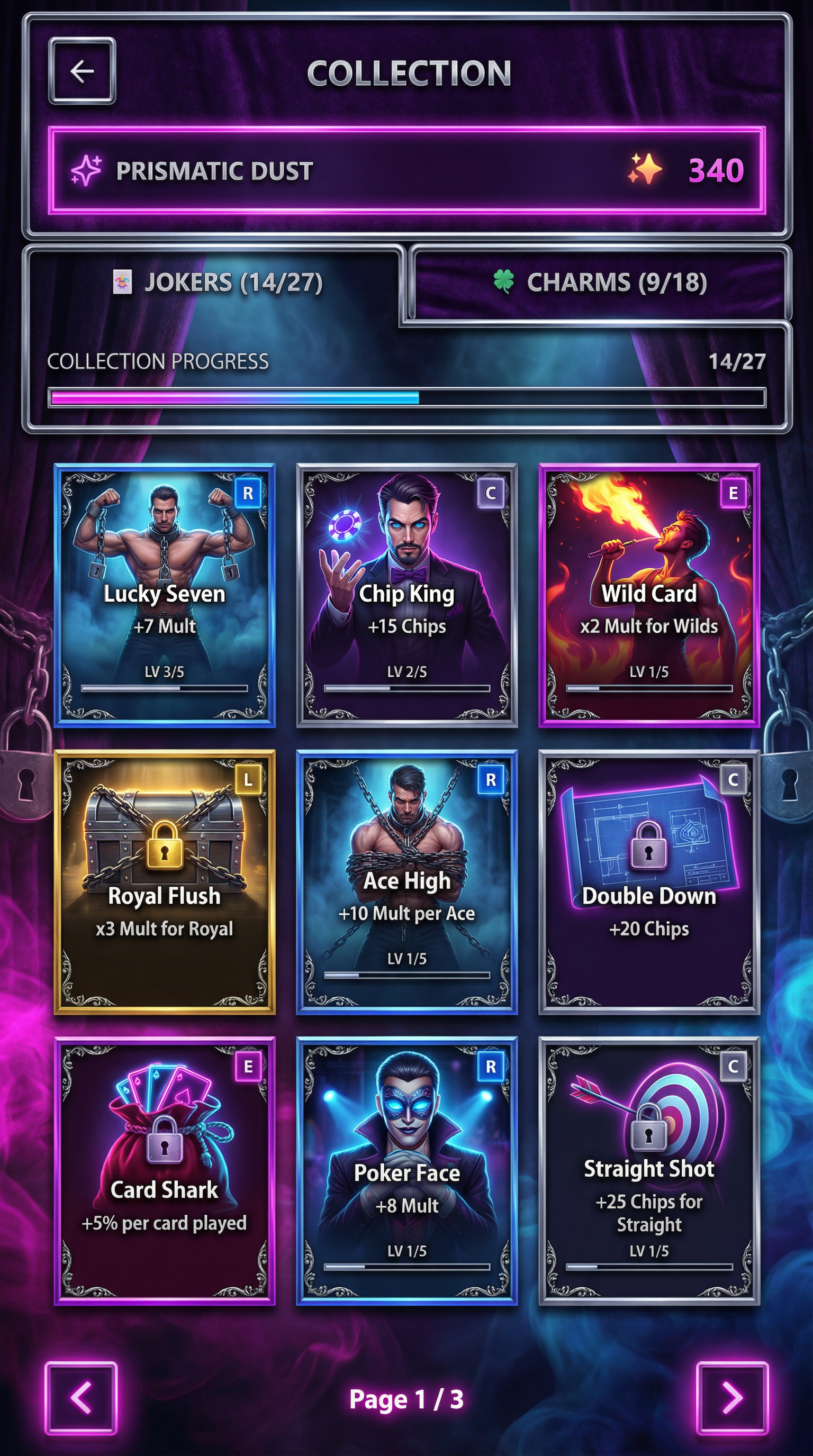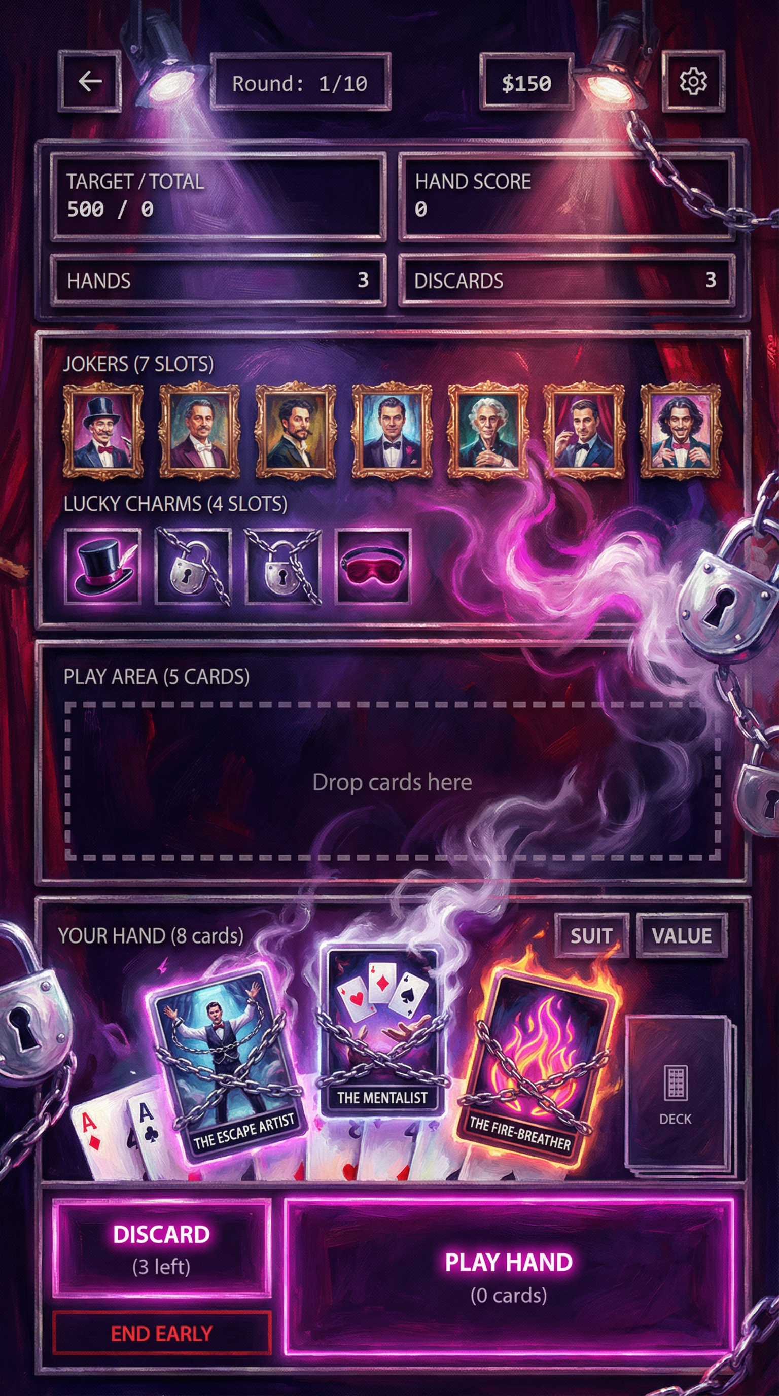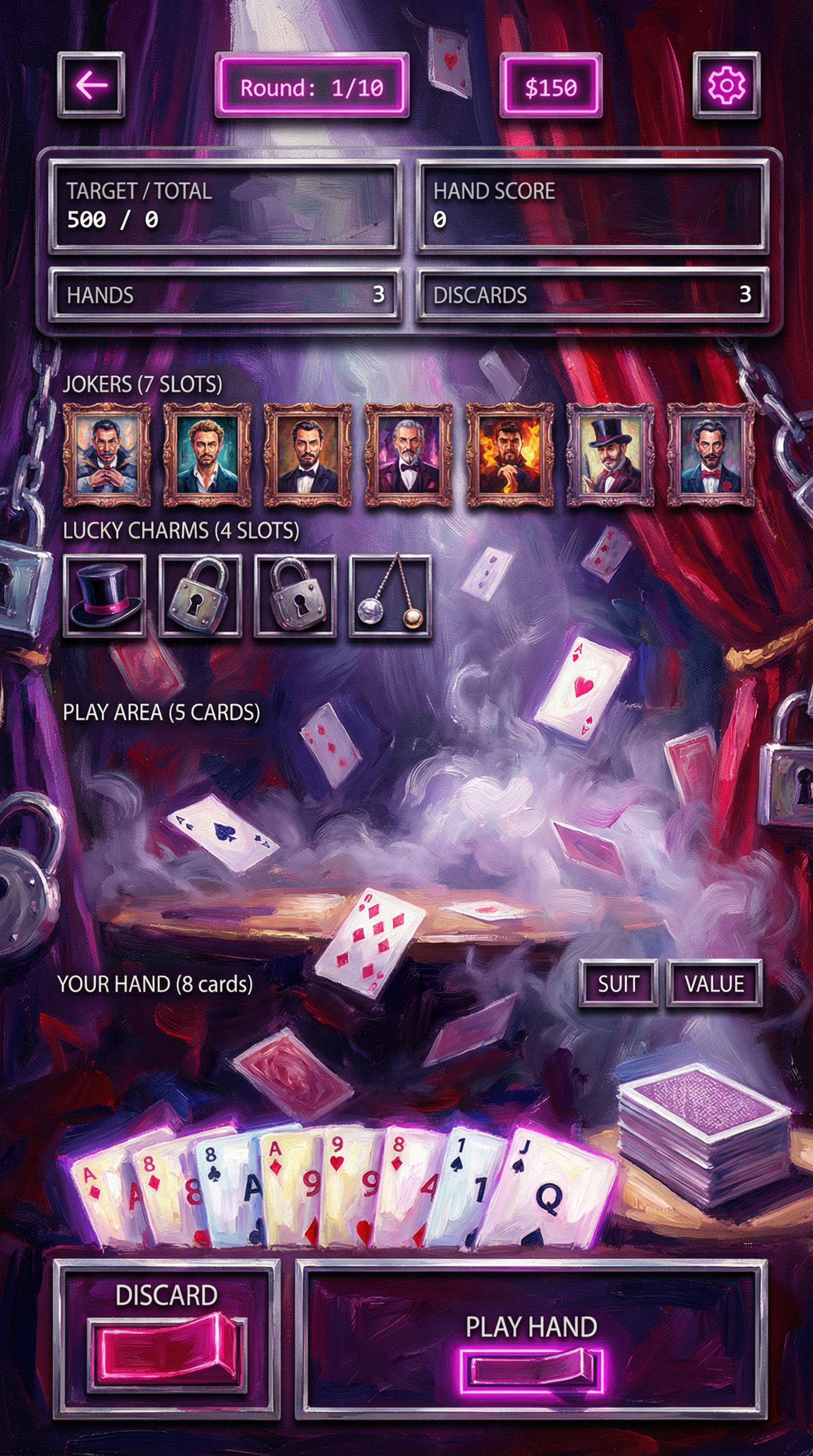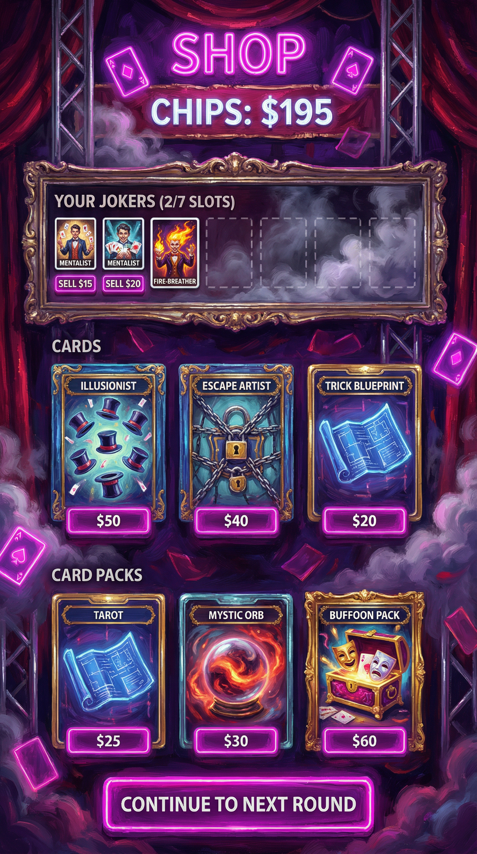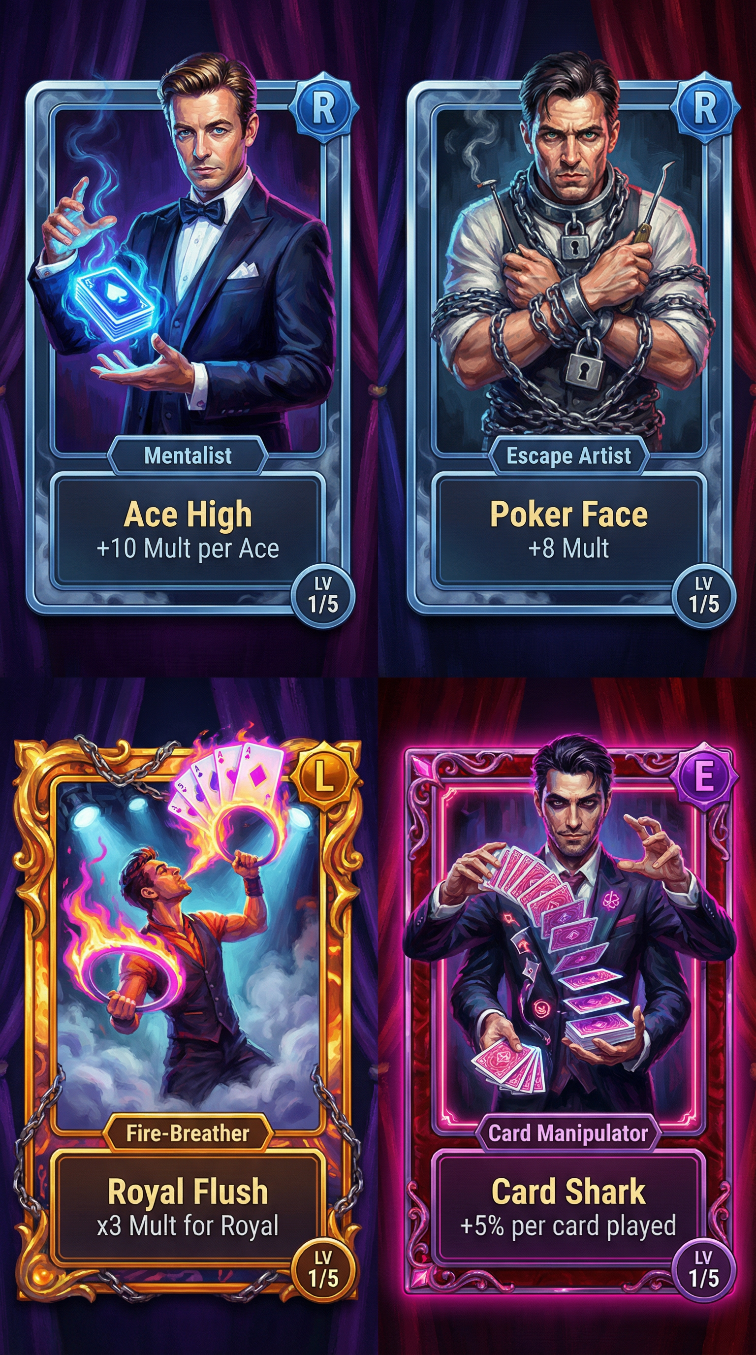 "Thick, expressive impressionist brushstrokes focusing on light and color dynamics over strict detail. Textured canvas materials with cinematic, dramatic lighting. Painterly 2D rendering prioritizing mood. Soft but readable silhouette definition for premium cinematic cards and immersive UI., - Concept: Backstage of a grandiose, world-renowned illusionist's theater. - Palette: Midnight Purple and Crimson Red backgrounds, sharply popping with bright Magician's White and Neon Magenta highlights. - Materials & Elements: Heavy theatrical velvet, polished chrome (escape-room locks), thick glowing smoke/fog, and floating playing cards suspended in mid-air. - Atmosphere: Mysterious, highly theatrical, and 'Captivating Wonder'. Dramatic high-contrast spotlighting., [UI/UX LAYOUT] - Core Structure: Respect reference layout. Thick beveled frames, high relief (extruded 3D look). - Interactions: Clickable buttons require pronounced inner 'Neon Magenta' glow and high-saliency color fills. - Depth & Hierarchy: Aggressive Z-depth drop shadows between all UI layers. Active foreground elements must have 40% more brightness/contrast than background. [CARD PROGRESSION MATRIX] Ornamental ladder scaling linearly by rarity: - Common: 'Midnight Purple' matte finish. Minimalist bevels, clean flat structural borders. No protruding elements. - Rare: Polished chrome. Intricate theatrical filigree (curtain ropes, subtle stage-smoke motifs), double-tiered UI depth. - Epic: Premium 'Crimson Red' velvet texture with 'Neon Magenta' glowing accents. Complex architectural relief with embedded miniature stage-lights or padlocks in corners. - Legendary: Maximalist premium theatrical framing. Heavy thematic motifs (floating playing cards, heavy chrome chains, spotlights emitting neon beams) physically breaking the rectangular silhouette (protruding 3D elements)., [CONCEPT MAPPING] - Jokers -> THE ILLUSIONISTS: Master magicians, escape artists, and theatrical performers. Encased in ornate, heavy stage-mirror frames. - Lucky Charms -> STAGE PROPS: Tangible illusionist gear (Trick top hats, heavy chained padlocks, glowing hypnotist pendulums, velvet blindfolds). - Tarot -> TRICK BLUEPRINTS: Folded theatrical schematics and stage plans, marked with glowing neon magenta diagrams and secret symbols. - Planet -> MYSTIC ORBS: Crystal gazing balls and theatrical smoke grenades containing swirling, trapped glowing gases. [THE CREW - SAMPLES] 1. THE ESCAPE ARTIST (Heavy): Muscular, intense performer heavily bound in thick metal chains and escape-room padlocks. Holding a bent lockpick. Tense, dramatic posture. 2. THE MENTALIST (Assassin): Elegant figure in sharp theatrical evening wear. Piercing gaze, levitating a glowing deck of cards or a neon pendulum. Mysterious, calculating posture. 3. THE FIRE-BREATHER (Specialist): Energetic theatrical performer surrounded by thick stage fog. Holding juggling rings emitting bright neon magenta flames. Dynamic, show-stopping posture., For Purchasable Cards: "Visual Hierarchy: Vertical card orientation divided into three functional zones. Primary Zone (60-70% height): A large, centered rectangular frame dedicated to the character portrait and character name. Rarity: A high-saliency badge or icon placeholder located in the top-right corner, integrated in the main portrait frame. Or different card frame per rarity of the card including integrating the badge. Rarity Color Scheme: Common: Grey. Rare: Blue. Epic: Purple. Legendary: Yellow-Orange, Golden Information Zone (25% height): A dedicated horizontal rectangular container at the bottom for ""Modifier Text"" and ""Effect Description"". Purchase Price. Cost for adquiring the card or pack. Item Type: A Tag that indicated the type of item we are purchasing. Z-Depth: Character portrait must overlap the top edge of its frame to create a pop-out effect." ------"