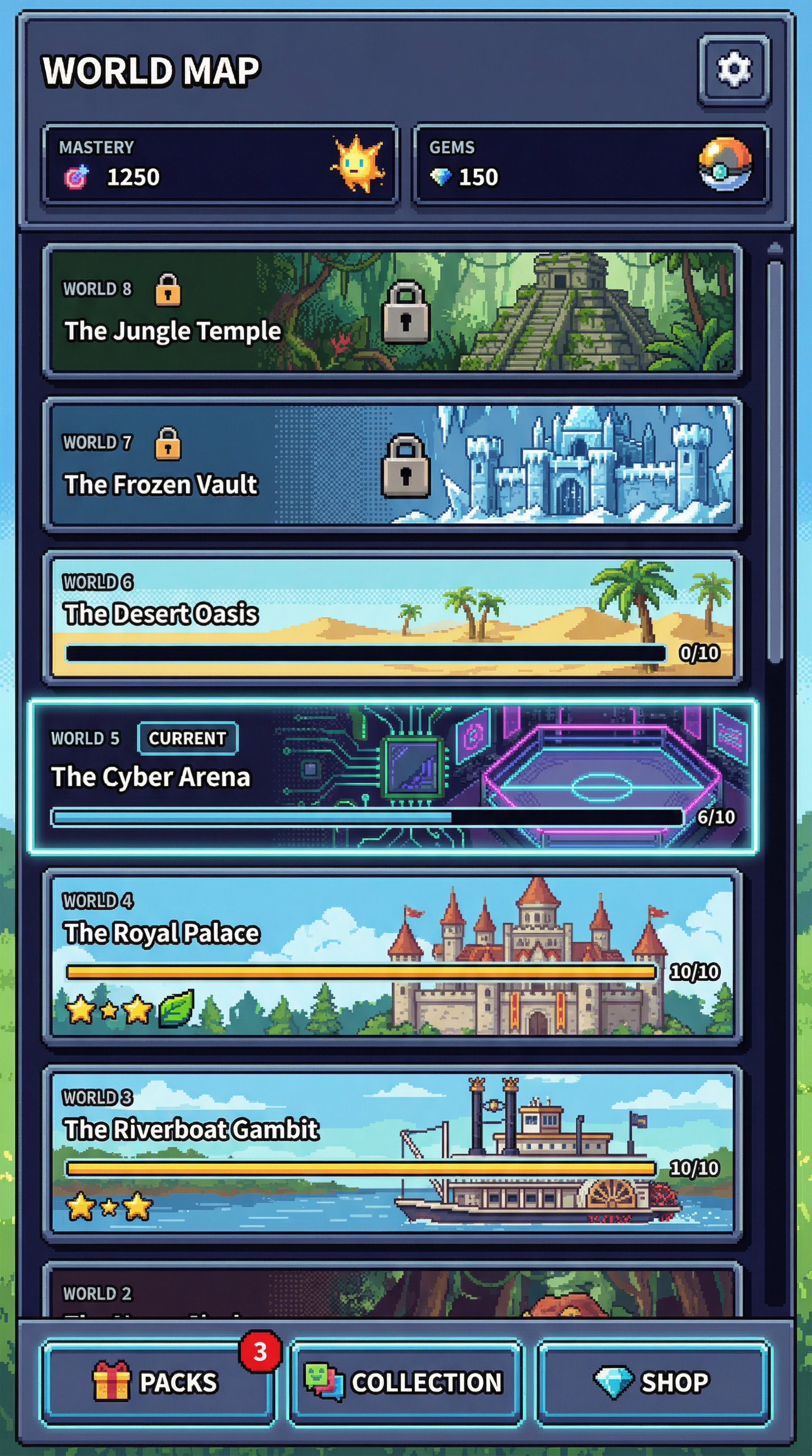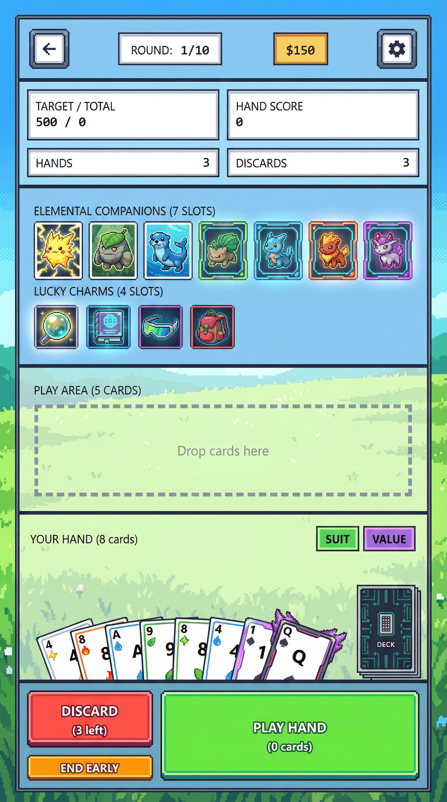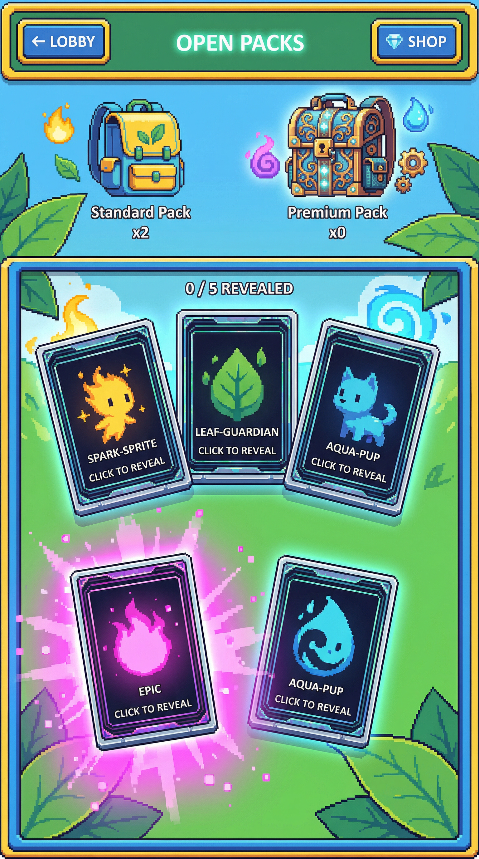 "Crisp, high-density 16-bit to 32-bit pixel art with meticulous manual dithering and pixel-perfect line work. Enhanced with modern rendering techniques including real-time dynamic bloom, volumetric lighting, and deep parallax layers. High-contrast, readable silhouettes specifically optimized for digital playing cards, floating icons, and retro-modern UI frames., - Concept: Sunny, optimistic creature-collecting adventure in a lush, vibrant ecosystem. A harmonious blend of wild, adorable elemental monsters, enthusiastic trainers, and sleek futuristic capturing technology. Colorful elemental critters gather. - Palette: Vibrant Meadow Green & Clear Sky Blue backgrounds, sharply contrasted with cheerful Electric Yellow & Bubblegum Pink highlights. - Materials & Elements: Oversized soft fantasy leaves, sleek spherical capturing devices, glowing holographic interfaces, and bright elemental energies (water/fire/spark). - Atmosphere: Cheerful, sunny, adventurous, and 'Cozy Creature Catching'. Highly stylized, vibrant, and welcoming., [UI/UX LAYOUT] - Core Structure: Respect reference layout. Thick beveled frames, high relief (extruded 3D look). - Interactions: Clickable buttons require pronounced inner glow and high-saliency color fills (using Theme's active color). - Depth & Hierarchy: Aggressive Z-depth drop shadows between all UI layers. Active foreground elements must have 40% more brightness/contrast than background. [CARD PROGRESSION MATRIX] Implement a Visual Complexity Ladder scaling linearly by rarity: - Common: Base theme material. Minimalist execution, clean flat structural borders. No protruding elements. - Rare: Refined theme material. Enhanced thematic detailing and secondary textures, double-tiered UI depth. - Epic: Premium theme material with active/glowing accents. Complex structural design with embedded thematic elements in the corners. - Legendary: Maximalist thematic expression. Heavy, high-impact motifs that physically break the rectangular silhouette (protruding 3D elements extending past the borders)., [CONCEPT MAPPING] - Replace Jokers with ELEMENTAL COMPANIONS: Adorable elemental creatures (Fire/Water/Leaf/Spark) in high-tech holographic frames. - Replace Lucky Charms with TRAINER GEAR: Tangible tech/tools (spherical catchers, glowing encyclopedias, visors, berry backpacks). - Replace Tarot with EVOLUTION STONES: Glowing crystalline stones radiating energy/sparks. - Replace Planet with HABITAT MODULES: Portable glowing terrariums with mini-biomes (volcanoes/coral reefs). [COMPANION SAMPLES] 1. SPARK-SPRITE: Tiny hyperactive creature of jagged yellow electricity/static fluff. Hovering, glowing cheeks. Playful pose. 2. LEAF-GUARDIAN: Stout mossy boulder monster, oversized green leaf armor. Rooted, protective pose. 3. AQUA-PUP: Sleek blue otter-like creature, hydrodynamic fins. Gliding on water. Alert pose., Pack Tier Differentiation (Standard vs. Premium): * Standard Asset: Single-layer design. Clean, functional geometry with minimal articulation or ornamental points. Uses basic surface textures. * Premium Asset: Multi-layered, high-complexity design. Must feature "mechanical intrigue" elements (e.g., dual latches, deep relief, intricate security features, or ornate filigree). Value is communicated through detail density per pixel and structural sophistication, not physical scale. Card Arrangement (Face-down State): * A set of 5 vertical rectangles (Card Backs). * Dynamic "Fan-out" or "Semi-circle" arrangement to simulate physical depth and perspective on the 3D plane. Backlight Aura: A peripheral light plane (halo) hidden behind the card edges. The "Epic Glow" (Visual Lead): * An expansive radiance effect using dynamic particles and light halos that "leak" past the card’s closed silhouette."