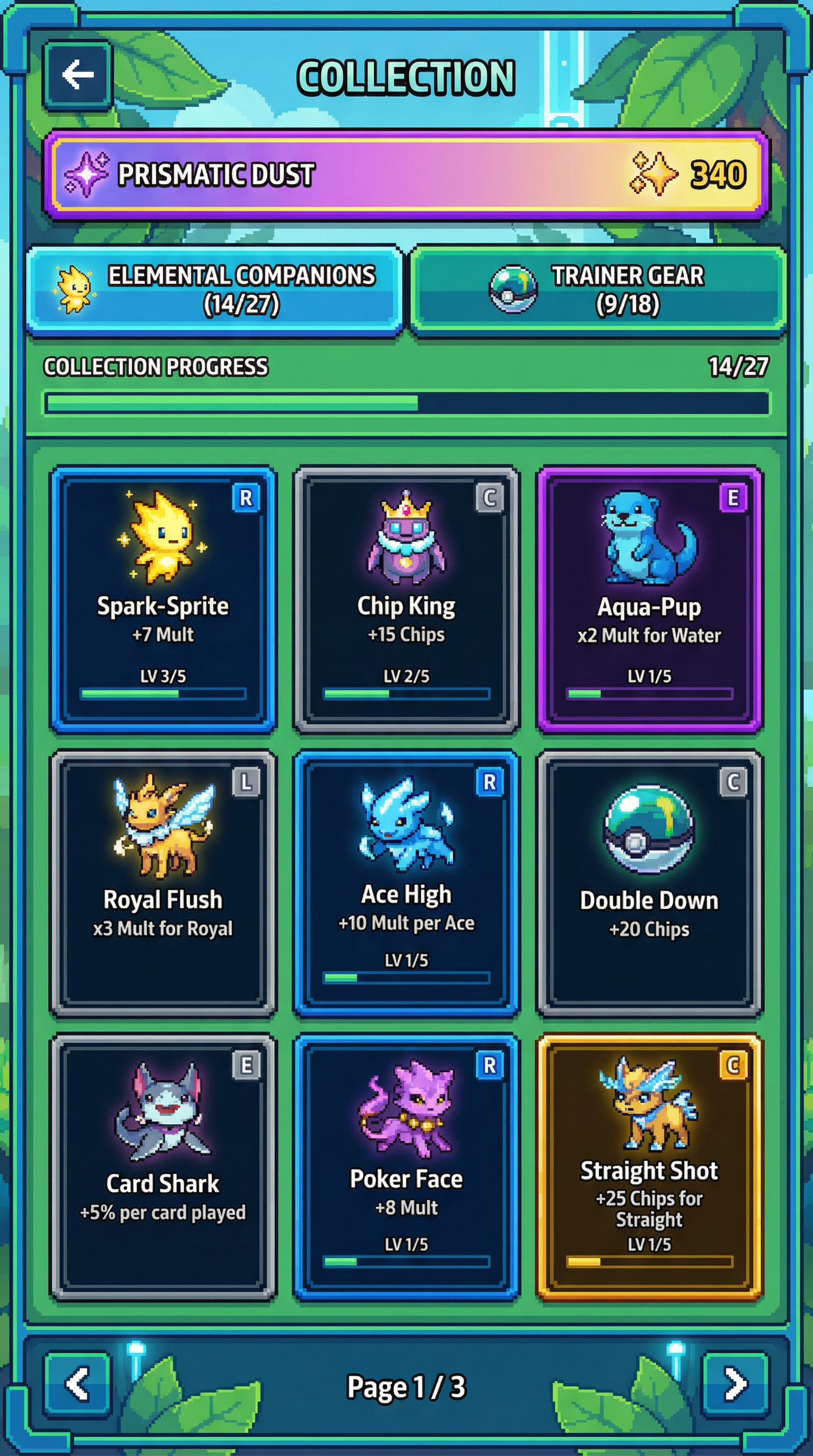 "Crisp, high-density 16-bit to 32-bit pixel art with meticulous manual dithering and pixel-perfect line work. Enhanced with modern rendering techniques including real-time dynamic bloom, volumetric lighting, and deep parallax layers. High-contrast, readable silhouettes specifically optimized for digital playing cards, floating icons, and retro-modern UI frames., - Concept: Sunny, optimistic creature-collecting adventure in a lush, vibrant ecosystem. A harmonious blend of wild, adorable elemental monsters, enthusiastic trainers, and sleek futuristic capturing technology. Colorful elemental critters gather. - Palette: Vibrant Meadow Green & Clear Sky Blue backgrounds, sharply contrasted with cheerful Electric Yellow & Bubblegum Pink highlights. - Materials & Elements: Oversized soft fantasy leaves, sleek spherical capturing devices, glowing holographic interfaces, and bright elemental energies (water/fire/spark). - Atmosphere: Cheerful, sunny, adventurous, and 'Cozy Creature Catching'. Highly stylized, vibrant, and welcoming., [UI/UX LAYOUT] - Core Structure: Respect reference layout. Thick beveled frames, high relief (extruded 3D look). - Interactions: Clickable buttons require pronounced inner glow and high-saliency color fills (using Theme's active color). - Depth & Hierarchy: Aggressive Z-depth drop shadows between all UI layers. Active foreground elements must have 40% more brightness/contrast than background. [CARD PROGRESSION MATRIX] Implement a Visual Complexity Ladder scaling linearly by rarity: - Common: Base theme material. Minimalist execution, clean flat structural borders. No protruding elements. - Rare: Refined theme material. Enhanced thematic detailing and secondary textures, double-tiered UI depth. - Epic: Premium theme material with active/glowing accents. Complex structural design with embedded thematic elements in the corners. - Legendary: Maximalist thematic expression. Heavy, high-impact motifs that physically break the rectangular silhouette (protruding 3D elements extending past the borders)., [CONCEPT MAPPING] - Replace Jokers with ELEMENTAL COMPANIONS: Adorable elemental creatures (Fire/Water/Leaf/Spark) in high-tech holographic frames. - Replace Lucky Charms with TRAINER GEAR: Tangible tech/tools (spherical catchers, glowing encyclopedias, visors, berry backpacks). - Replace Tarot with EVOLUTION STONES: Glowing crystalline stones radiating energy/sparks. - Replace Planet with HABITAT MODULES: Portable glowing terrariums with mini-biomes (volcanoes/coral reefs). [COMPANION SAMPLES] 1. SPARK-SPRITE: Tiny hyperactive creature of jagged yellow electricity/static fluff. Hovering, glowing cheeks. Playful pose. 2. LEAF-GUARDIAN: Stout mossy boulder monster, oversized green leaf armor. Rooted, protective pose. 3. AQUA-PUP: Sleek blue otter-like creature, hydrodynamic fins. Gliding on water. Alert pose., For Purchasable Cards: "Visual Hierarchy: Vertical card orientation divided into three functional zones. Primary Zone (60-70% height): A large, centered rectangular frame dedicated to the character portrait and character name. Rarity: A high-saliency badge or icon placeholder located in the top-right corner, integrated in the main portrait frame. Or different card frame per rarity of the card including integrating the badge. Rarity Color Scheme: Common: Grey. Rare: Blue. Epic: Purple. Legendary: Yellow-Orange, Golden Information Zone (25% height): A dedicated horizontal rectangular container at the bottom for ""Modifier Text"" and ""Effect Description"". Purchase Price. Cost for adquiring the card or pack. Item Type: A Tag that indicated the type of item we are purchasing. Z-Depth: Character portrait must overlap the top edge of its frame to create a pop-out effect." ------"