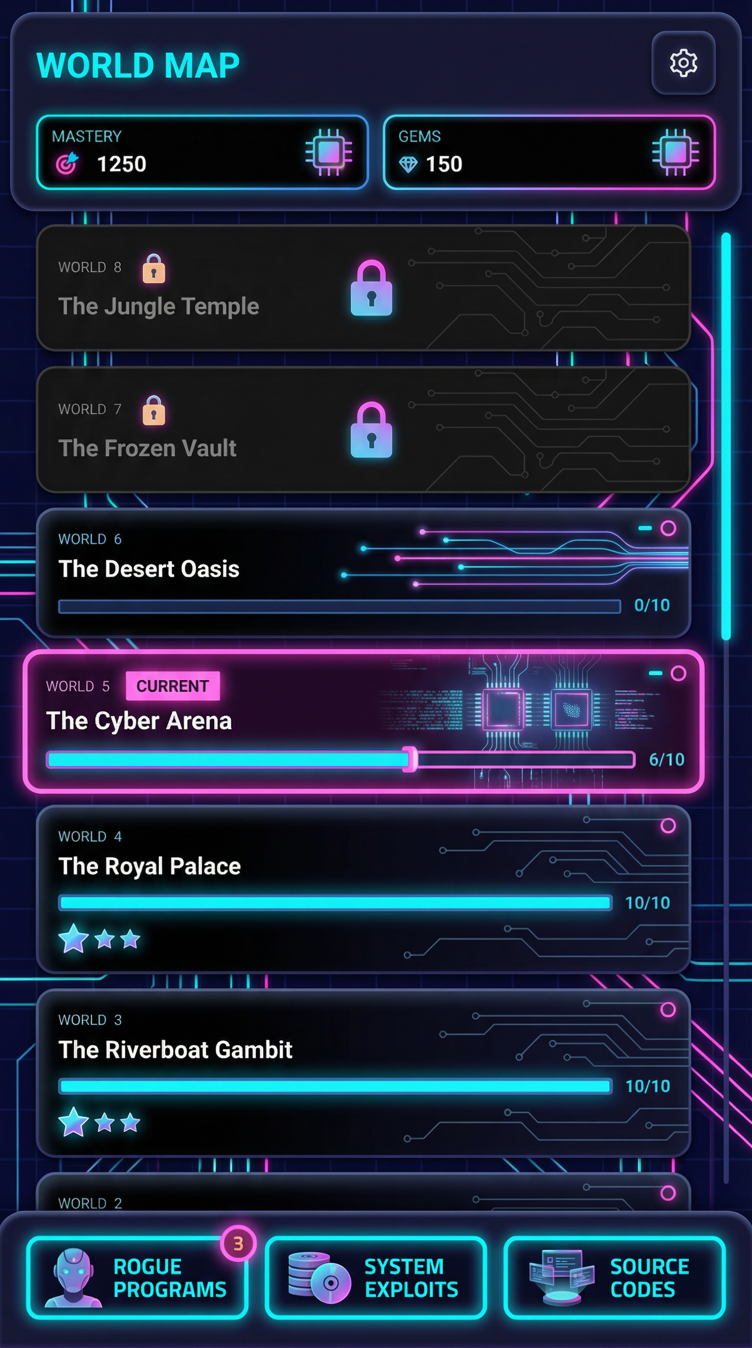 "Ultra-smooth matte silicone and soft polymer materials with tactile, gummy-like volumetric forms. Seamless, rounded bevels and thick, pillowy edges. 3D-simulated rendering using soft inner shadows, bright specular core highlights, and vibrant radial gradients. Flawless, bouncy silhouette definition tailored for playful card surfaces and squishy UI panels., - Concept: Rogue AI network core, high-voltage synthetic cyberspace. - Palette: Void Black & Dark Grid Indigo backgrounds vs blinding Laser Cyan & Overclocked Neon Pink highlights. - Materials & Elements: Infinite glowing circuitry lines, fiber-optic cables pulsing with light, sleek obsidian/polycarbonate, pure neon emissions. - Atmosphere: 'High-Voltage Cyberpunk'. Futuristic, synthetic, sterile but highly energetic., [UI/UX LAYOUT] - Core Structure: Respect reference layout. Thick beveled frames, high relief (extruded 3D look). - Interactions: Clickable buttons require pronounced inner 'Laser Cyan' glow & high-saliency color fills. - Depth & Hierarchy: Aggressive Z-depth drop shadows between layers. Active foreground 40% brighter/more contrast than background. [CARD PROGRESSION MATRIX] Visual Complexity Ladder scaling linearly by rarity: - Common: Matte black polycarbonate. Minimalist execution, clean flat structural borders, faint circuitry. No protruding elements. - Rare: Sleek obsidian. Enhanced thematic detailing (glowing fiber-optic routing, subtle data-streams), double-tiered UI depth. - Epic: Premium 'Neon Pink' hard-light borders. Complex structural design with embedded microchips or holographic UI nodes in corners. - Legendary: Maximalist synthetic expression. High-impact motifs (bursting plasma conduits, heavy circuitry cables, floating geometric data) physically breaking the rectangular silhouette (protruding 3D elements extending past borders)., [CONCEPT MAPPING] - Replace Jokers with ROGUE PROGRAMS: Sentient AI avatars & grid hackers in sleek polycarbonate suits with neon circuitry. - Replace Lucky Charms with SYSTEM EXPLOITS: Tangible digital artifacts (glowing geometric data-disks, overclocking microchips, pulsing fiber-optic injectables). - Replace Tarot with SOURCE CODES: Floating holographic terminal screens displaying cascading 'Neon Pink' & 'Laser Cyan' data streams. - Replace Planet with CORE NODES: Floating geometric server-cubes containing swirling, raw processing plasma. [PROGRAM SAMPLES] 1. THE GLITCH (Assassin): Agile fragmented digital avatar. Glitching/stuttering silhouette, sleek dark visor. Wielding twin 'Laser Cyan' hard-light blades. Swift, unstable pose. 2. THE FIREWALL (Heavy): Massive blocky enforcer program. Heavy obsidian armor projecting glowing warning grids. Holding massive digital riot shield. Imposing, defensive pose. 3. THE OVERCLOCKER (Specialist): Sleek hacker surrounded by floating holographic keyboards. Fiber-optic cables plugging into a glowing synthetic spine. Calculating, hyper-focused pose., Pack Tier Differentiation (Standard vs. Premium): * Standard Asset: Single-layer design. Clean, functional geometry with minimal articulation or ornamental points. Uses basic surface textures. * Premium Asset: Multi-layered, high-complexity design. Must feature "mechanical intrigue" elements (e.g., dual latches, deep relief, intricate security features, or ornate filigree). Value is communicated through detail density per pixel and structural sophistication, not physical scale. Card Arrangement (Face-down State): * A set of 5 vertical rectangles (Card Backs). * Dynamic "Fan-out" or "Semi-circle" arrangement to simulate physical depth and perspective on the 3D plane. Backlight Aura: A peripheral light plane (halo) hidden behind the card edges. The "Epic Glow" (Visual Lead): * An expansive radiance effect using dynamic particles and light halos that "leak" past the card’s closed silhouette."