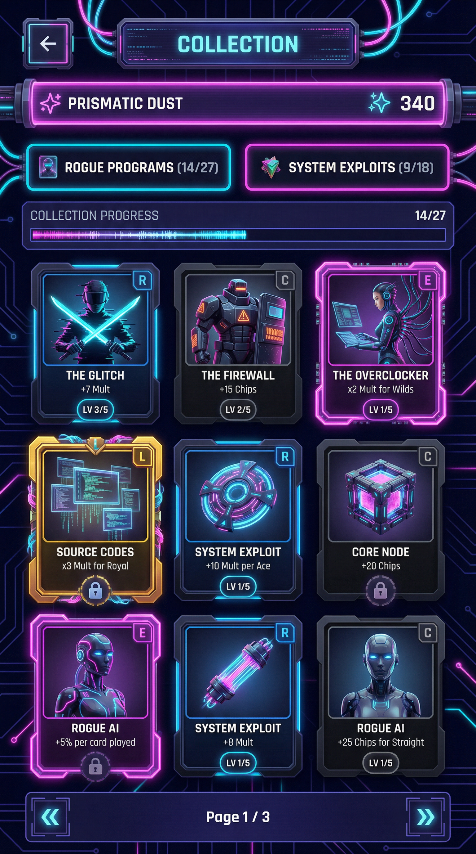 "Ultra-smooth matte silicone and soft polymer materials with tactile, gummy-like volumetric forms. Seamless, rounded bevels and thick, pillowy edges. 3D-simulated rendering using soft inner shadows, bright specular core highlights, and vibrant radial gradients. Flawless, bouncy silhouette definition tailored for playful card surfaces and squishy UI panels., - Concept: Rogue AI network core, high-voltage synthetic cyberspace. - Palette: Void Black & Dark Grid Indigo backgrounds vs blinding Laser Cyan & Overclocked Neon Pink highlights. - Materials & Elements: Infinite glowing circuitry lines, fiber-optic cables pulsing with light, sleek obsidian/polycarbonate, pure neon emissions. - Atmosphere: 'High-Voltage Cyberpunk'. Futuristic, synthetic, sterile but highly energetic., [UI/UX LAYOUT] - Core Structure: Respect reference layout. Thick beveled frames, high relief (extruded 3D look). - Interactions: Clickable buttons require pronounced inner 'Laser Cyan' glow & high-saliency color fills. - Depth & Hierarchy: Aggressive Z-depth drop shadows between layers. Active foreground 40% brighter/more contrast than background. [CARD PROGRESSION MATRIX] Visual Complexity Ladder scaling linearly by rarity: - Common: Matte black polycarbonate. Minimalist execution, clean flat structural borders, faint circuitry. No protruding elements. - Rare: Sleek obsidian. Enhanced thematic detailing (glowing fiber-optic routing, subtle data-streams), double-tiered UI depth. - Epic: Premium 'Neon Pink' hard-light borders. Complex structural design with embedded microchips or holographic UI nodes in corners. - Legendary: Maximalist synthetic expression. High-impact motifs (bursting plasma conduits, heavy circuitry cables, floating geometric data) physically breaking the rectangular silhouette (protruding 3D elements extending past borders)., [CONCEPT MAPPING] - Replace Jokers with ROGUE PROGRAMS: Sentient AI avatars & grid hackers in sleek polycarbonate suits with neon circuitry. - Replace Lucky Charms with SYSTEM EXPLOITS: Tangible digital artifacts (glowing geometric data-disks, overclocking microchips, pulsing fiber-optic injectables). - Replace Tarot with SOURCE CODES: Floating holographic terminal screens displaying cascading 'Neon Pink' & 'Laser Cyan' data streams. - Replace Planet with CORE NODES: Floating geometric server-cubes containing swirling, raw processing plasma. [PROGRAM SAMPLES] 1. THE GLITCH (Assassin): Agile fragmented digital avatar. Glitching/stuttering silhouette, sleek dark visor. Wielding twin 'Laser Cyan' hard-light blades. Swift, unstable pose. 2. THE FIREWALL (Heavy): Massive blocky enforcer program. Heavy obsidian armor projecting glowing warning grids. Holding massive digital riot shield. Imposing, defensive pose. 3. THE OVERCLOCKER (Specialist): Sleek hacker surrounded by floating holographic keyboards. Fiber-optic cables plugging into a glowing synthetic spine. Calculating, hyper-focused pose., For Purchasable Cards: "Visual Hierarchy: Vertical card orientation divided into three functional zones. Primary Zone (60-70% height): A large, centered rectangular frame dedicated to the character portrait and character name. Rarity: A high-saliency badge or icon placeholder located in the top-right corner, integrated in the main portrait frame. Or different card frame per rarity of the card including integrating the badge. Rarity Color Scheme: Common: Grey. Rare: Blue. Epic: Purple. Legendary: Yellow-Orange, Golden Information Zone (25% height): A dedicated horizontal rectangular container at the bottom for ""Modifier Text"" and ""Effect Description"". Purchase Price. Cost for adquiring the card or pack. Item Type: A Tag that indicated the type of item we are purchasing. Z-Depth: Character portrait must overlap the top edge of its frame to create a pop-out effect." ------"