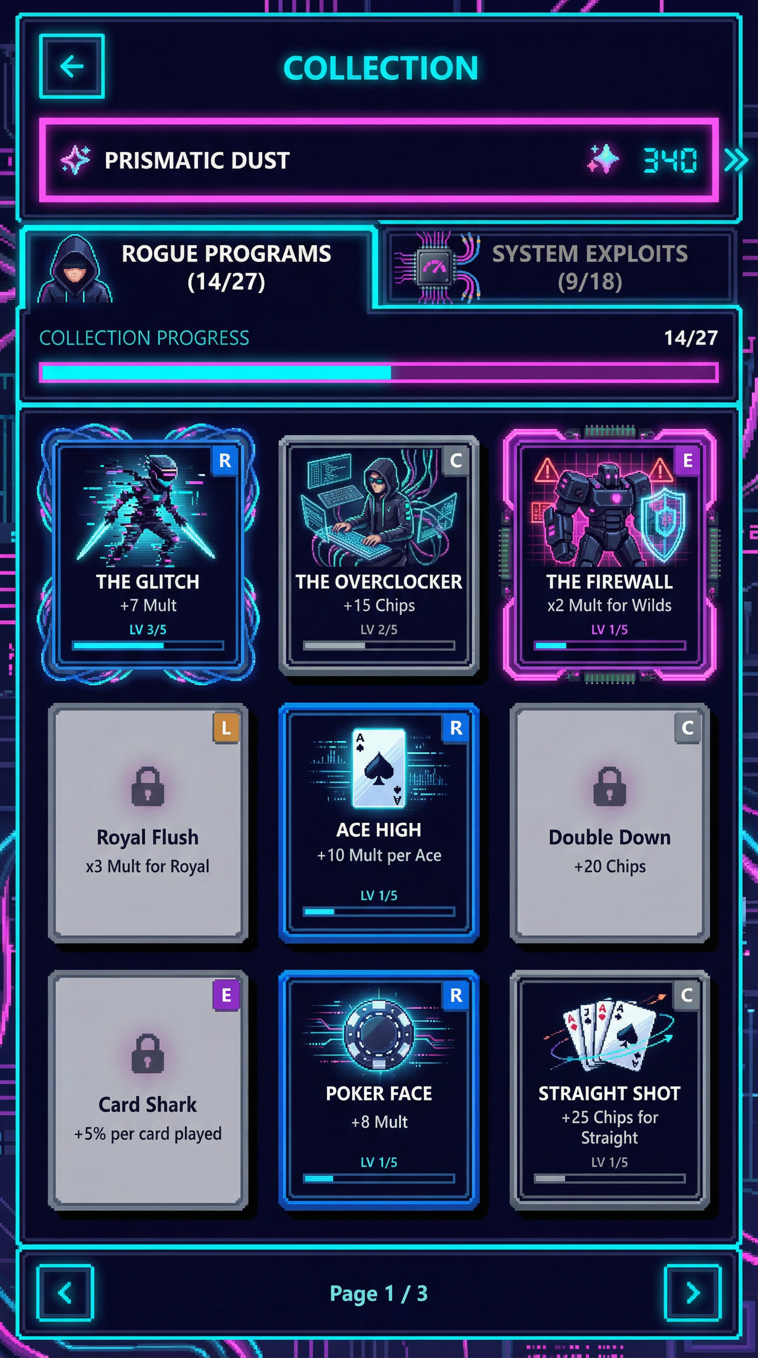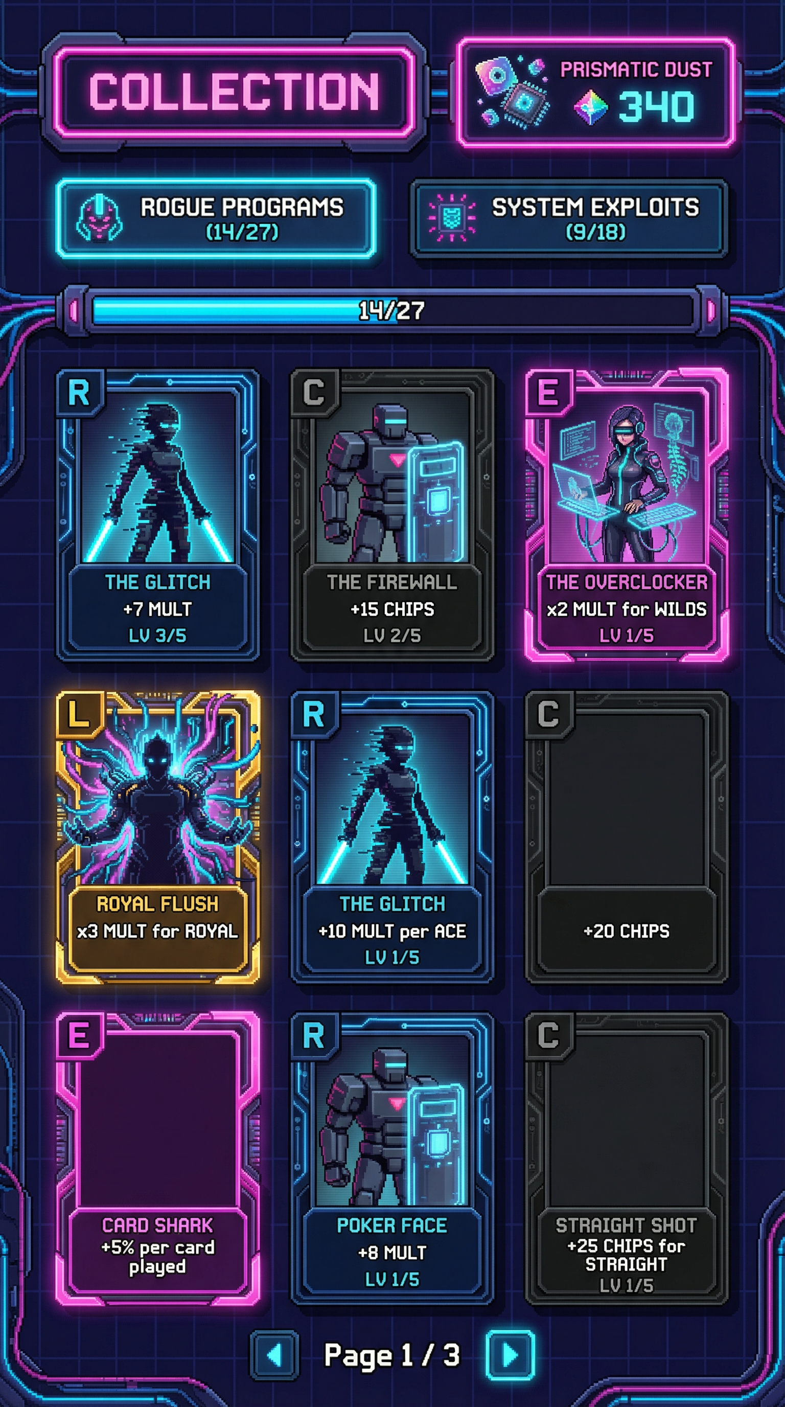 "Crisp, high-density 16-bit to 32-bit pixel art with meticulous manual dithering and pixel-perfect line work. Enhanced with modern rendering techniques including real-time dynamic bloom, volumetric lighting, and deep parallax layers. High-contrast, readable silhouettes specifically optimized for digital playing cards, floating icons, and retro-modern UI frames., - Concept: Rogue AI network core, high-voltage synthetic cyberspace. - Palette: Void Black & Dark Grid Indigo backgrounds vs blinding Laser Cyan & Overclocked Neon Pink highlights. - Materials & Elements: Infinite glowing circuitry lines, fiber-optic cables pulsing with light, sleek obsidian/polycarbonate, pure neon emissions. - Atmosphere: 'High-Voltage Cyberpunk'. Futuristic, synthetic, sterile but highly energetic., [UI/UX LAYOUT] - Core Structure: Respect reference layout. Thick beveled frames, high relief (extruded 3D look). - Interactions: Clickable buttons require pronounced inner 'Laser Cyan' glow & high-saliency color fills. - Depth & Hierarchy: Aggressive Z-depth drop shadows between layers. Active foreground 40% brighter/more contrast than background. [CARD PROGRESSION MATRIX] Visual Complexity Ladder scaling linearly by rarity: - Common: Matte black polycarbonate. Minimalist execution, clean flat structural borders, faint circuitry. No protruding elements. - Rare: Sleek obsidian. Enhanced thematic detailing (glowing fiber-optic routing, subtle data-streams), double-tiered UI depth. - Epic: Premium 'Neon Pink' hard-light borders. Complex structural design with embedded microchips or holographic UI nodes in corners. - Legendary: Maximalist synthetic expression. High-impact motifs (bursting plasma conduits, heavy circuitry cables, floating geometric data) physically breaking the rectangular silhouette (protruding 3D elements extending past borders)., [CONCEPT MAPPING] - Replace Jokers with ROGUE PROGRAMS: Sentient AI avatars & grid hackers in sleek polycarbonate suits with neon circuitry. - Replace Lucky Charms with SYSTEM EXPLOITS: Tangible digital artifacts (glowing geometric data-disks, overclocking microchips, pulsing fiber-optic injectables). - Replace Tarot with SOURCE CODES: Floating holographic terminal screens displaying cascading 'Neon Pink' & 'Laser Cyan' data streams. - Replace Planet with CORE NODES: Floating geometric server-cubes containing swirling, raw processing plasma. [PROGRAM SAMPLES] 1. THE GLITCH (Assassin): Agile fragmented digital avatar. Glitching/stuttering silhouette, sleek dark visor. Wielding twin 'Laser Cyan' hard-light blades. Swift, unstable pose. 2. THE FIREWALL (Heavy): Massive blocky enforcer program. Heavy obsidian armor projecting glowing warning grids. Holding massive digital riot shield. Imposing, defensive pose. 3. THE OVERCLOCKER (Specialist): Sleek hacker surrounded by floating holographic keyboards. Fiber-optic cables plugging into a glowing synthetic spine. Calculating, hyper-focused pose., For Purchasable Cards: "Visual Hierarchy: Vertical card orientation divided into three functional zones. Primary Zone (60-70% height): A large, centered rectangular frame dedicated to the character portrait and character name. Rarity: A high-saliency badge or icon placeholder located in the top-right corner, integrated in the main portrait frame. Or different card frame per rarity of the card including integrating the badge. Rarity Color Scheme: Common: Grey. Rare: Blue. Epic: Purple. Legendary: Yellow-Orange, Golden Information Zone (25% height): A dedicated horizontal rectangular container at the bottom for ""Modifier Text"" and ""Effect Description"". Purchase Price. Cost for adquiring the card or pack. Item Type: A Tag that indicated the type of item we are purchasing. Z-Depth: Character portrait must overlap the top edge of its frame to create a pop-out effect." ------"