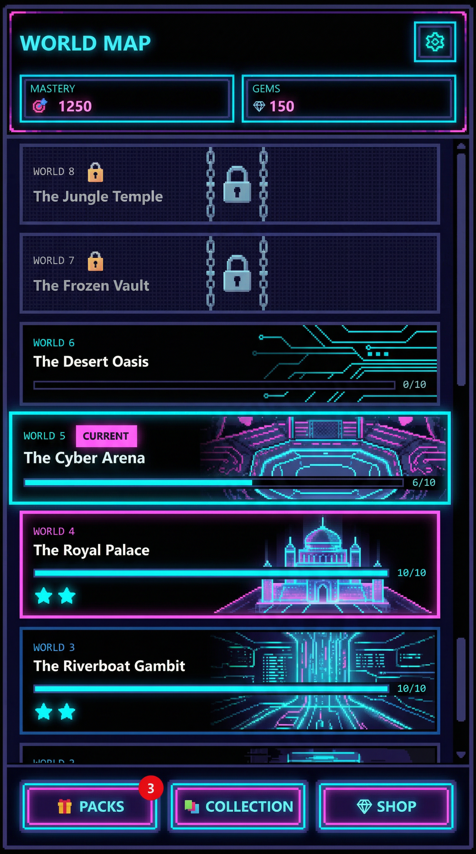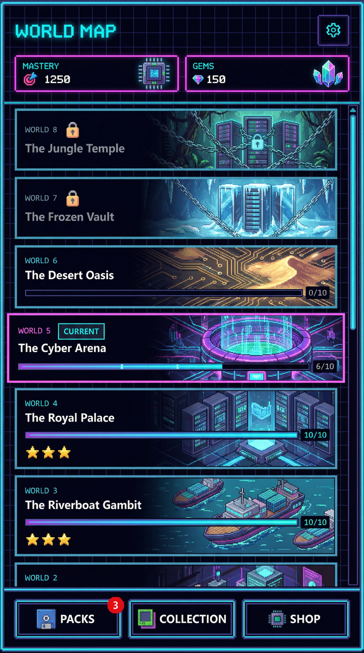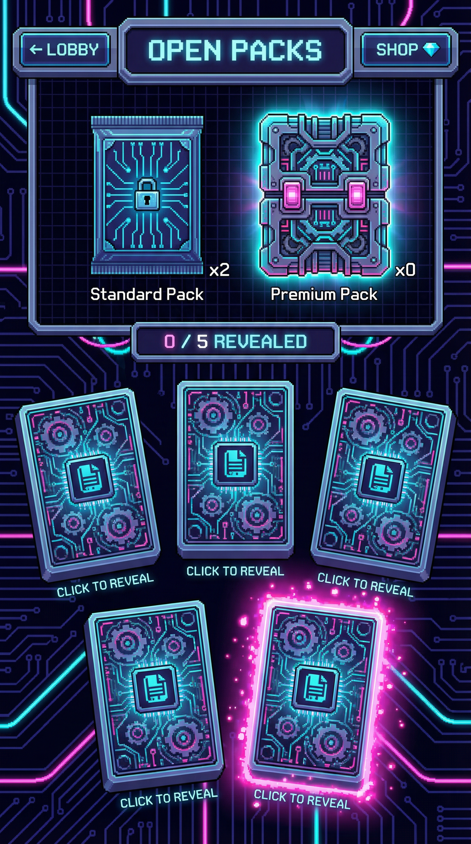 "Crisp, high-density 16-bit to 32-bit pixel art with meticulous manual dithering and pixel-perfect line work. Enhanced with modern rendering techniques including real-time dynamic bloom, volumetric lighting, and deep parallax layers. High-contrast, readable silhouettes specifically optimized for digital playing cards, floating icons, and retro-modern UI frames., - Concept: Rogue AI network core, high-voltage synthetic cyberspace. - Palette: Void Black & Dark Grid Indigo backgrounds vs blinding Laser Cyan & Overclocked Neon Pink highlights. - Materials & Elements: Infinite glowing circuitry lines, fiber-optic cables pulsing with light, sleek obsidian/polycarbonate, pure neon emissions. - Atmosphere: 'High-Voltage Cyberpunk'. Futuristic, synthetic, sterile but highly energetic., [UI/UX LAYOUT] - Core Structure: Respect reference layout. Thick beveled frames, high relief (extruded 3D look). - Interactions: Clickable buttons require pronounced inner 'Laser Cyan' glow & high-saliency color fills. - Depth & Hierarchy: Aggressive Z-depth drop shadows between layers. Active foreground 40% brighter/more contrast than background. [CARD PROGRESSION MATRIX] Visual Complexity Ladder scaling linearly by rarity: - Common: Matte black polycarbonate. Minimalist execution, clean flat structural borders, faint circuitry. No protruding elements. - Rare: Sleek obsidian. Enhanced thematic detailing (glowing fiber-optic routing, subtle data-streams), double-tiered UI depth. - Epic: Premium 'Neon Pink' hard-light borders. Complex structural design with embedded microchips or holographic UI nodes in corners. - Legendary: Maximalist synthetic expression. High-impact motifs (bursting plasma conduits, heavy circuitry cables, floating geometric data) physically breaking the rectangular silhouette (protruding 3D elements extending past borders)., [CONCEPT MAPPING] - Replace Jokers with ROGUE PROGRAMS: Sentient AI avatars & grid hackers in sleek polycarbonate suits with neon circuitry. - Replace Lucky Charms with SYSTEM EXPLOITS: Tangible digital artifacts (glowing geometric data-disks, overclocking microchips, pulsing fiber-optic injectables). - Replace Tarot with SOURCE CODES: Floating holographic terminal screens displaying cascading 'Neon Pink' & 'Laser Cyan' data streams. - Replace Planet with CORE NODES: Floating geometric server-cubes containing swirling, raw processing plasma. [PROGRAM SAMPLES] 1. THE GLITCH (Assassin): Agile fragmented digital avatar. Glitching/stuttering silhouette, sleek dark visor. Wielding twin 'Laser Cyan' hard-light blades. Swift, unstable pose. 2. THE FIREWALL (Heavy): Massive blocky enforcer program. Heavy obsidian armor projecting glowing warning grids. Holding massive digital riot shield. Imposing, defensive pose. 3. THE OVERCLOCKER (Specialist): Sleek hacker surrounded by floating holographic keyboards. Fiber-optic cables plugging into a glowing synthetic spine. Calculating, hyper-focused pose., Pack Tier Differentiation (Standard vs. Premium): * Standard Asset: Single-layer design. Clean, functional geometry with minimal articulation or ornamental points. Uses basic surface textures. * Premium Asset: Multi-layered, high-complexity design. Must feature "mechanical intrigue" elements (e.g., dual latches, deep relief, intricate security features, or ornate filigree). Value is communicated through detail density per pixel and structural sophistication, not physical scale. Card Arrangement (Face-down State): * A set of 5 vertical rectangles (Card Backs). * Dynamic "Fan-out" or "Semi-circle" arrangement to simulate physical depth and perspective on the 3D plane. Backlight Aura: A peripheral light plane (halo) hidden behind the card edges. The "Epic Glow" (Visual Lead): * An expansive radiance effect using dynamic particles and light halos that "leak" past the card’s closed silhouette."