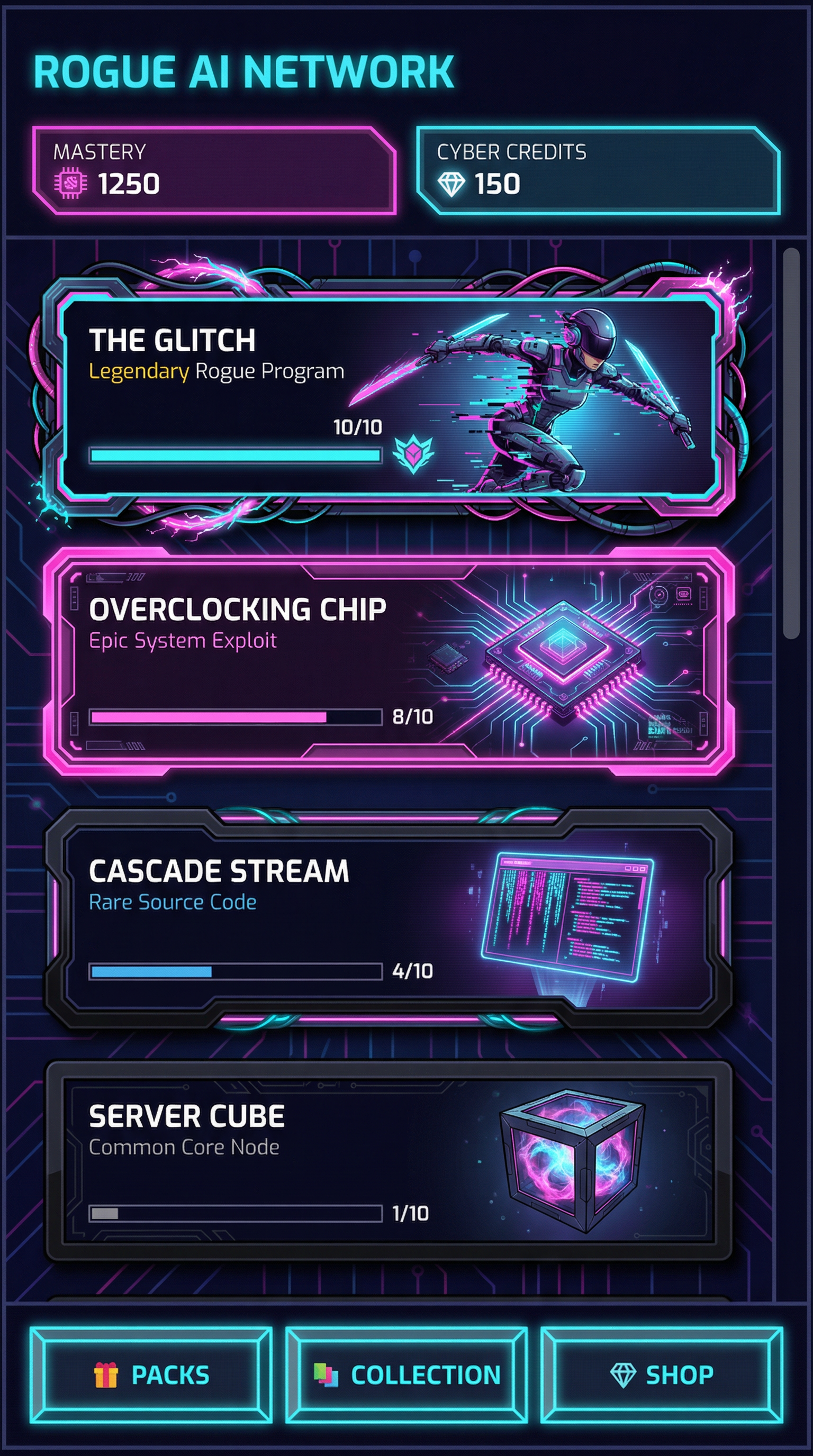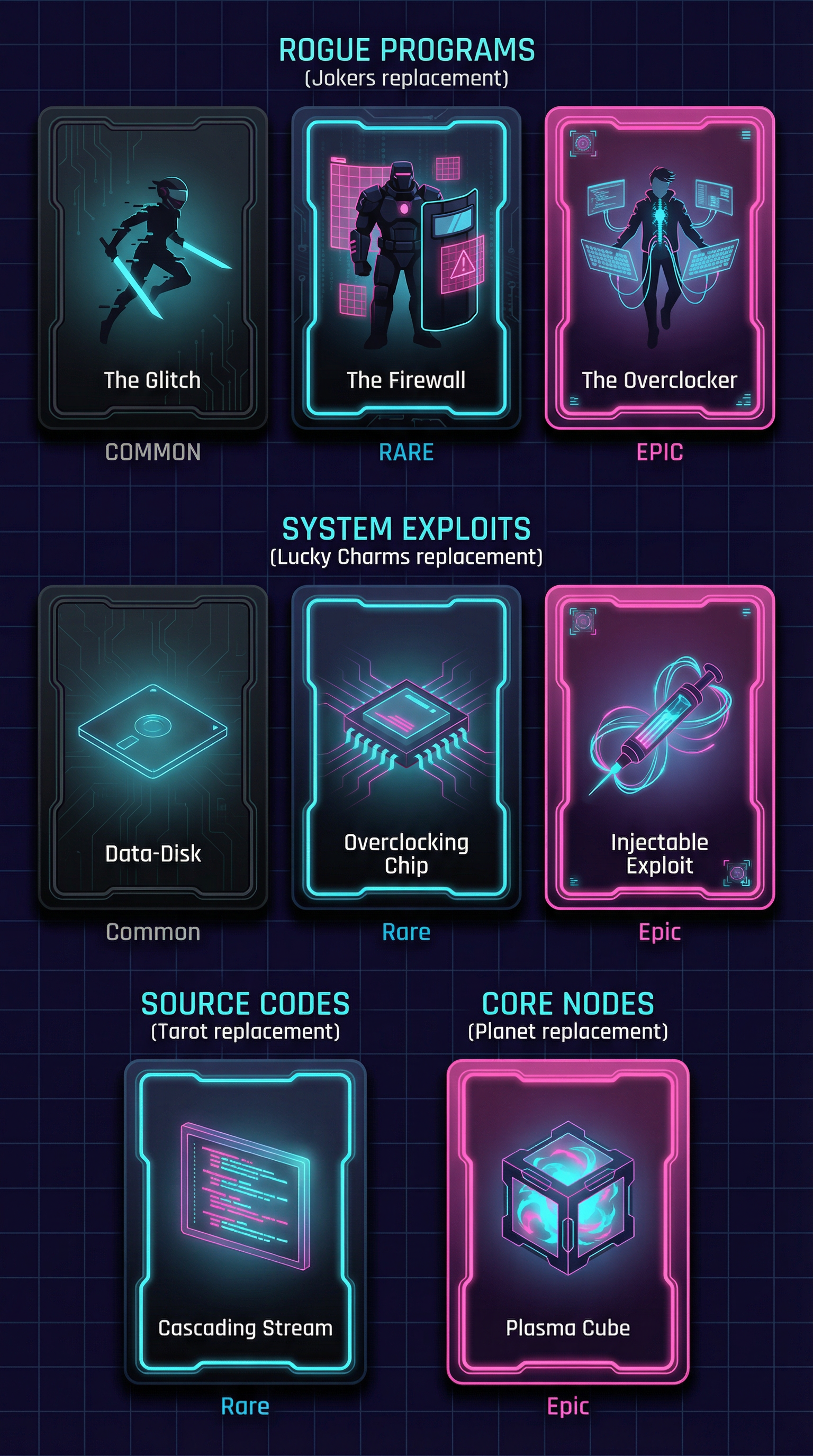 "Grainy color transitions and soft-light blending materials with borderless geometry. Vaporwave-adjacent lighting with smooth, soothing chromatic shifts. Minimalist 2D vector rendering focusing on flat shapes. Clean, relaxed silhouette definition suited for abstract card modifiers and ambient UI., - Concept: Rogue AI network core, high-voltage synthetic cyberspace. - Palette: Void Black & Dark Grid Indigo backgrounds vs blinding Laser Cyan & Overclocked Neon Pink highlights. - Materials & Elements: Infinite glowing circuitry lines, fiber-optic cables pulsing with light, sleek obsidian/polycarbonate, pure neon emissions. - Atmosphere: 'High-Voltage Cyberpunk'. Futuristic, synthetic, sterile but highly energetic., [UI/UX LAYOUT] - Core Structure: Respect reference layout. Thick beveled frames, high relief (extruded 3D look). - Interactions: Clickable buttons require pronounced inner 'Laser Cyan' glow & high-saliency color fills. - Depth & Hierarchy: Aggressive Z-depth drop shadows between layers. Active foreground 40% brighter/more contrast than background. [CARD PROGRESSION MATRIX] Visual Complexity Ladder scaling linearly by rarity: - Common: Matte black polycarbonate. Minimalist execution, clean flat structural borders, faint circuitry. No protruding elements. - Rare: Sleek obsidian. Enhanced thematic detailing (glowing fiber-optic routing, subtle data-streams), double-tiered UI depth. - Epic: Premium 'Neon Pink' hard-light borders. Complex structural design with embedded microchips or holographic UI nodes in corners. - Legendary: Maximalist synthetic expression. High-impact motifs (bursting plasma conduits, heavy circuitry cables, floating geometric data) physically breaking the rectangular silhouette (protruding 3D elements extending past borders)., [CONCEPT MAPPING] - Replace Jokers with ROGUE PROGRAMS: Sentient AI avatars & grid hackers in sleek polycarbonate suits with neon circuitry. - Replace Lucky Charms with SYSTEM EXPLOITS: Tangible digital artifacts (glowing geometric data-disks, overclocking microchips, pulsing fiber-optic injectables). - Replace Tarot with SOURCE CODES: Floating holographic terminal screens displaying cascading 'Neon Pink' & 'Laser Cyan' data streams. - Replace Planet with CORE NODES: Floating geometric server-cubes containing swirling, raw processing plasma. [PROGRAM SAMPLES] 1. THE GLITCH (Assassin): Agile fragmented digital avatar. Glitching/stuttering silhouette, sleek dark visor. Wielding twin 'Laser Cyan' hard-light blades. Swift, unstable pose. 2. THE FIREWALL (Heavy): Massive blocky enforcer program. Heavy obsidian armor projecting glowing warning grids. Holding massive digital riot shield. Imposing, defensive pose. 3. THE OVERCLOCKER (Specialist): Sleek hacker surrounded by floating holographic keyboards. Fiber-optic cables plugging into a glowing synthetic spine. Calculating, hyper-focused pose., For Purchasable Cards: "Visual Hierarchy: Vertical card orientation divided into three functional zones. Primary Zone (60-70% height): A large, centered rectangular frame dedicated to the character portrait and character name. Rarity: A high-saliency badge or icon placeholder located in the top-right corner, integrated in the main portrait frame. Or different card frame per rarity of the card including integrating the badge. Rarity Color Scheme: Common: Grey. Rare: Blue. Epic: Purple. Legendary: Yellow-Orange, Golden Information Zone (25% height): A dedicated horizontal rectangular container at the bottom for ""Modifier Text"" and ""Effect Description"". Purchase Price. Cost for adquiring the card or pack. Item Type: A Tag that indicated the type of item we are purchasing. Z-Depth: Character portrait must overlap the top edge of its frame to create a pop-out effect." ------"