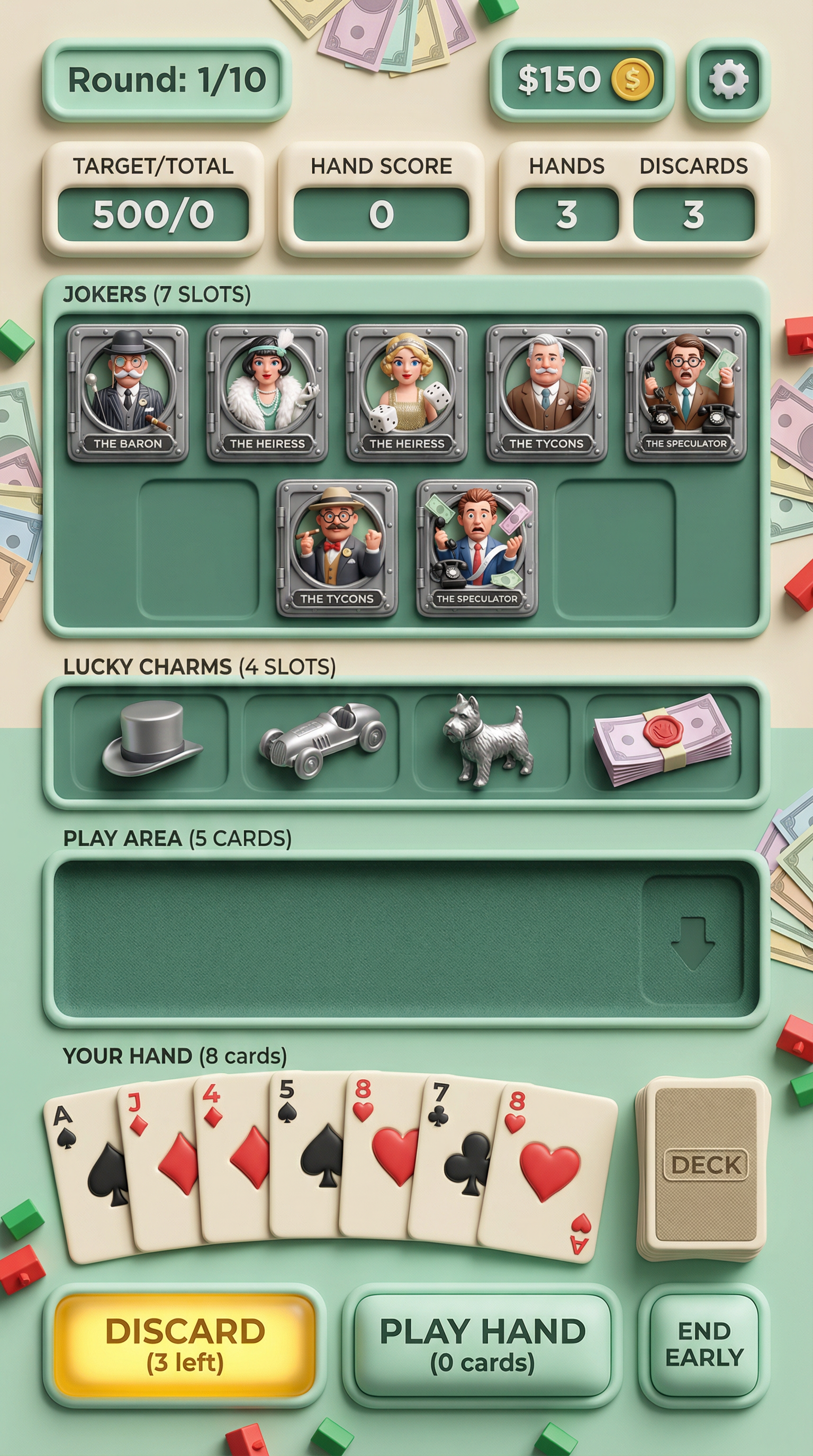"Ultra-smooth matte silicone and soft polymer materials with tactile, gummy-like volumetric forms. Seamless, rounded bevels and thick, pillowy edges. 3D-simulated rendering using soft inner shadows, bright specular core highlights, and vibrant radial gradients. Flawless, bouncy silhouette definition tailored for playful card surfaces and squishy UI panels., - Concept: Cutthroat, vintage-inspired tabletop property trading boardgame. A nostalgic but ruthlessly competitive miniature world of wealthy monopoly barons, silver-cast tokens, and towering plastic hotels built on mountains of pastel paper money. - Palette: Mint Green & Boardgame Cream vs Title Deed Red, Bright Blue, Goldenrod Yellow. - Materials & Elements: Silver-cast metal (tokens), crisp pastel paper money, glossy plastic (green/red buildings), printed cardboard grids. - Atmosphere: 'Classic Boardgame Greed'. Nostalgic, competitive, tactile, vintage-inspired., [UI/UX LAYOUT] - Core Structure: Respect reference layout. Thick beveled frames, high relief (extruded 3D look). - Interactions: Clickable buttons require pronounced inner 'Goldenrod Yellow' glow & high-saliency color fills. - Depth & Hierarchy: Aggressive Z-depth drop shadows between layers. Active foreground 40% brighter/more contrast than background. [CARD PROGRESSION MATRIX] Implement Visual Complexity Ladder scaling linearly by rarity: - Common: 'Boardgame Cream' printed cardboard. Minimalist execution, clean flat structural borders. No protruding elements. - Rare: Polished parlor wood & 'Mint Green' accents. Enhanced thematic detailing (subtle grid lines, crisp pastel paper money edges), double-tiered UI depth. - Epic: Premium 'Silver-cast' metal borders. Complex structural design with embedded tiny plastic green houses, red hotels, or vintage dice in corners. - Legendary: Maximalist bank vault expression. High-impact motifs (heavy brass safe gears, oversized silver tokens, bursting stacks of pastel money) physically breaking the rectangular silhouette (protruding 3D elements extending past borders)., [CONCEPT MAPPING] - Replace Jokers with THE TYCOONS: Ruthless monopoly barons, vintage bankers & aristocrats. Encased in ornate steel bank-vault frames. - Replace Lucky Charms with VINTAGE TOKENS: Tangible silver-cast pieces (classic racecar, top hat, terrier) & stacks of crisp pastel money. - Replace Tarot with TITLE DEEDS: Vintage property cards, bold colored headers (Red/Blue/Yellow), fine print, red wax seals. - Replace Planet with BANK VAULTS: Heavy steel safe doors or ornate brass cash registers bursting with gold coins & paper bills. [THE TYCOONS - SAMPLES] 1. THE BARON (Heavy): Imposing vintage banker, pinstripe suit, monocle. Holding silver cane & cigar. Arrogant, wealthy pose. 2. THE HEIRESS (Assassin): Elegant 1920s socialite, flapper dress, feather boa. Casually tossing classic white dice. Smug, calculating pose. 3. THE SPECULATOR (Specialist): Frantic stockbroker covered in ticker-tape. Holding ringing vintage telephones & fistfuls of pastel money. Manic, greedy pose."