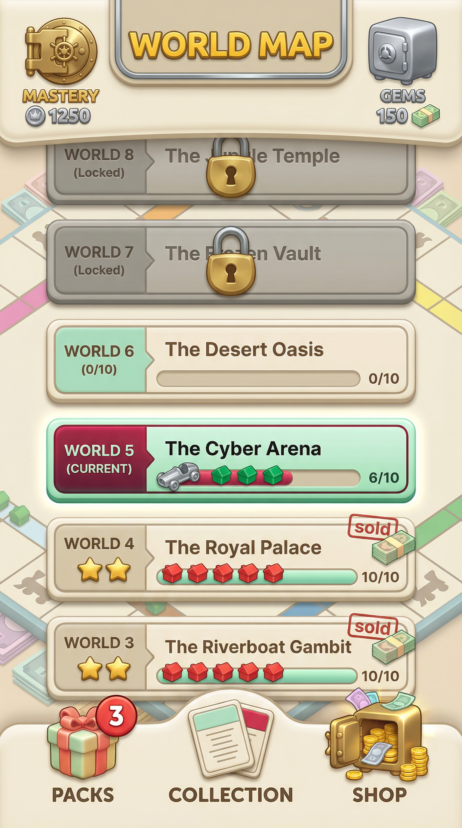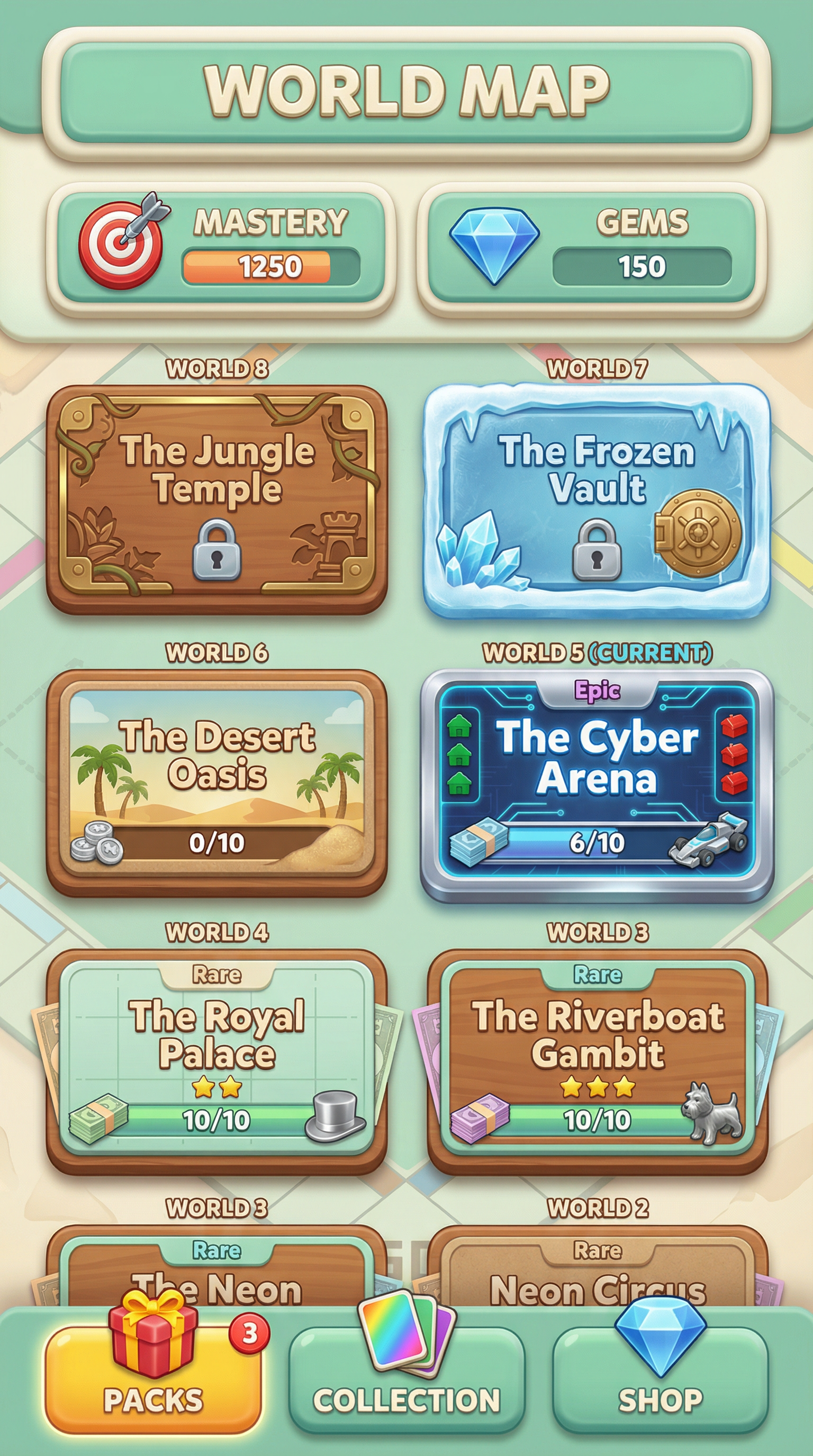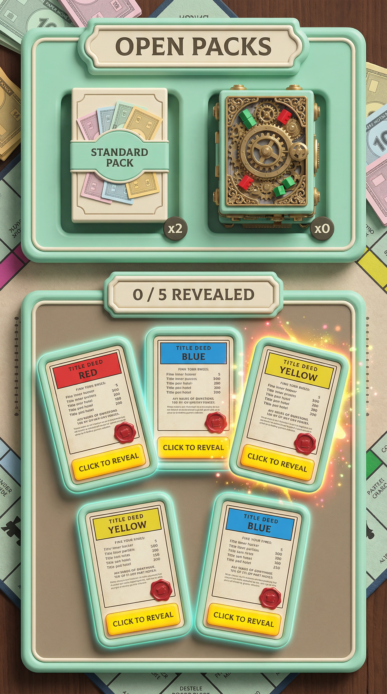"Ultra-smooth matte silicone and soft polymer materials with tactile, gummy-like volumetric forms. Seamless, rounded bevels and thick, pillowy edges. 3D-simulated rendering using soft inner shadows, bright specular core highlights, and vibrant radial gradients. Flawless, bouncy silhouette definition tailored for playful card surfaces and squishy UI panels., - Concept: Cutthroat, vintage-inspired tabletop property trading boardgame. A nostalgic but ruthlessly competitive miniature world of wealthy monopoly barons, silver-cast tokens, and towering plastic hotels built on mountains of pastel paper money. - Palette: Mint Green & Boardgame Cream vs Title Deed Red, Bright Blue, Goldenrod Yellow. - Materials & Elements: Silver-cast metal (tokens), crisp pastel paper money, glossy plastic (green/red buildings), printed cardboard grids. - Atmosphere: 'Classic Boardgame Greed'. Nostalgic, competitive, tactile, vintage-inspired., [UI/UX LAYOUT] - Core Structure: Respect reference layout. Thick beveled frames, high relief (extruded 3D look). - Interactions: Clickable buttons require pronounced inner 'Goldenrod Yellow' glow & high-saliency color fills. - Depth & Hierarchy: Aggressive Z-depth drop shadows between layers. Active foreground 40% brighter/more contrast than background. [CARD PROGRESSION MATRIX] Implement Visual Complexity Ladder scaling linearly by rarity: - Common: 'Boardgame Cream' printed cardboard. Minimalist execution, clean flat structural borders. No protruding elements. - Rare: Polished parlor wood & 'Mint Green' accents. Enhanced thematic detailing (subtle grid lines, crisp pastel paper money edges), double-tiered UI depth. - Epic: Premium 'Silver-cast' metal borders. Complex structural design with embedded tiny plastic green houses, red hotels, or vintage dice in corners. - Legendary: Maximalist bank vault expression. High-impact motifs (heavy brass safe gears, oversized silver tokens, bursting stacks of pastel money) physically breaking the rectangular silhouette (protruding 3D elements extending past borders)., [CONCEPT MAPPING] - Replace Jokers with THE TYCOONS: Ruthless monopoly barons, vintage bankers & aristocrats. Encased in ornate steel bank-vault frames. - Replace Lucky Charms with VINTAGE TOKENS: Tangible silver-cast pieces (classic racecar, top hat, terrier) & stacks of crisp pastel money. - Replace Tarot with TITLE DEEDS: Vintage property cards, bold colored headers (Red/Blue/Yellow), fine print, red wax seals. - Replace Planet with BANK VAULTS: Heavy steel safe doors or ornate brass cash registers bursting with gold coins & paper bills. [THE TYCOONS - SAMPLES] 1. THE BARON (Heavy): Imposing vintage banker, pinstripe suit, monocle. Holding silver cane & cigar. Arrogant, wealthy pose. 2. THE HEIRESS (Assassin): Elegant 1920s socialite, flapper dress, feather boa. Casually tossing classic white dice. Smug, calculating pose. 3. THE SPECULATOR (Specialist): Frantic stockbroker covered in ticker-tape. Holding ringing vintage telephones & fistfuls of pastel money. Manic, greedy pose., Pack Tier Differentiation (Standard vs. Premium): * Standard Asset: Single-layer design. Clean, functional geometry with minimal articulation or ornamental points. Uses basic surface textures. * Premium Asset: Multi-layered, high-complexity design. Must feature "mechanical intrigue" elements (e.g., dual latches, deep relief, intricate security features, or ornate filigree). Value is communicated through detail density per pixel and structural sophistication, not physical scale. Card Arrangement (Face-down State): * A set of 5 vertical rectangles (Card Backs). * Dynamic "Fan-out" or "Semi-circle" arrangement to simulate physical depth and perspective on the 3D plane. Backlight Aura: A peripheral light plane (halo) hidden behind the card edges. The "Epic Glow" (Visual Lead): * An expansive radiance effect using dynamic particles and light halos that "leak" past the card’s closed silhouette."