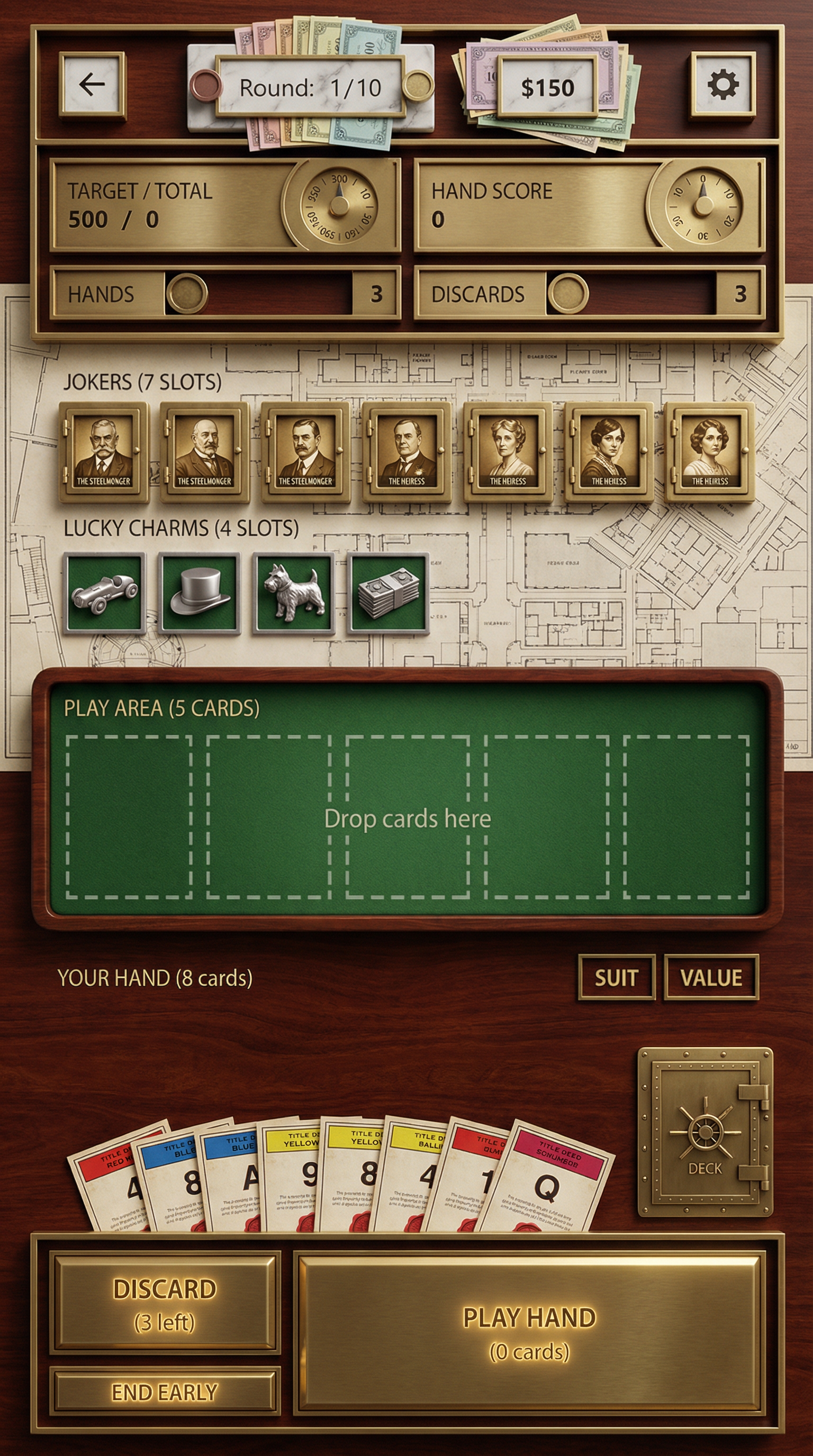 "Ultra-smooth matte silicone and soft polymer materials with tactile, gummy-like volumetric forms. Seamless, rounded bevels and thick, pillowy edges. 3D-simulated rendering using soft inner shadows, bright specular core highlights, and vibrant radial gradients. Flawless, bouncy silhouette definition tailored for playful card surfaces and squishy UI panels., - Concept: Cutthroat, vintage-inspired high-finance tabletop boardgame. A nostalgic but ruthlessly competitive miniature world of wealthy property barons, brass-cast tokens, and towering marble banks built on mountains of vintage bearer bonds. - Palette: Sepia Ink & Parchment Cream vs Forest Green, Deep Burgundy, Gold Leaf. - Materials & Elements: Heavy brass/gold-cast metal (tokens), crisp vintage banknotes/bonds, miniature marble & mahogany buildings, printed Art Deco architectural maps. - Atmosphere: 'Roaring 20s Greed'. Nostalgic, competitive, tactile, opulent., [UI/UX LAYOUT] - Core Structure: Respect reference layout. Thick beveled frames, high relief (extruded 3D look). - Interactions: Clickable buttons require pronounced inner 'Goldenrod Yellow' glow & high-saliency color fills. - Depth & Hierarchy: Aggressive Z-depth drop shadows between layers. Active foreground 40% brighter/more contrast than background. [CARD PROGRESSION MATRIX] Implement Visual Complexity Ladder scaling linearly by rarity: - Common: 'Boardgame Cream' printed cardboard. Minimalist execution, clean flat structural borders. No protruding elements. - Rare: Polished parlor wood & 'Mint Green' accents. Enhanced thematic detailing (subtle grid lines, crisp pastel paper money edges), double-tiered UI depth. - Epic: Premium 'Silver-cast' metal borders. Complex structural design with embedded tiny plastic green houses, red hotels, or vintage dice in corners. - Legendary: Maximalist bank vault expression. High-impact motifs (heavy brass safe gears, oversized silver tokens, bursting stacks of pastel money) physically breaking the rectangular silhouette (protruding 3D elements extending past borders)., [CONCEPT MAPPING] - Replace Jokers with THE TYCOONS: Ruthless property barons, vintage bankers & aristocrats. Encased in ornate steel bank-vault frames. - Replace Lucky Charms with VINTAGE TOKENS: Tangible silver-cast pieces (classic racecar, top hat, terrier) & stacks of crisp pastel money. - Replace Tarot with TITLE DEEDS: Vintage property cards, bold colored headers (Red/Blue/Yellow), fine print, red wax seals. - Replace Planet with BANK VAULTS: Heavy steel safe doors or ornate brass cash registers bursting with gold coins & paper bills. [THE TYCOONS - SAMPLES] 1. THE STEELMONEGER (Heavy): Towering industrialist in a bulky, bespoke tweed three-piece suit. Gripping a massive, polished golden railway spike like a scepter. Standing next to a miniature brass locomotive model. Immovable, commanding posture. 2. THE HEIRESS (Assassin): Elegant 1920s socialite, flapper dress, feather boa. Casually tossing brass dice. Smug, calculating pose. 3. THE SPECULATOR (Specialist): Frantic stockbroker covered in ticker-tape. Holding ringing vintage brass telephones & fistfuls of bonds. Manic, greedy pose."
