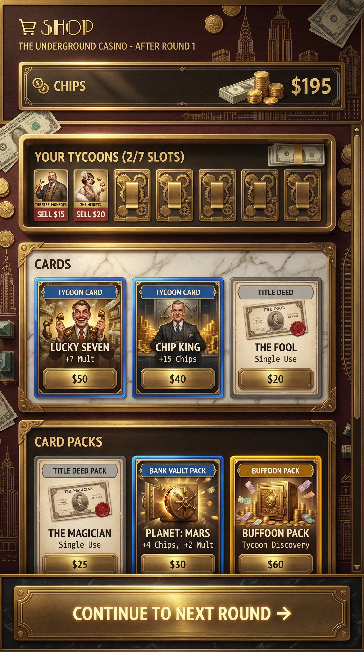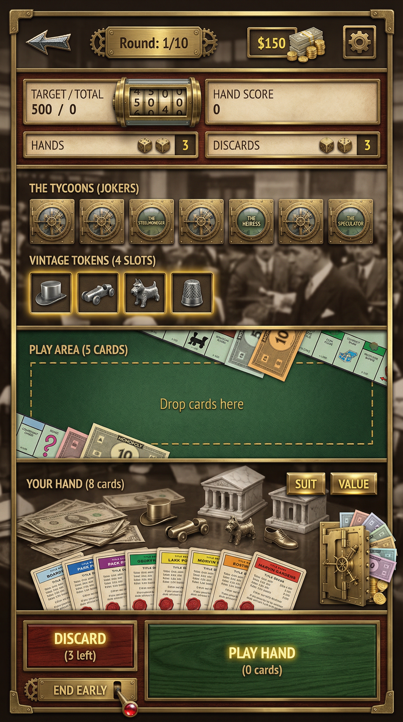 "Multi-layered frosted glass materials with high-fidelity background blur (bokeh) and subtle chromatic aberration. Sleek, translucent 3D panels with razor-thin, glowing neon or metallic rim highlights. High-end modern rendering. Refined, structural silhouette definition optimized for premium holographic playing cards and sophisticated UI overlays., - Concept: Cutthroat, vintage-inspired high-finance tabletop boardgame. A nostalgic but ruthlessly competitive miniature world of wealthy property barons, brass-cast tokens, and towering marble banks built on mountains of vintage bearer bonds. - Palette: Sepia Ink & Parchment Cream vs Forest Green, Deep Burgundy, Gold Leaf. - Materials & Elements: Heavy brass/gold-cast metal (tokens), crisp vintage banknotes/bonds, miniature marble & mahogany buildings, printed Art Deco architectural maps. - Atmosphere: 'Roaring 20s Greed'. Nostalgic, competitive, tactile, opulent., [UI/UX LAYOUT] - Core Structure: Respect reference layout. Thick beveled frames, high relief (extruded 3D look). - Interactions: Clickable buttons require pronounced inner 'Goldenrod Yellow' glow & high-saliency color fills. - Depth & Hierarchy: Aggressive Z-depth drop shadows between layers. Active foreground 40% brighter/more contrast than background. [CARD PROGRESSION MATRIX] Implement Visual Complexity Ladder scaling linearly by rarity: - Common: 'Boardgame Cream' printed cardboard. Minimalist execution, clean flat structural borders. No protruding elements. - Rare: Polished parlor wood & 'Mint Green' accents. Enhanced thematic detailing (subtle grid lines, crisp pastel paper money edges), double-tiered UI depth. - Epic: Premium 'Silver-cast' metal borders. Complex structural design with embedded tiny plastic green houses, red hotels, or vintage dice in corners. - Legendary: Maximalist bank vault expression. High-impact motifs (heavy brass safe gears, oversized silver tokens, bursting stacks of pastel money) physically breaking the rectangular silhouette (protruding 3D elements extending past borders)., [CONCEPT MAPPING] - Replace Jokers with THE TYCOONS: Ruthless property barons, vintage bankers & aristocrats. Encased in ornate steel bank-vault frames. - Replace Lucky Charms with VINTAGE TOKENS: Tangible silver-cast pieces (classic racecar, top hat, terrier) & stacks of crisp pastel money. - Replace Tarot with TITLE DEEDS: Vintage property cards, bold colored headers (Red/Blue/Yellow), fine print, red wax seals. - Replace Planet with BANK VAULTS: Heavy steel safe doors or ornate brass cash registers bursting with gold coins & paper bills. [THE TYCOONS - SAMPLES] 1. THE STEELMONEGER (Heavy): Towering industrialist in a bulky, bespoke tweed three-piece suit. Gripping a massive, polished golden railway spike like a scepter. Standing next to a miniature brass locomotive model. Immovable, commanding posture. 2. THE HEIRESS (Assassin): Elegant 1920s socialite, flapper dress, feather boa. Casually tossing brass dice. Smug, calculating pose. 3. THE SPECULATOR (Specialist): Frantic stockbroker covered in ticker-tape. Holding ringing vintage brass telephones & fistfuls of bonds. Manic, greedy pose., For Purchasable Cards: "Visual Hierarchy: Vertical card orientation divided into three functional zones. Primary Zone (60-70% height): A large, centered rectangular frame dedicated to the character portrait and character name. Rarity: A high-saliency badge or icon placeholder located in the top-right corner, integrated in the main portrait frame. Or different card frame per rarity of the card including integrating the badge. Rarity Color Scheme: Common: Grey. Rare: Blue. Epic: Purple. Legendary: Yellow-Orange, Golden Information Zone (25% height): A dedicated horizontal rectangular container at the bottom for ""Modifier Text"" and ""Effect Description"". Purchase Price. Cost for adquiring the card or pack. Item Type: A Tag that indicated the type of item we are purchasing. Z-Depth: Character portrait must overlap the top edge of its frame to create a pop-out effect." ------"