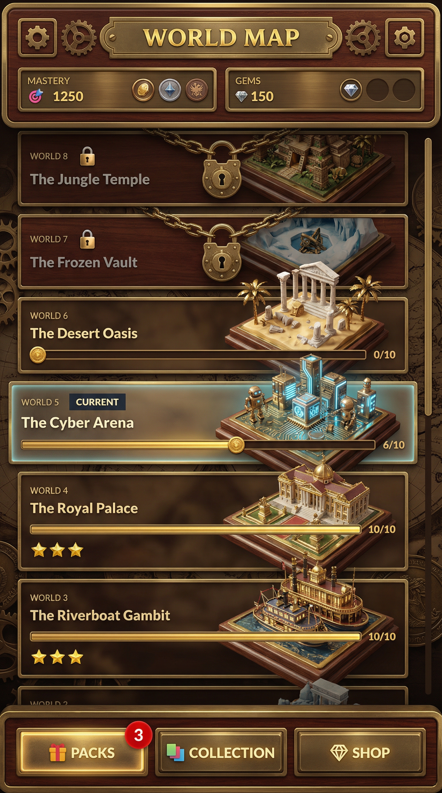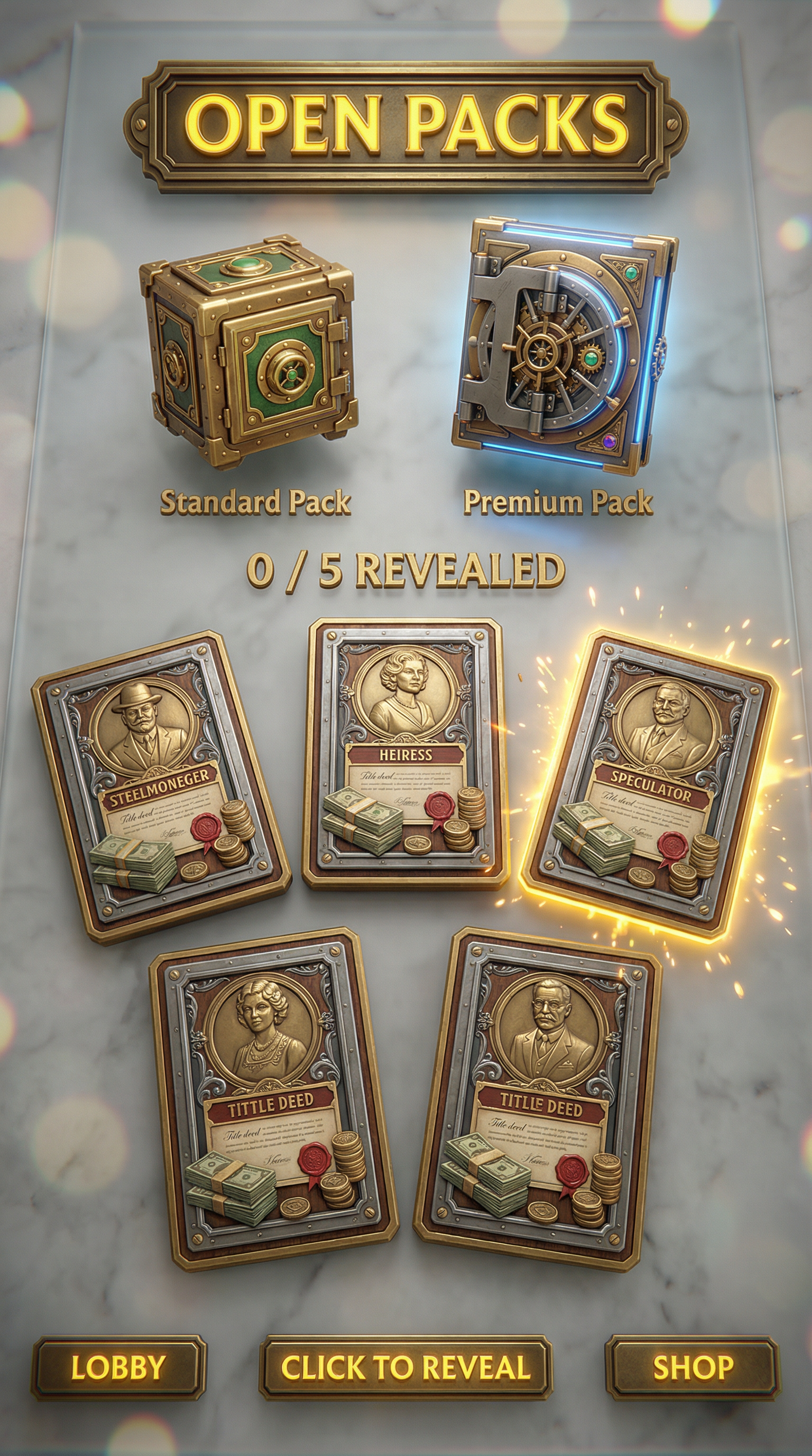 "Multi-layered frosted glass materials with high-fidelity background blur (bokeh) and subtle chromatic aberration. Sleek, translucent 3D panels with razor-thin, glowing neon or metallic rim highlights. High-end modern rendering. Refined, structural silhouette definition optimized for premium holographic playing cards and sophisticated UI overlays., - Concept: Cutthroat, vintage-inspired high-finance tabletop boardgame. A nostalgic but ruthlessly competitive miniature world of wealthy property barons, brass-cast tokens, and towering marble banks built on mountains of vintage bearer bonds. - Palette: Sepia Ink & Parchment Cream vs Forest Green, Deep Burgundy, Gold Leaf. - Materials & Elements: Heavy brass/gold-cast metal (tokens), crisp vintage banknotes/bonds, miniature marble & mahogany buildings, printed Art Deco architectural maps. - Atmosphere: 'Roaring 20s Greed'. Nostalgic, competitive, tactile, opulent., [UI/UX LAYOUT] - Core Structure: Respect reference layout. Thick beveled frames, high relief (extruded 3D look). - Interactions: Clickable buttons require pronounced inner 'Goldenrod Yellow' glow & high-saliency color fills. - Depth & Hierarchy: Aggressive Z-depth drop shadows between layers. Active foreground 40% brighter/more contrast than background. [CARD PROGRESSION MATRIX] Implement Visual Complexity Ladder scaling linearly by rarity: - Common: 'Boardgame Cream' printed cardboard. Minimalist execution, clean flat structural borders. No protruding elements. - Rare: Polished parlor wood & 'Mint Green' accents. Enhanced thematic detailing (subtle grid lines, crisp pastel paper money edges), double-tiered UI depth. - Epic: Premium 'Silver-cast' metal borders. Complex structural design with embedded tiny plastic green houses, red hotels, or vintage dice in corners. - Legendary: Maximalist bank vault expression. High-impact motifs (heavy brass safe gears, oversized silver tokens, bursting stacks of pastel money) physically breaking the rectangular silhouette (protruding 3D elements extending past borders)., [CONCEPT MAPPING] - Replace Jokers with THE TYCOONS: Ruthless property barons, vintage bankers & aristocrats. Encased in ornate steel bank-vault frames. - Replace Lucky Charms with VINTAGE TOKENS: Tangible silver-cast pieces (classic racecar, top hat, terrier) & stacks of crisp pastel money. - Replace Tarot with TITLE DEEDS: Vintage property cards, bold colored headers (Red/Blue/Yellow), fine print, red wax seals. - Replace Planet with BANK VAULTS: Heavy steel safe doors or ornate brass cash registers bursting with gold coins & paper bills. [THE TYCOONS - SAMPLES] 1. THE STEELMONEGER (Heavy): Towering industrialist in a bulky, bespoke tweed three-piece suit. Gripping a massive, polished golden railway spike like a scepter. Standing next to a miniature brass locomotive model. Immovable, commanding posture. 2. THE HEIRESS (Assassin): Elegant 1920s socialite, flapper dress, feather boa. Casually tossing brass dice. Smug, calculating pose. 3. THE SPECULATOR (Specialist): Frantic stockbroker covered in ticker-tape. Holding ringing vintage brass telephones & fistfuls of bonds. Manic, greedy pose., Pack Tier Differentiation (Standard vs. Premium): * Standard Asset: Single-layer design. Clean, functional geometry with minimal articulation or ornamental points. Uses basic surface textures. * Premium Asset: Multi-layered, high-complexity design. Must feature "mechanical intrigue" elements (e.g., dual latches, deep relief, intricate security features, or ornate filigree). Value is communicated through detail density per pixel and structural sophistication, not physical scale. Card Arrangement (Face-down State): * A set of 5 vertical rectangles (Card Backs). * Dynamic "Fan-out" or "Semi-circle" arrangement to simulate physical depth and perspective on the 3D plane. Backlight Aura: A peripheral light plane (halo) hidden behind the card edges. The "Epic Glow" (Visual Lead): * An expansive radiance effect using dynamic particles and light halos that "leak" past the card’s closed silhouette."