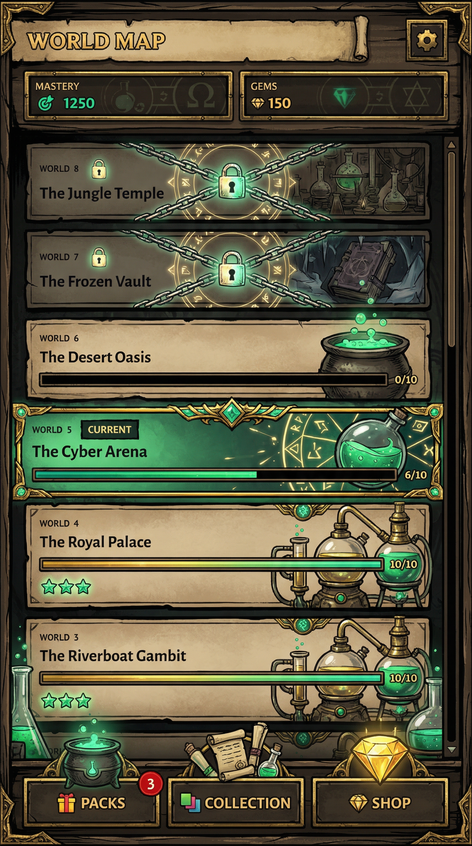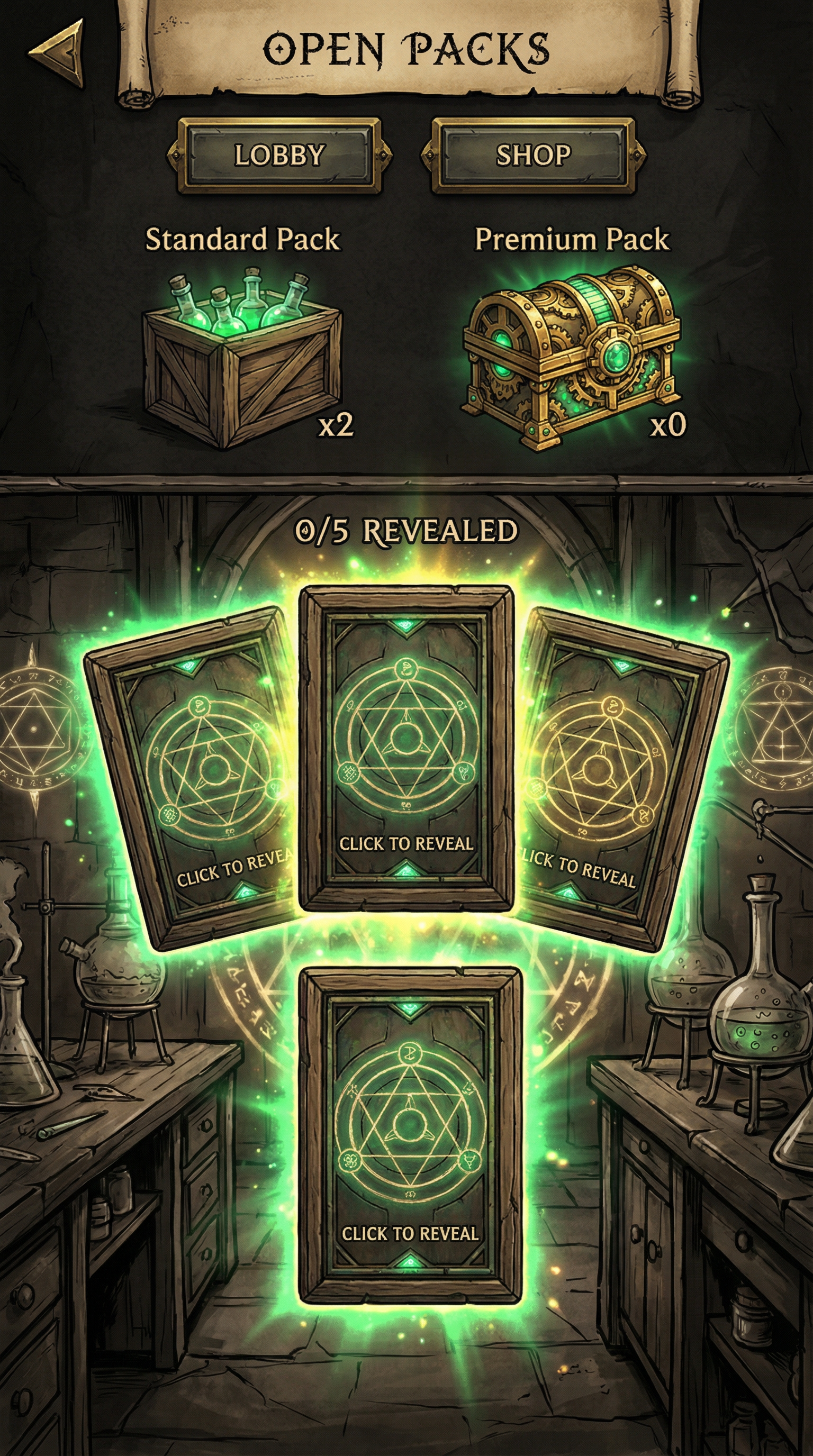 "Hand-painted textures with heavy, stylized black ink shadows (chiaroscuro). Sharp, chiseled ink outlines for all interactive elements. 2D graphic novel rendering with visible, expressive brushstrokes and high-contrast lighting with dramatic rim highlights. Strong silhouette definition for cards and UI frames., - Concept: Secret Occult underground laboratory of a master alchemist seeking the Philosopher's Stone, forbidden science and elemental transmutation. - Palette: Sepia Brown & Shadowy Charcoal backgrounds vs Alchemical Emerald Green & Transmutation Gold highlights. - Materials & Elements: Scarred dark wood, glowing bubbling liquids, polished glass alembics, aged parchment, raw ores, glowing geometric runes. - Atmosphere: 'Forbidden Science'. Occult, scholarly, mystical, esoteric and highly atmospheric., [UI/UX LAYOUT] - Core Structure: Respect reference layout. Thick beveled frames, high relief (extruded 3D look). - Interactions: Clickable buttons require pronounced inner 'Alchemical Emerald Green' glow & high-saliency color fills. - Depth & Hierarchy: Aggressive Z-depth drop shadows between layers. Active foreground 40% brighter/more contrast than background. [CARD PROGRESSION MATRIX] Visual Complexity Ladder scaling linearly by rarity: - Common: 'Scarred dark wood' and crude iron. Minimalist execution, clean flat structural borders. No protruding elements. - Rare: Polished bronze & 'Sepia Brown' leather binding. Enhanced thematic detailing (etched geometric runes, subtle bubbling glass vials), double-tiered UI depth. - Epic: Premium 'Transmutation Gold' filigree. Complex structural design with embedded glowing emerald gems or miniature alembics in corners. - Legendary: Maximalist occult expression. High-impact motifs (bursting emerald flames, levitating raw bismuth ores, heavy glowing transmutation circles) physically breaking the rectangular silhouette (protruding 3D elements extending past borders)., [CONCEPT MAPPING] - Replace Jokers with THE ADEPTS: Master alchemists, occult scholars, and rune-carved homunculi. Encased in scarred dark wood and brass frames. - Replace Lucky Charms with ALCHEMICAL CATALYSTS: Tangible mystical ingredients (glowing glass vials of emerald liquid, raw bismuth ores, crystallized salts). - Replace Tarot with ESOTERIC SCROLLS: Heavy aged parchment unfurled, glowing geometric transmutation circles, cryptic ink calligraphy. - Replace Planet with TRANSMUTATION CRUCIBLES: Heavy iron athanors (alchemical furnaces) or oversized bubbling glass alembics radiating pure gold light. [THE ADEPTS - SAMPLES] 1. THE SCHOLAR (Specialist): Obsessive occultist in sepia robes, surrounded by floating, glowing parchment. Holding a raw shard of the Philosopher's Stone. Intense, manic pose. 2. THE HOMUNCULUS (Heavy): Towering artificial golem made of raw ores, clay, and iron bands. Deep 'Emerald Green' geometric runes carved into its chest. Immovable, protective pose. 3. THE TOXICOLOGIST (Assassin): Shadowy figure draped in charcoal cloaks. Swirling toxic green vapors leaking from delicate glass vials held in their hands. Cunning, lethal pose., Pack Tier Differentiation (Standard vs. Premium): * Standard Asset: Single-layer design. Clean, functional geometry with minimal articulation or ornamental points. Uses basic surface textures. * Premium Asset: Multi-layered, high-complexity design. Must feature "mechanical intrigue" elements (e.g., dual latches, deep relief, intricate security features, or ornate filigree). Value is communicated through detail density per pixel and structural sophistication, not physical scale. Card Arrangement (Face-down State): * A set of 5 vertical rectangles (Card Backs). * Dynamic "Fan-out" or "Semi-circle" arrangement to simulate physical depth and perspective on the 3D plane. Backlight Aura: A peripheral light plane (halo) hidden behind the card edges. The "Epic Glow" (Visual Lead): * An expansive radiance effect using dynamic particles and light halos that "leak" past the card’s closed silhouette."