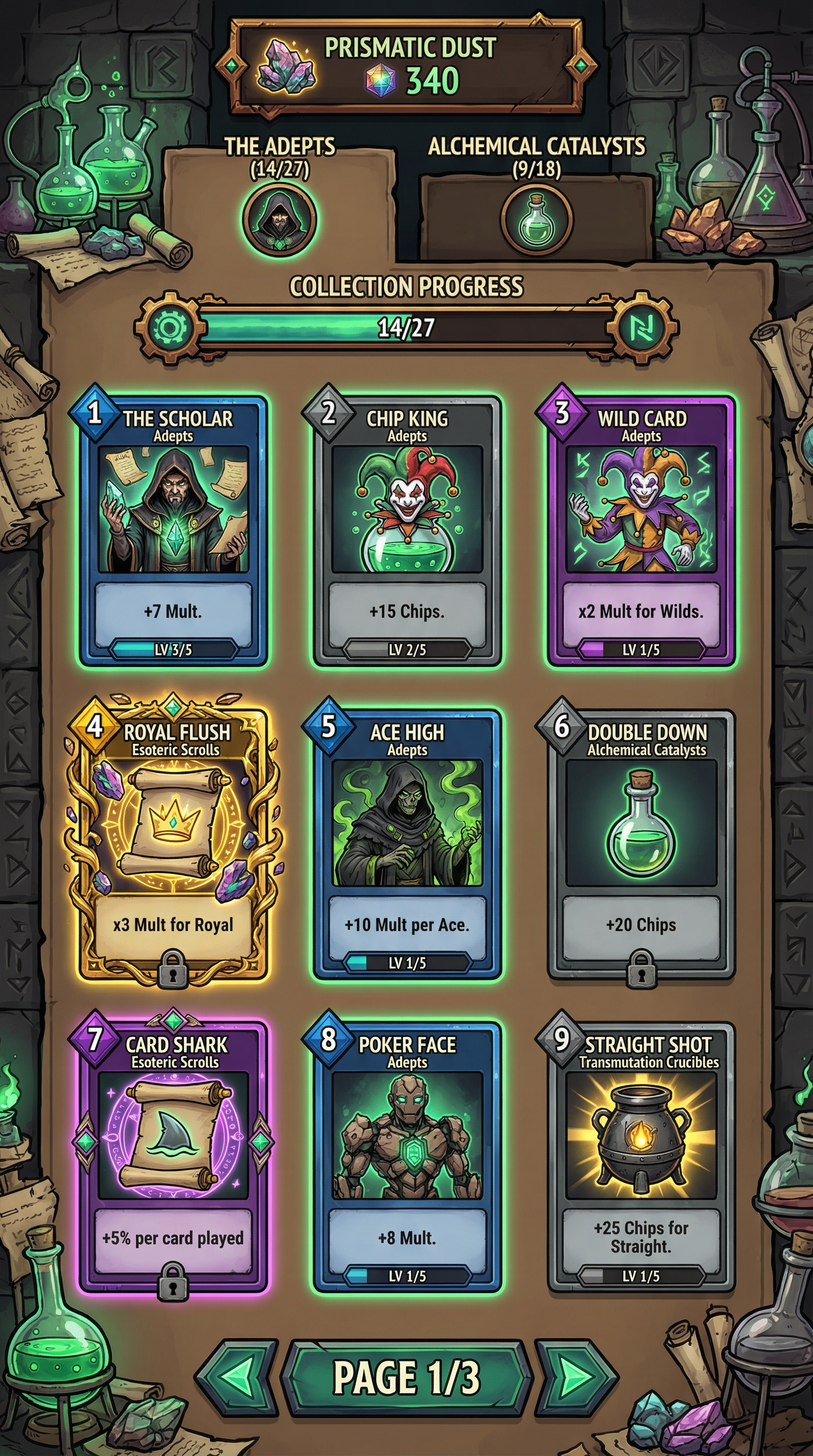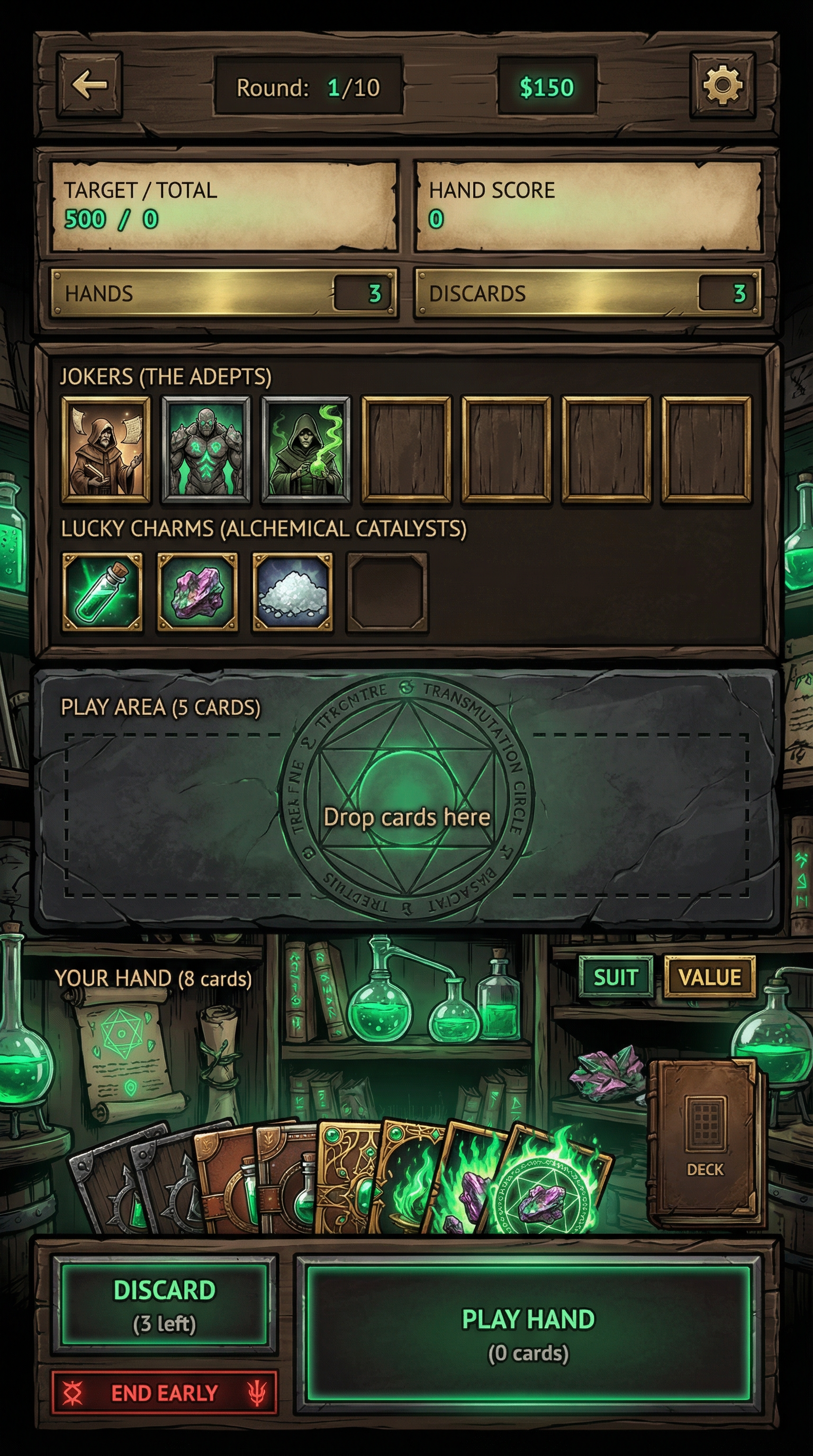 "Hand-painted textures with heavy, stylized black ink shadows (chiaroscuro). Sharp, chiseled ink outlines for all interactive elements. 2D graphic novel rendering with visible, expressive brushstrokes and high-contrast lighting with dramatic rim highlights. Strong silhouette definition for cards and UI frames., - Concept: Secret Occult underground laboratory of a master alchemist seeking the Philosopher's Stone, forbidden science and elemental transmutation. - Palette: Sepia Brown & Shadowy Charcoal backgrounds vs Alchemical Emerald Green & Transmutation Gold highlights. - Materials & Elements: Scarred dark wood, glowing bubbling liquids, polished glass alembics, aged parchment, raw ores, glowing geometric runes. - Atmosphere: 'Forbidden Science'. Occult, scholarly, mystical, esoteric and highly atmospheric., [UI/UX LAYOUT] - Core Structure: Respect reference layout. Thick beveled frames, high relief (extruded 3D look). - Interactions: Clickable buttons require pronounced inner 'Alchemical Emerald Green' glow & high-saliency color fills. - Depth & Hierarchy: Aggressive Z-depth drop shadows between layers. Active foreground 40% brighter/more contrast than background. [CARD PROGRESSION MATRIX] Visual Complexity Ladder scaling linearly by rarity: - Common: 'Scarred dark wood' and crude iron. Minimalist execution, clean flat structural borders. No protruding elements. - Rare: Polished bronze & 'Sepia Brown' leather binding. Enhanced thematic detailing (etched geometric runes, subtle bubbling glass vials), double-tiered UI depth. - Epic: Premium 'Transmutation Gold' filigree. Complex structural design with embedded glowing emerald gems or miniature alembics in corners. - Legendary: Maximalist occult expression. High-impact motifs (bursting emerald flames, levitating raw bismuth ores, heavy glowing transmutation circles) physically breaking the rectangular silhouette (protruding 3D elements extending past borders)., [CONCEPT MAPPING] - Replace Jokers with THE ADEPTS: Master alchemists, occult scholars, and rune-carved homunculi. Encased in scarred dark wood and brass frames. - Replace Lucky Charms with ALCHEMICAL CATALYSTS: Tangible mystical ingredients (glowing glass vials of emerald liquid, raw bismuth ores, crystallized salts). - Replace Tarot with ESOTERIC SCROLLS: Heavy aged parchment unfurled, glowing geometric transmutation circles, cryptic ink calligraphy. - Replace Planet with TRANSMUTATION CRUCIBLES: Heavy iron athanors (alchemical furnaces) or oversized bubbling glass alembics radiating pure gold light. [THE ADEPTS - SAMPLES] 1. THE SCHOLAR (Specialist): Obsessive occultist in sepia robes, surrounded by floating, glowing parchment. Holding a raw shard of the Philosopher's Stone. Intense, manic pose. 2. THE HOMUNCULUS (Heavy): Towering artificial golem made of raw ores, clay, and iron bands. Deep 'Emerald Green' geometric runes carved into its chest. Immovable, protective pose. 3. THE TOXICOLOGIST (Assassin): Shadowy figure draped in charcoal cloaks. Swirling toxic green vapors leaking from delicate glass vials held in their hands. Cunning, lethal pose., For Purchasable Cards: "Visual Hierarchy: Vertical card orientation divided into three functional zones. Primary Zone (60-70% height): A large, centered rectangular frame dedicated to the character portrait and character name. Rarity: A high-saliency badge or icon placeholder located in the top-right corner, integrated in the main portrait frame. Or different card frame per rarity of the card including integrating the badge. Rarity Color Scheme: Common: Grey. Rare: Blue. Epic: Purple. Legendary: Yellow-Orange, Golden Information Zone (25% height): A dedicated horizontal rectangular container at the bottom for ""Modifier Text"" and ""Effect Description"". Purchase Price. Cost for adquiring the card or pack. Item Type: A Tag that indicated the type of item we are purchasing. Z-Depth: Character portrait must overlap the top edge of its frame to create a pop-out effect." ------"