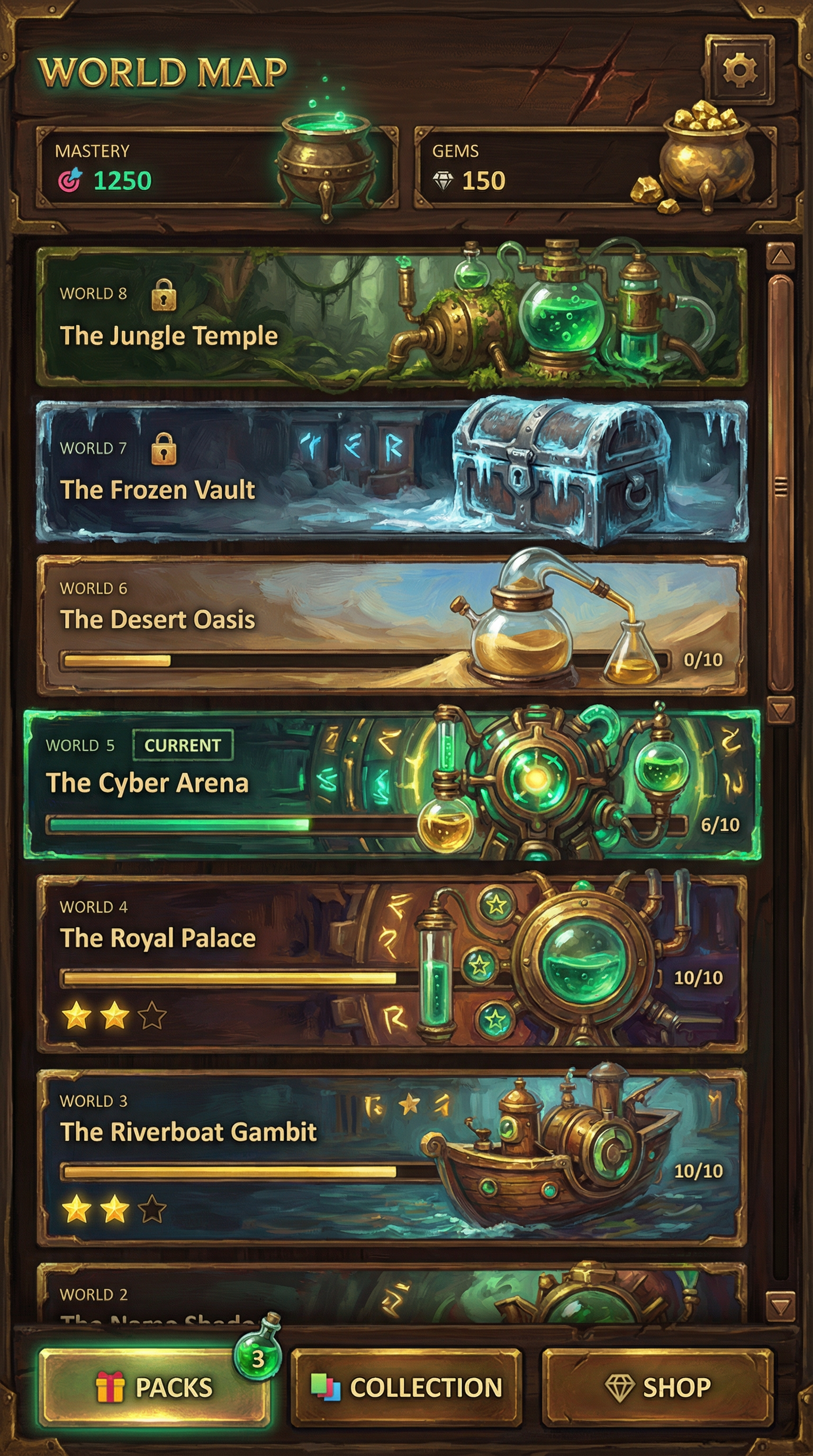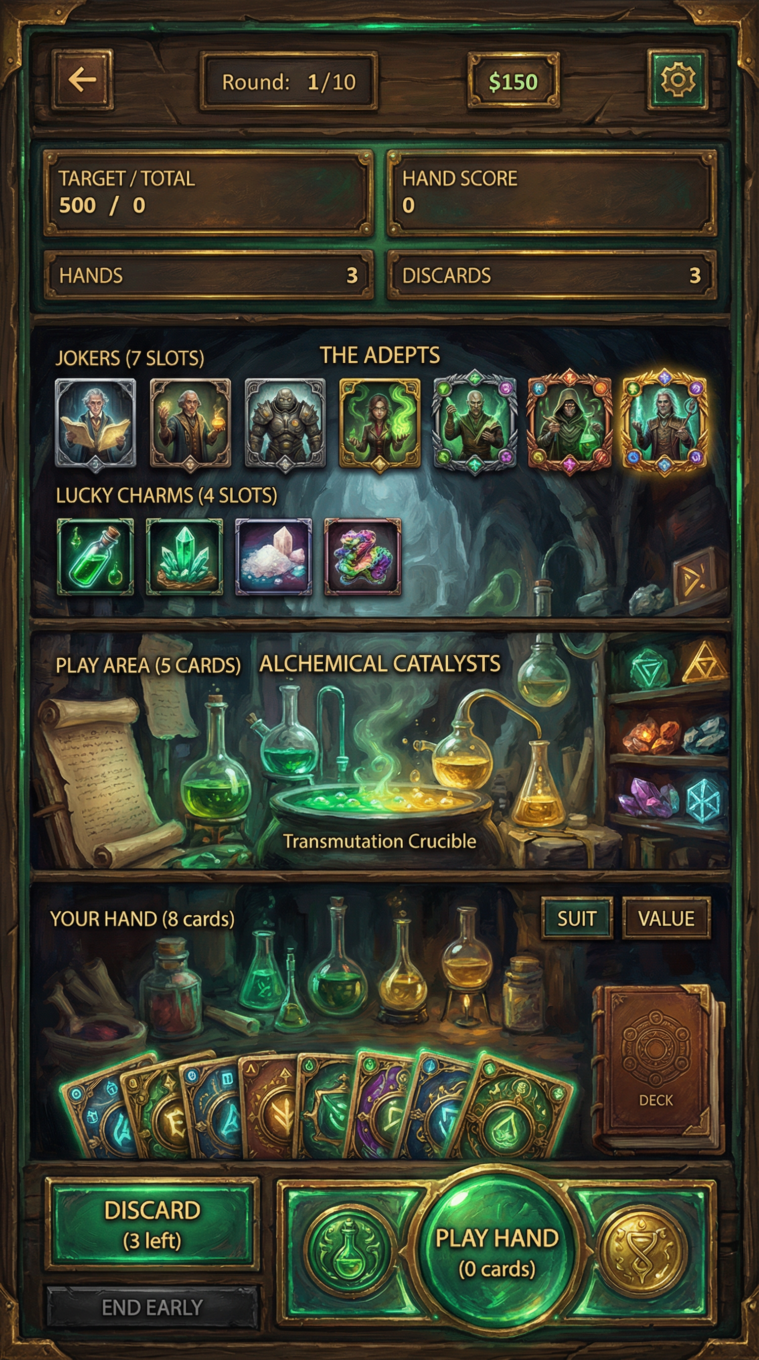 "Rich digital oil painting techniques with thick, expressive impasto brushstrokes and layered color blending. Soft, glowing ambient occlusion mixed with dramatic, saturated rim lighting. High-fidelity 2D fantasy rendering. Distinct, hand-crafted edge definition ensuring perfect readability for complex card illustrations and ornate UI frames.", - Concept: Secret Occult underground laboratory of a master alchemist seeking the Philosopher's Stone, forbidden science and elemental transmutation. - Palette: Sepia Brown & Shadowy Charcoal backgrounds vs Alchemical Emerald Green & Transmutation Gold highlights. - Materials & Elements: Scarred dark wood, glowing bubbling liquids, polished glass alembics, aged parchment, raw ores, glowing geometric runes. - Atmosphere: 'Forbidden Science'. Occult, scholarly, mystical, esoteric and highly atmospheric., [UI/UX LAYOUT] - Core Structure: Respect reference layout. Thick beveled frames, high relief (extruded 3D look). - Interactions: Clickable buttons require pronounced inner 'Alchemical Emerald Green' glow & high-saliency color fills. - Depth & Hierarchy: Aggressive Z-depth drop shadows between layers. Active foreground 40% brighter/more contrast than background. [CARD PROGRESSION MATRIX] Visual Complexity Ladder scaling linearly by rarity: - Common: 'Scarred dark wood' and crude iron. Minimalist execution, clean flat structural borders. No protruding elements. - Rare: Polished bronze & 'Sepia Brown' leather binding. Enhanced thematic detailing (etched geometric runes, subtle bubbling glass vials), double-tiered UI depth. - Epic: Premium 'Transmutation Gold' filigree. Complex structural design with embedded glowing emerald gems or miniature alembics in corners. - Legendary: Maximalist occult expression. High-impact motifs (bursting emerald flames, levitating raw bismuth ores, heavy glowing transmutation circles) physically breaking the rectangular silhouette (protruding 3D elements extending past borders)., [CONCEPT MAPPING] - Replace Jokers with THE ADEPTS: Master alchemists, occult scholars, and rune-carved homunculi. Encased in scarred dark wood and brass frames. - Replace Lucky Charms with ALCHEMICAL CATALYSTS: Tangible mystical ingredients (glowing glass vials of emerald liquid, raw bismuth ores, crystallized salts). - Replace Tarot with ESOTERIC SCROLLS: Heavy aged parchment unfurled, glowing geometric transmutation circles, cryptic ink calligraphy. - Replace Planet with TRANSMUTATION CRUCIBLES: Heavy iron athanors (alchemical furnaces) or oversized bubbling glass alembics radiating pure gold light. [THE ADEPTS - SAMPLES] 1. THE SCHOLAR (Specialist): Obsessive occultist in sepia robes, surrounded by floating, glowing parchment. Holding a raw shard of the Philosopher's Stone. Intense, manic pose. 2. THE HOMUNCULUS (Heavy): Towering artificial golem made of raw ores, clay, and iron bands. Deep 'Emerald Green' geometric runes carved into its chest. Immovable, protective pose. 3. THE TOXICOLOGIST (Assassin): Shadowy figure draped in charcoal cloaks. Swirling toxic green vapors leaking from delicate glass vials held in their hands. Cunning, lethal pose., For Purchasable Cards: "Visual Hierarchy: Vertical card orientation divided into three functional zones. Primary Zone (60-70% height): A large, centered rectangular frame dedicated to the character portrait and character name. Rarity: A high-saliency badge or icon placeholder located in the top-right corner, integrated in the main portrait frame. Or different card frame per rarity of the card including integrating the badge. Rarity Color Scheme: Common: Grey. Rare: Blue. Epic: Purple. Legendary: Yellow-Orange, Golden Information Zone (25% height): A dedicated horizontal rectangular container at the bottom for ""Modifier Text"" and ""Effect Description"". Purchase Price. Cost for adquiring the card or pack. Item Type: A Tag that indicated the type of item we are purchasing. Z-Depth: Character portrait must overlap the top edge of its frame to create a pop-out effect." ------"