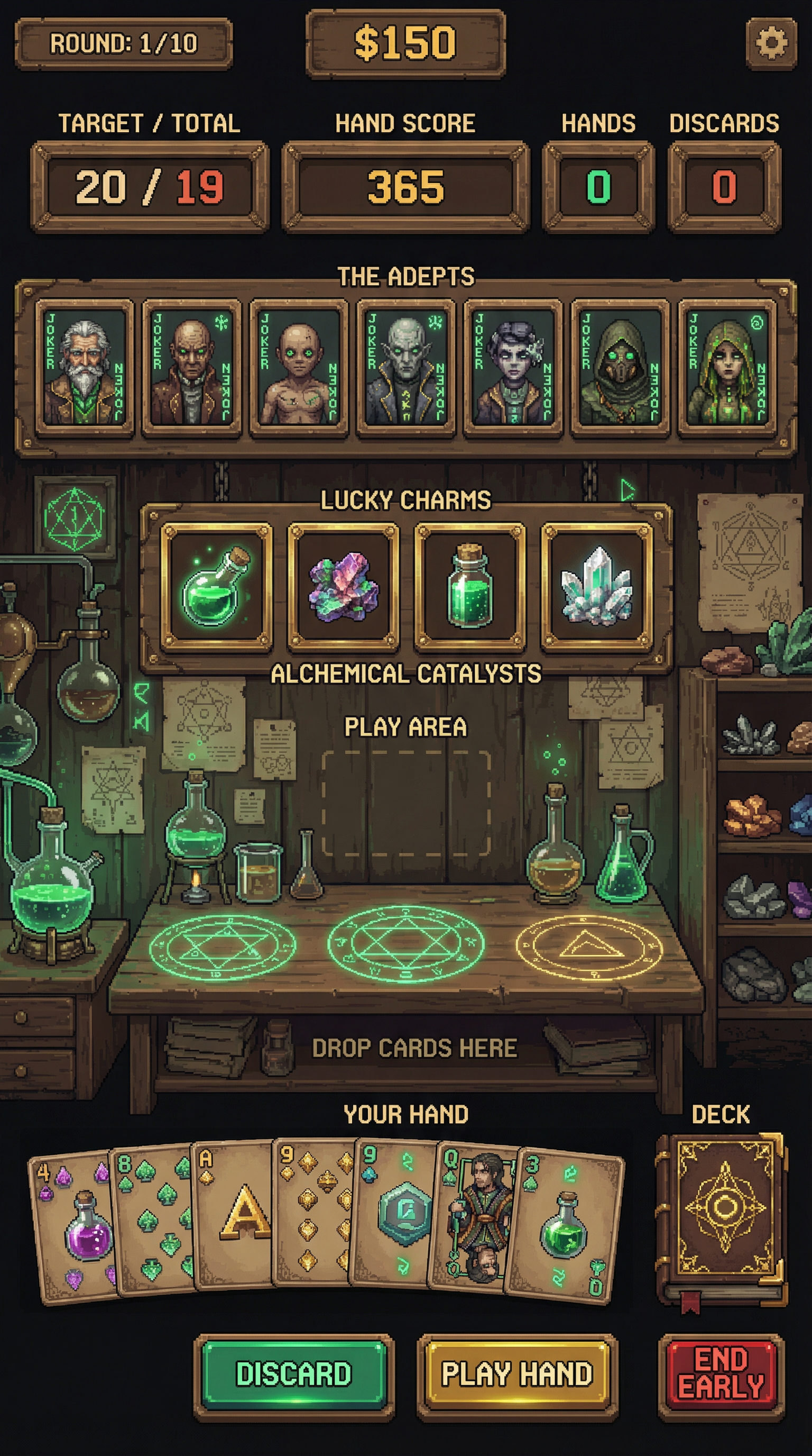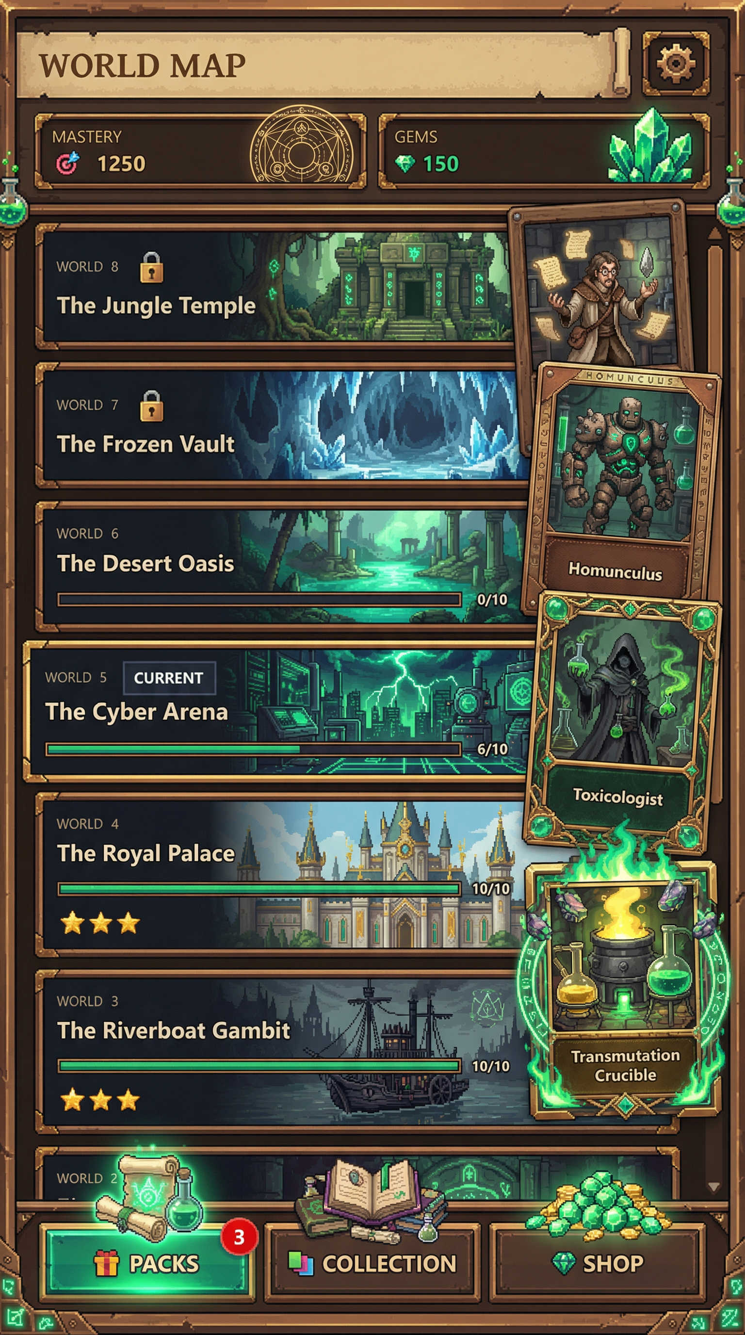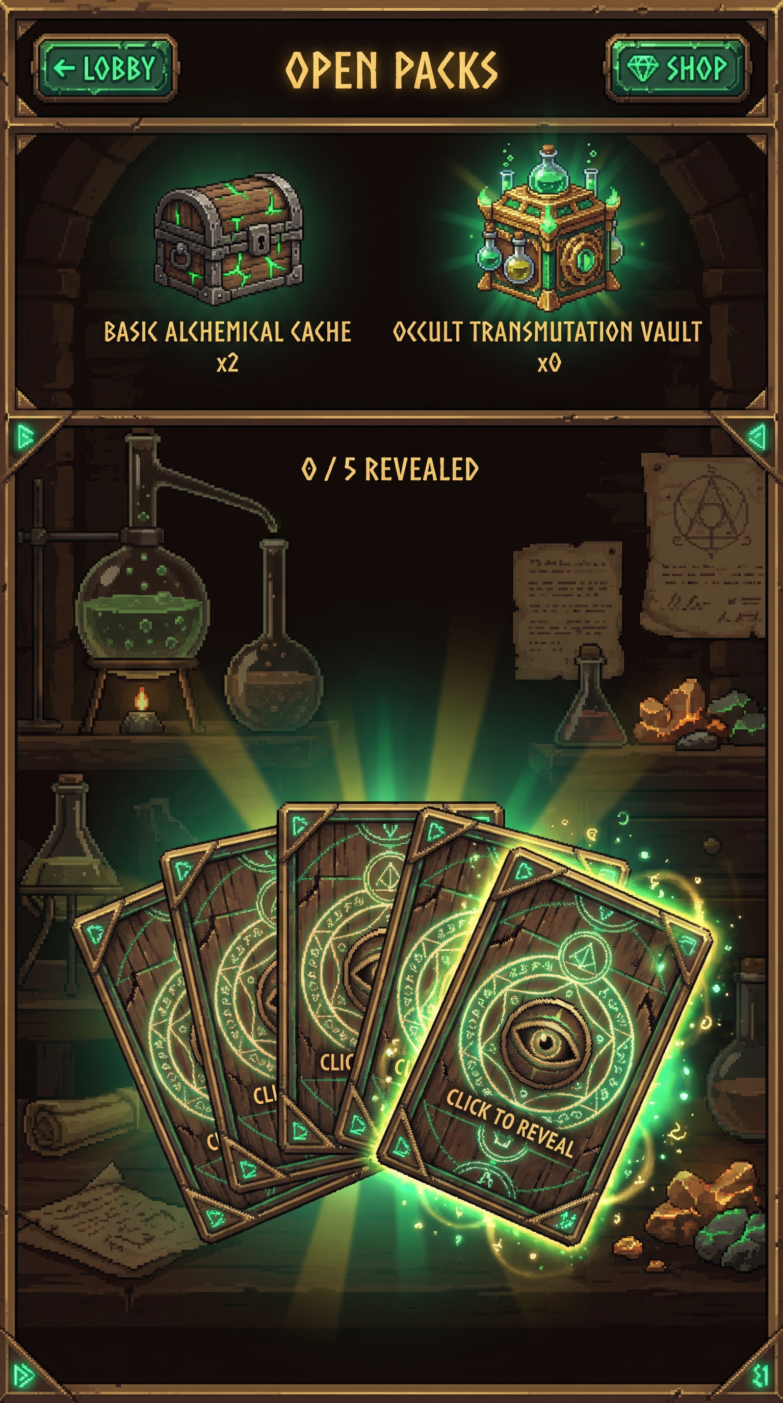 "Crisp, high-density 16-bit to 32-bit pixel art with meticulous manual dithering and pixel-perfect line work. Enhanced with modern rendering techniques including real-time dynamic bloom, volumetric lighting, and deep parallax layers. High-contrast, readable silhouettes specifically optimized for digital playing cards, floating icons, and retro-modern UI frames., - Concept: Secret Occult underground laboratory of a master alchemist seeking the Philosopher's Stone, forbidden science and elemental transmutation. - Palette: Sepia Brown & Shadowy Charcoal backgrounds vs Alchemical Emerald Green & Transmutation Gold highlights. - Materials & Elements: Scarred dark wood, glowing bubbling liquids, polished glass alembics, aged parchment, raw ores, glowing geometric runes. - Atmosphere: 'Forbidden Science'. Occult, scholarly, mystical, esoteric and highly atmospheric., [UI/UX LAYOUT] - Core Structure: Respect reference layout. Thick beveled frames, high relief (extruded 3D look). - Interactions: Clickable buttons require pronounced inner 'Alchemical Emerald Green' glow & high-saliency color fills. - Depth & Hierarchy: Aggressive Z-depth drop shadows between layers. Active foreground 40% brighter/more contrast than background. [CARD PROGRESSION MATRIX] Visual Complexity Ladder scaling linearly by rarity: - Common: 'Scarred dark wood' and crude iron. Minimalist execution, clean flat structural borders. No protruding elements. - Rare: Polished bronze & 'Sepia Brown' leather binding. Enhanced thematic detailing (etched geometric runes, subtle bubbling glass vials), double-tiered UI depth. - Epic: Premium 'Transmutation Gold' filigree. Complex structural design with embedded glowing emerald gems or miniature alembics in corners. - Legendary: Maximalist occult expression. High-impact motifs (bursting emerald flames, levitating raw bismuth ores, heavy glowing transmutation circles) physically breaking the rectangular silhouette (protruding 3D elements extending past borders)., [CONCEPT MAPPING] - Replace Jokers with THE ADEPTS: Master alchemists, occult scholars, and rune-carved homunculi. Encased in scarred dark wood and brass frames. - Replace Lucky Charms with ALCHEMICAL CATALYSTS: Tangible mystical ingredients (glowing glass vials of emerald liquid, raw bismuth ores, crystallized salts). - Replace Tarot with ESOTERIC SCROLLS: Heavy aged parchment unfurled, glowing geometric transmutation circles, cryptic ink calligraphy. - Replace Planet with TRANSMUTATION CRUCIBLES: Heavy iron athanors (alchemical furnaces) or oversized bubbling glass alembics radiating pure gold light. [THE ADEPTS - SAMPLES] 1. THE SCHOLAR (Specialist): Obsessive occultist in sepia robes, surrounded by floating, glowing parchment. Holding a raw shard of the Philosopher's Stone. Intense, manic pose. 2. THE HOMUNCULUS (Heavy): Towering artificial golem made of raw ores, clay, and iron bands. Deep 'Emerald Green' geometric runes carved into its chest. Immovable, protective pose. 3. THE TOXICOLOGIST (Assassin): Shadowy figure draped in charcoal cloaks. Swirling toxic green vapors leaking from delicate glass vials held in their hands. Cunning, lethal pose., Pack Tier Differentiation (Standard vs. Premium): * Standard Asset: Single-layer design. Clean, functional geometry with minimal articulation or ornamental points. Uses basic surface textures. * Premium Asset: Multi-layered, high-complexity design. Must feature "mechanical intrigue" elements (e.g., dual latches, deep relief, intricate security features, or ornate filigree). Value is communicated through detail density per pixel and structural sophistication, not physical scale. Card Arrangement (Face-down State): * A set of 5 vertical rectangles (Card Backs). * Dynamic "Fan-out" or "Semi-circle" arrangement to simulate physical depth and perspective on the 3D plane. Backlight Aura: A peripheral light plane (halo) hidden behind the card edges. The "Epic Glow" (Visual Lead): * An expansive radiance effect using dynamic particles and light halos that "leak" past the card’s closed silhouette."