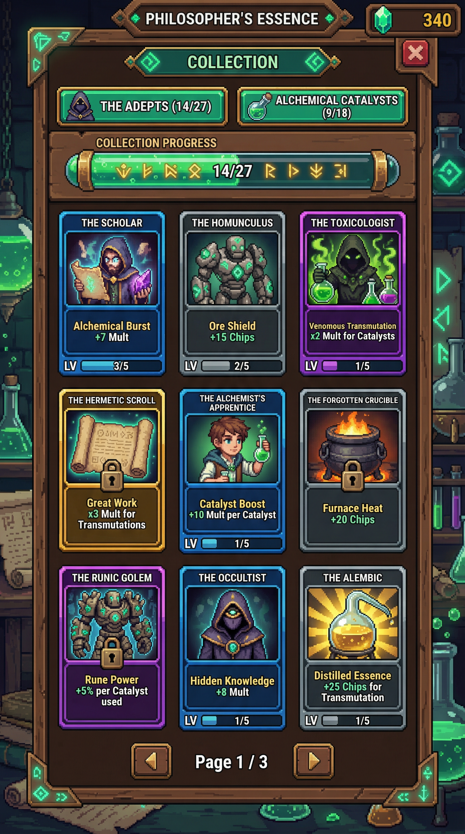 "Crisp, high-density 16-bit to 32-bit pixel art with meticulous manual dithering and pixel-perfect line work. Enhanced with modern rendering techniques including real-time dynamic bloom, volumetric lighting, and deep parallax layers. High-contrast, readable silhouettes specifically optimized for digital playing cards, floating icons, and retro-modern UI frames., - Concept: Secret Occult underground laboratory of a master alchemist seeking the Philosopher's Stone, forbidden science and elemental transmutation. - Palette: Sepia Brown & Shadowy Charcoal backgrounds vs Alchemical Emerald Green & Transmutation Gold highlights. - Materials & Elements: Scarred dark wood, glowing bubbling liquids, polished glass alembics, aged parchment, raw ores, glowing geometric runes. - Atmosphere: 'Forbidden Science'. Occult, scholarly, mystical, esoteric and highly atmospheric., [UI/UX LAYOUT] - Core Structure: Respect reference layout. Thick beveled frames, high relief (extruded 3D look). - Interactions: Clickable buttons require pronounced inner 'Alchemical Emerald Green' glow & high-saliency color fills. - Depth & Hierarchy: Aggressive Z-depth drop shadows between layers. Active foreground 40% brighter/more contrast than background. [CARD PROGRESSION MATRIX] Visual Complexity Ladder scaling linearly by rarity: - Common: 'Scarred dark wood' and crude iron. Minimalist execution, clean flat structural borders. No protruding elements. - Rare: Polished bronze & 'Sepia Brown' leather binding. Enhanced thematic detailing (etched geometric runes, subtle bubbling glass vials), double-tiered UI depth. - Epic: Premium 'Transmutation Gold' filigree. Complex structural design with embedded glowing emerald gems or miniature alembics in corners. - Legendary: Maximalist occult expression. High-impact motifs (bursting emerald flames, levitating raw bismuth ores, heavy glowing transmutation circles) physically breaking the rectangular silhouette (protruding 3D elements extending past borders)., [CONCEPT MAPPING] - Replace Jokers with THE ADEPTS: Master alchemists, occult scholars, and rune-carved homunculi. Encased in scarred dark wood and brass frames. - Replace Lucky Charms with ALCHEMICAL CATALYSTS: Tangible mystical ingredients (glowing glass vials of emerald liquid, raw bismuth ores, crystallized salts). - Replace Tarot with ESOTERIC SCROLLS: Heavy aged parchment unfurled, glowing geometric transmutation circles, cryptic ink calligraphy. - Replace Planet with TRANSMUTATION CRUCIBLES: Heavy iron athanors (alchemical furnaces) or oversized bubbling glass alembics radiating pure gold light. [THE ADEPTS - SAMPLES] 1. THE SCHOLAR (Specialist): Obsessive occultist in sepia robes, surrounded by floating, glowing parchment. Holding a raw shard of the Philosopher's Stone. Intense, manic pose. 2. THE HOMUNCULUS (Heavy): Towering artificial golem made of raw ores, clay, and iron bands. Deep 'Emerald Green' geometric runes carved into its chest. Immovable, protective pose. 3. THE TOXICOLOGIST (Assassin): Shadowy figure draped in charcoal cloaks. Swirling toxic green vapors leaking from delicate glass vials held in their hands. Cunning, lethal pose."