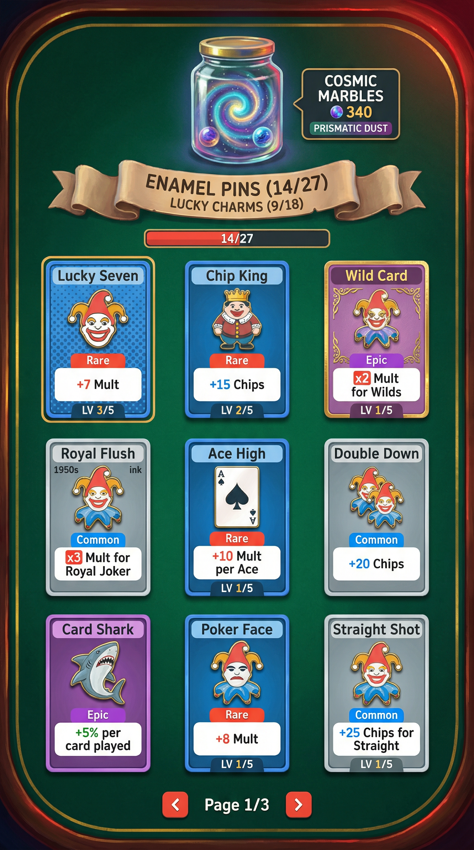 "Rich digital oil painting techniques with thick, expressive impasto brushstrokes and layered color blending. Soft, glowing ambient occlusion mixed with dramatic, saturated rim lighting. High-fidelity 2D fantasy rendering. Distinct, hand-crafted edge definition ensuring perfect readability for complex card illustrations and ornate UI frames.", - Context: Abstract high-stakes poker table with heavy center-stage spotlight focus. No digital containers. - Palette: Deep Emerald Green felt, Ivory Bone, Saturated Fabric-Red, and Electric Gold highlights. - Elements: Oversized poker chips, tactile betting buttons, luxury card decks, and lucky charms. - Atmosphere: Sophisticated, rhythmic, and high-energy gambling lounge vibe., [UI/UX LAYOUT] -Composition: No boxes. Floating organic clusters and curved fabric banners on emerald felt. Heavy ambient occlusion. -Depth: 'Ink-on-Acetate' layering. Foreground: +40% saturation vs muted Gouache background. -Interactions: 'Technicolor Gold' outlines & 'Enamel Red' fills. 'Ink-Bleed' edges for active assets. [CARD PROGRESSION MATRIX] - Common:Ivory cardstock, flat ink, minimalist 1950s aesthetic. No protrusions. - Rare: Ben-Day dots, misaligned offset-printing textures, double-inked borders. - Epic: Glossy enamel & gold foil. Embossed textures, Googie-style flourishes. - Legendary: Maximalist occult expression. High-impact motifs, [CONCEPT MAPPING] - Replace Jokers with ENAMEL PINS: Retro-styled badges and metal pins with rubber-hose character motifs. - LUCKY CHARMS: Abstract icons (clovers, dice) with thick, elastic outlines and vibrating motion. - Replace Tarot with ARCANA SCHEMATICS: Hand-inked vellum cards with glowing auras. - Replace COSMIC MARBLES: Hand-painted celestial glass spheres in jars. [SAMPLES] 1. ENAMEL PIN ""Joker"" (Speed): Grinning Jack motif; constantly jittering and bouncing on the spot. 2. ENAMEL PIN ""Joker"" (Power): Stout King motif; massive impact visual when it lands on the interface.", For Purchasable Cards: "Visual Hierarchy: Vertical card orientation divided into three functional zones. Primary Zone (60-70% height): A large, centered rectangular frame dedicated to the character portrait and character name. Rarity: A high-saliency badge or icon placeholder located in the top-right corner, integrated in the main portrait frame. Or different card frame per rarity of the card including integrating the badge. Rarity Color Scheme: Common: Grey. Rare: Blue. Epic: Purple. Legendary: Yellow-Orange, Golden Information Zone (25% height): A dedicated horizontal rectangular container at the bottom for ""Modifier Text"" and ""Effect Description"". Purchase Price. Cost for adquiring the card or pack. Item Type: A Tag that indicated the type of item we are purchasing. Z-Depth: Character portrait must overlap the top edge of its frame to create a pop-out effect." ------"