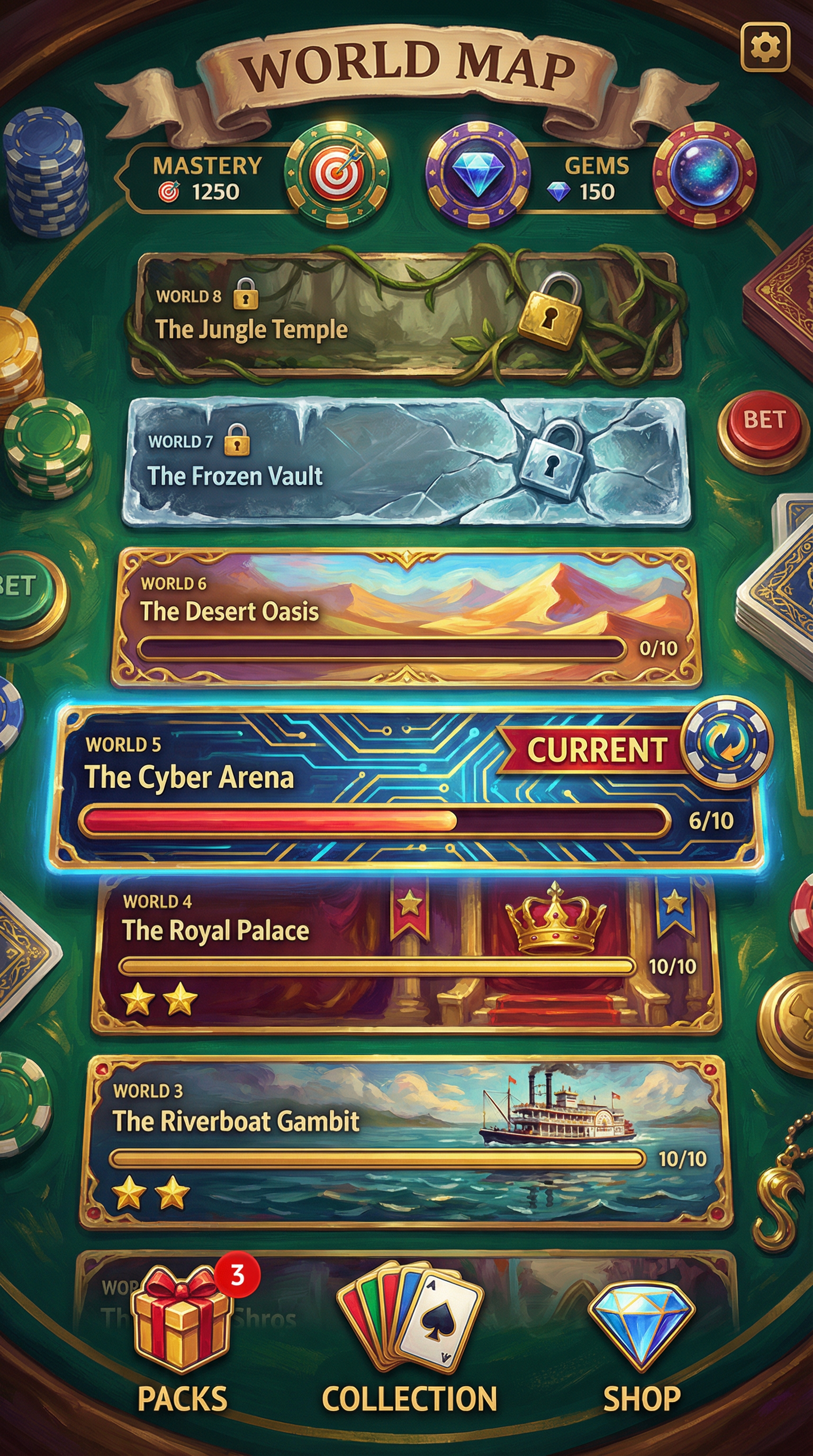 "Rich digital oil painting techniques with thick, expressive impasto brushstrokes and layered color blending. Soft, glowing ambient occlusion mixed with dramatic, saturated rim lighting. High-fidelity 2D fantasy rendering. Distinct, hand-crafted edge definition ensuring perfect readability for complex card illustrations and ornate UI frames.", - Context: Abstract high-stakes poker table with heavy center-stage spotlight focus. No digital containers. - Palette: Deep Emerald Green felt, Ivory Bone, Saturated Fabric-Red, and Electric Gold highlights. - Elements: Oversized poker chips, tactile betting buttons, luxury card decks, and lucky charms. - Atmosphere: Sophisticated, rhythmic, and high-energy gambling lounge vibe., [UI/UX LAYOUT] -Composition: No boxes. Floating organic clusters and curved fabric banners on emerald felt. Heavy ambient occlusion. -Depth: 'Ink-on-Acetate' layering. Foreground: +40% saturation vs muted Gouache background. -Interactions: 'Technicolor Gold' outlines & 'Enamel Red' fills. 'Ink-Bleed' edges for active assets. [CARD PROGRESSION MATRIX] - Common:Ivory cardstock, flat ink, minimalist 1950s aesthetic. No protrusions. - Rare: Ben-Day dots, misaligned offset-printing textures, double-inked borders. - Epic: Glossy enamel & gold foil. Embossed textures, Googie-style flourishes. - Legendary: Maximalist occult expression. High-impact motifs, [CONCEPT MAPPING] - Replace Jokers with ENAMEL PINS: Retro-styled badges and metal pins with rubber-hose character motifs. - LUCKY CHARMS: Abstract icons (clovers, dice) with thick, elastic outlines and vibrating motion. - Replace Tarot with ARCANA SCHEMATICS: Hand-inked vellum cards with glowing auras. - Replace COSMIC MARBLES: Hand-painted celestial glass spheres in jars. [SAMPLES] 1. ENAMEL PIN ""Joker"" (Speed): Grinning Jack motif; constantly jittering and bouncing on the spot. 2. ENAMEL PIN ""Joker"" (Power): Stout King motif; massive impact visual when it lands on the interface.", Pack Tier Differentiation (Standard vs. Premium): * Standard Asset: Single-layer design. Clean, functional geometry with minimal articulation or ornamental points. Uses basic surface textures. * Premium Asset: Multi-layered, high-complexity design. Must feature "mechanical intrigue" elements (e.g., dual latches, deep relief, intricate security features, or ornate filigree). Value is communicated through detail density per pixel and structural sophistication, not physical scale. Card Arrangement (Face-down State): * A set of 5 vertical rectangles (Card Backs). * Dynamic "Fan-out" or "Semi-circle" arrangement to simulate physical depth and perspective on the 3D plane. Backlight Aura: A peripheral light plane (halo) hidden behind the card edges. The "Epic Glow" (Visual Lead): * An expansive radiance effect using dynamic particles and light halos that "leak" past the card’s closed silhouette."