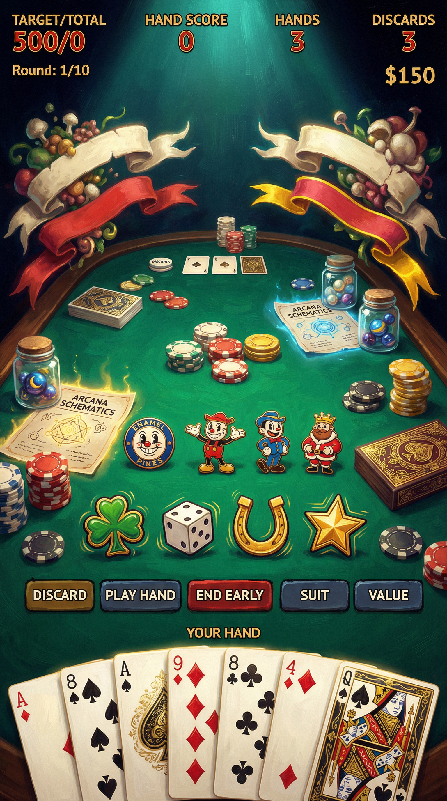 "Rich digital oil painting techniques with thick, expressive impasto brushstrokes and layered color blending. Soft, glowing ambient occlusion mixed with dramatic, saturated rim lighting. High-fidelity 2D fantasy rendering. Distinct, hand-crafted edge definition ensuring perfect readability for complex card illustrations and ornate UI frames.", - Context: Abstract high-stakes poker table with heavy center-stage spotlight focus. No digital containers. - Palette: Deep Emerald Green felt, Ivory Bone, Saturated Fabric-Red, and Electric Gold highlights. - Elements: Oversized poker chips, tactile betting buttons, luxury card decks, and lucky charms. - Atmosphere: Sophisticated, rhythmic, and high-energy gambling lounge vibe., [UI/UX LAYOUT] -Composition: No boxes. Floating organic clusters and curved fabric banners on emerald felt. Heavy ambient occlusion. -Depth: 'Ink-on-Acetate' layering. Foreground: +40% saturation vs muted Gouache background. -Interactions: 'Technicolor Gold' outlines & 'Enamel Red' fills. 'Ink-Bleed' edges for active assets. [CARD PROGRESSION MATRIX] - Common:Ivory cardstock, flat ink, minimalist 1950s aesthetic. No protrusions. - Rare: Ben-Day dots, misaligned offset-printing textures, double-inked borders. - Epic: Glossy enamel & gold foil. Embossed textures, Googie-style flourishes. - Legendary: Maximalist occult expression. High-impact motifs, [CONCEPT MAPPING] - Replace Jokers with ENAMEL PINS: Retro-styled badges and metal pins with rubber-hose character motifs. - LUCKY CHARMS: Abstract icons (clovers, dice) with thick, elastic outlines and vibrating motion. - Replace Tarot with ARCANA SCHEMATICS: Hand-inked vellum cards with glowing auras. - Replace COSMIC MARBLES: Hand-painted celestial glass spheres in jars. [SAMPLES] 1. ENAMEL PIN ""Joker"" (Speed): Grinning Jack motif; constantly jittering and bouncing on the spot. 2. ENAMEL PIN ""Joker"" (Power): Stout King motif; massive impact visual when it lands on the interface.""