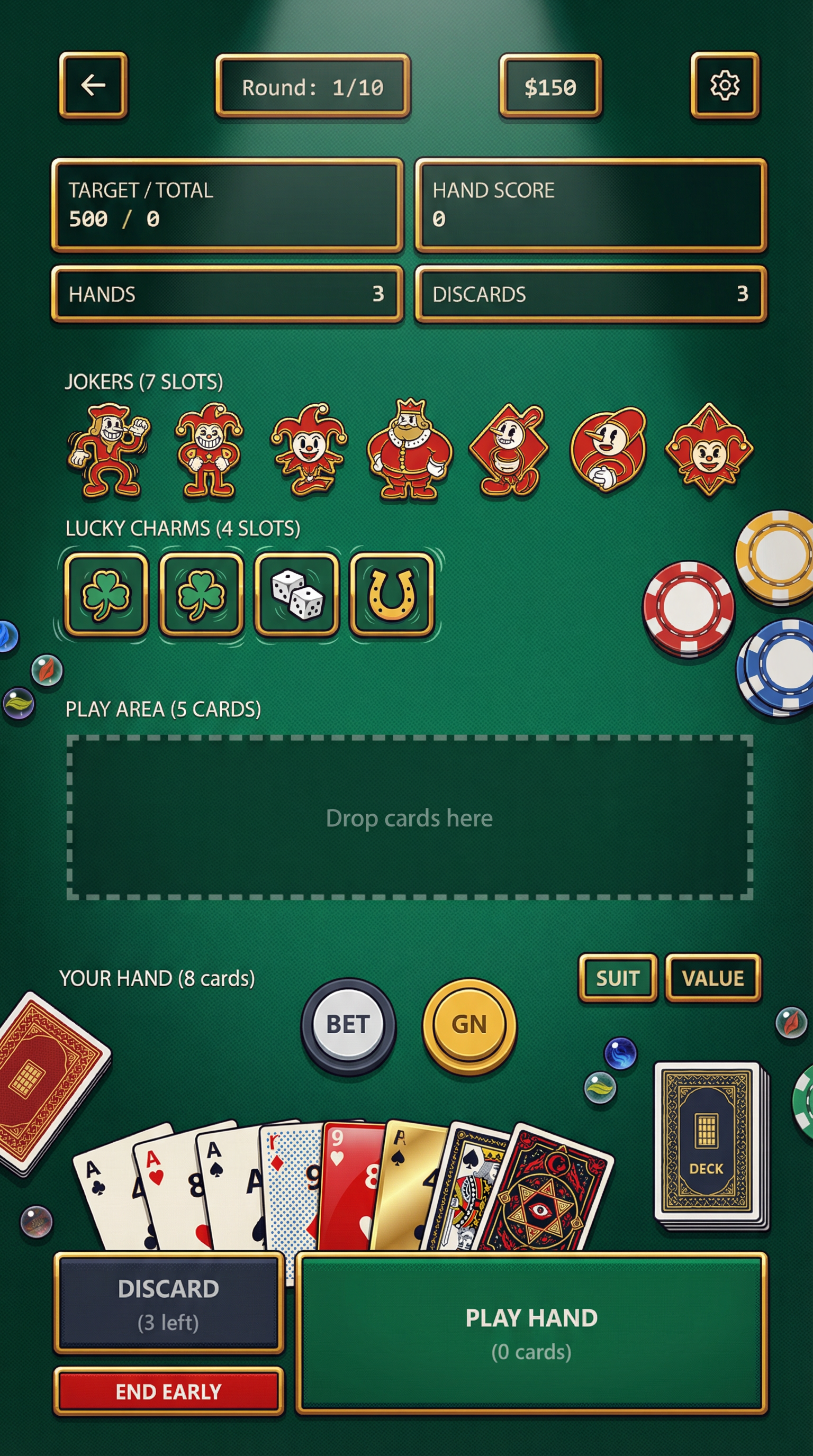 "High-fidelity 16-bit arcade rendering with Triple-Tone Beveling. Every interactive border must feature a 3-step color ramp (Highlight > Mid > Shadow) to simulate physical depth. Use Sub-pixel Speculars: isolated pure-white pixels on top-left corners to create a 'gold-leaf' reflection effect. Apply Dithered Gradients on large surfaces to avoid flat color blocks. All silhouettes must be crisp with a 1px dark 'inline' to separate assets from the background. Lighting: Fixed 45-degree top-down light source., - Context: Abstract high-stakes poker table with heavy center-stage spotlight focus. No digital containers. - Palette: Deep Emerald Green felt, Ivory Bone, Saturated Fabric-Red, and Electric Gold highlights. - Elements: Oversized poker chips, tactile betting buttons, luxury card decks, and lucky charms. - Atmosphere: Sophisticated, rhythmic, and high-energy gambling lounge vibe., [UI/UX LAYOUT] -Composition: No boxes. Floating organic clusters and curved fabric banners on emerald felt. Heavy ambient occlusion. -Depth: 'Ink-on-Acetate' layering. Foreground: +40% saturation vs muted Gouache background. -Interactions: 'Technicolor Gold' outlines & 'Enamel Red' fills. 'Ink-Bleed' edges for active assets. [CARD PROGRESSION MATRIX] - Common:Ivory cardstock, flat ink, minimalist 1950s aesthetic. No protrusions. - Rare: Ben-Day dots, misaligned offset-printing textures, double-inked borders. - Epic: Glossy enamel & gold foil. Embossed textures, Googie-style flourishes. - Legendary: Maximalist occult expression. High-impact motifs, [CONCEPT MAPPING] - Replace Jokers with ENAMEL PINS: Retro-styled badges and metal pins with rubber-hose character motifs. - LUCKY CHARMS: Abstract icons (clovers, dice) with thick, elastic outlines and vibrating motion. - Replace Tarot with ARCANA SCHEMATICS: Hand-inked vellum cards with glowing auras. - Replace COSMIC MARBLES: Hand-painted celestial glass spheres in jars. [SAMPLES] 1. ENAMEL PIN ""Joker"" (Speed): Grinning Jack motif; constantly jittering and bouncing on the spot. 2. ENAMEL PIN ""Joker"" (Power): Stout King motif; massive impact visual when it lands on the interface.""